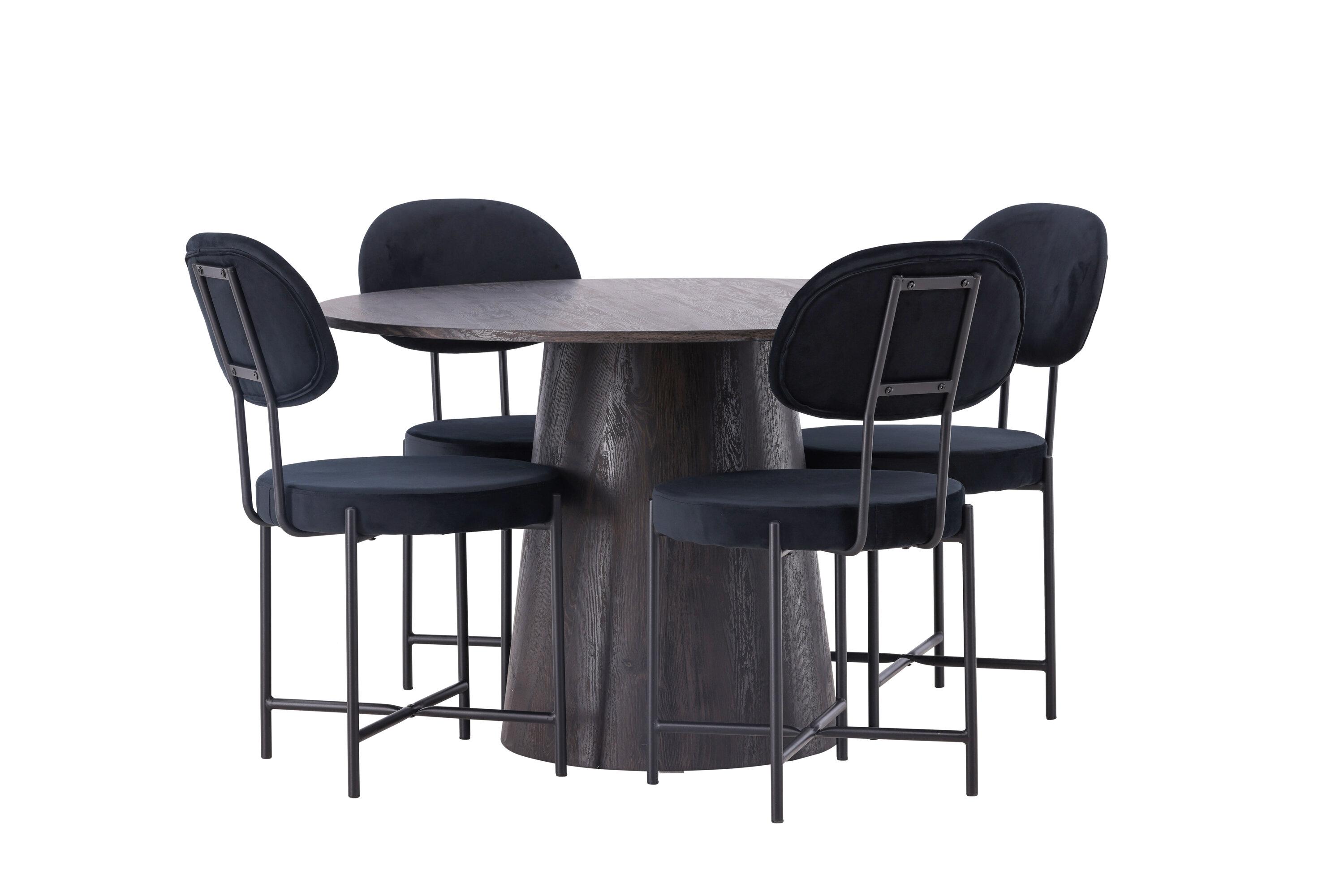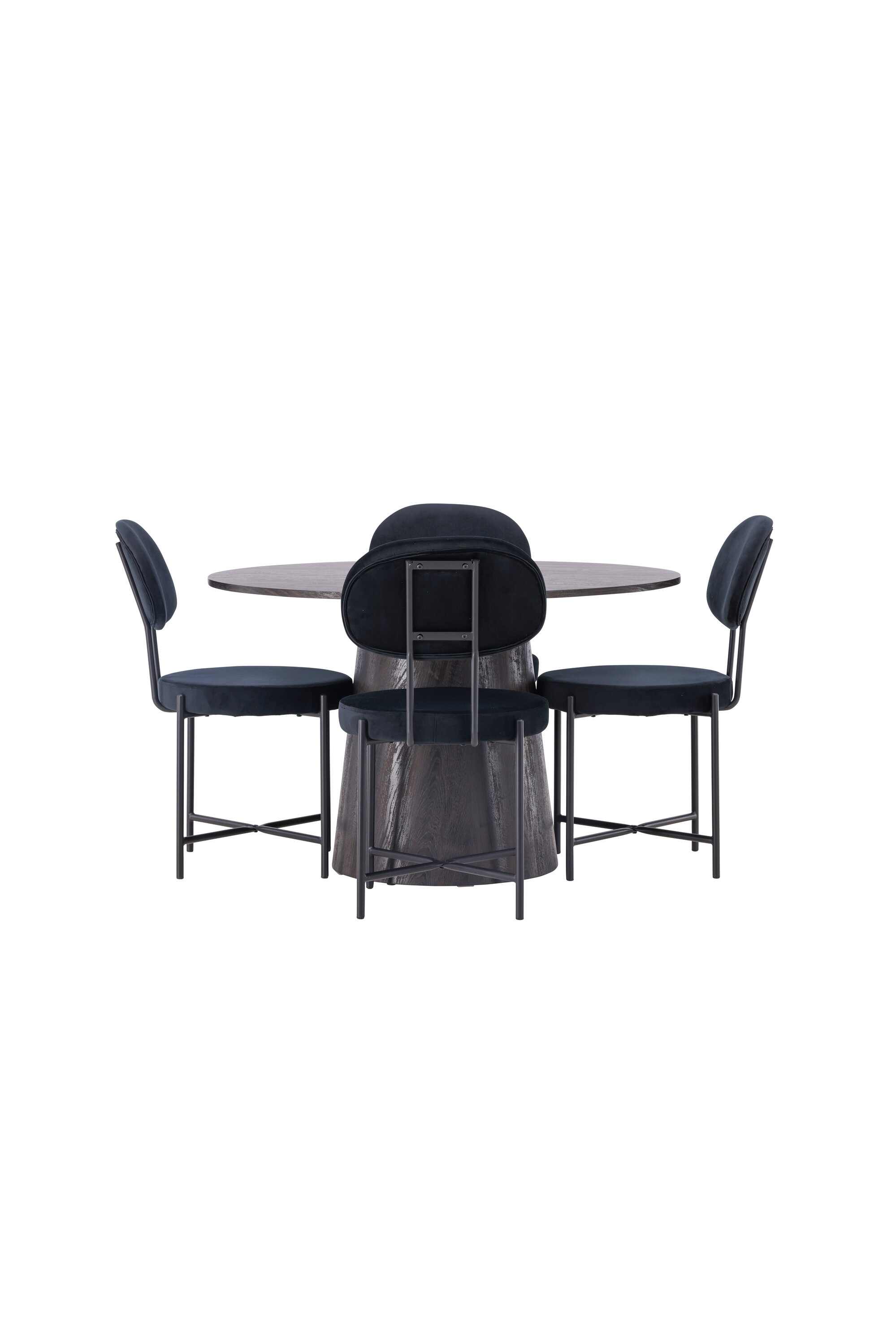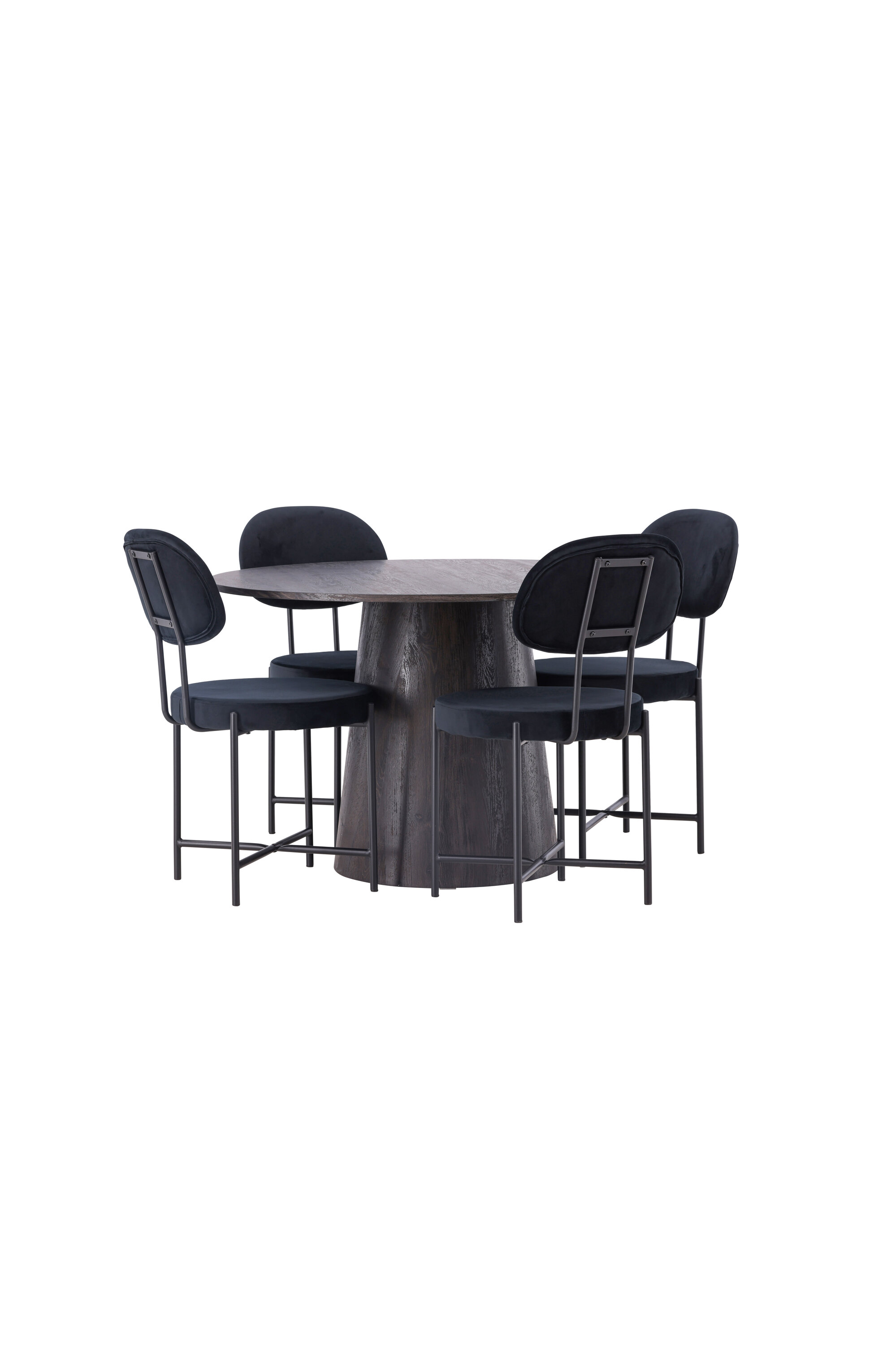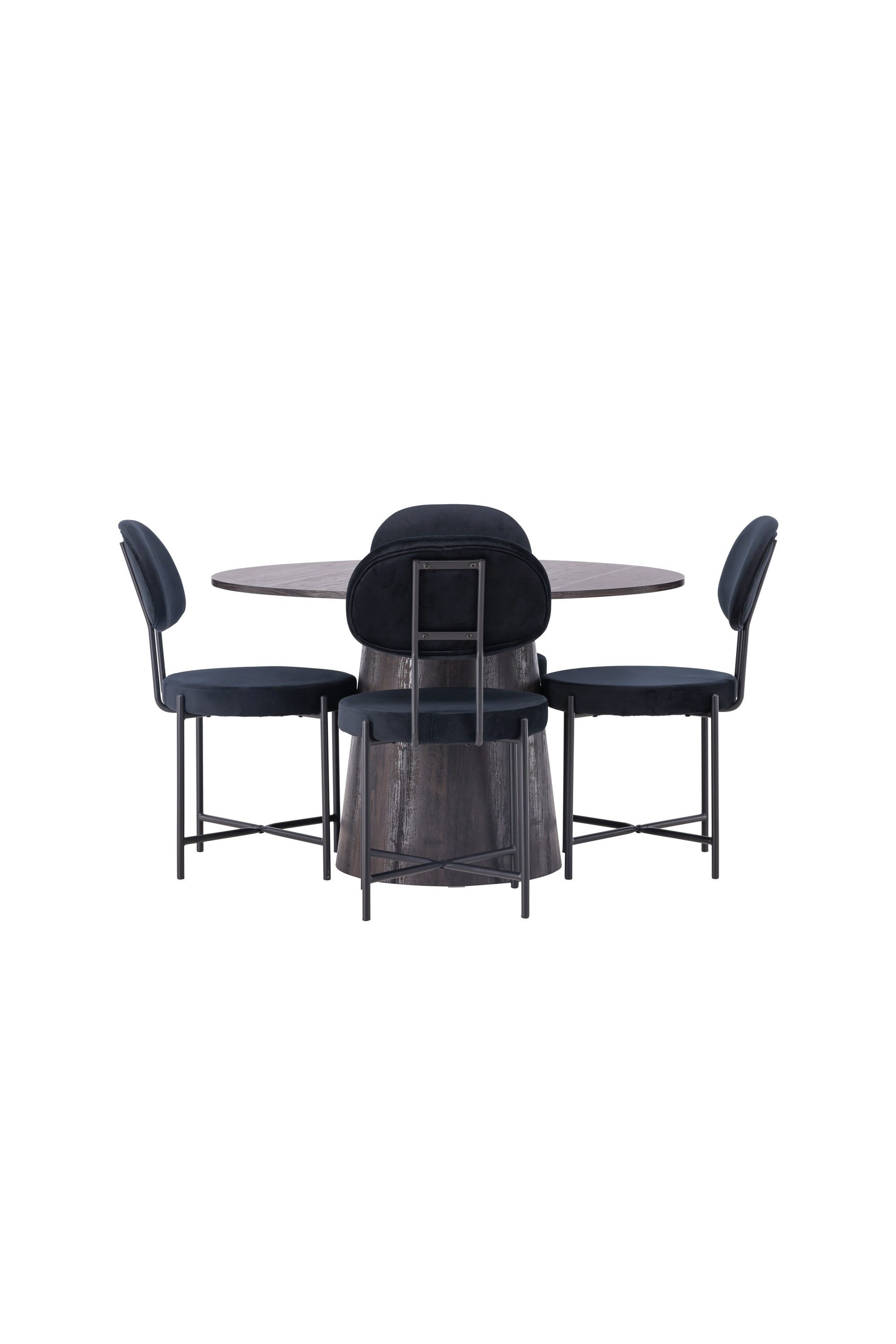 Ümmargused vormid loovad kutsuva atmosfääri! Meie imeline ümmargune söögilaud Lanzo on pruunist MDF-plaadist üldise disainiga, õhukese pealispinnaga ja keeratud silindrilise raamiga, mis asub laua keskosa all. siin koos meie Stella sarja luksuslike söögitoolidega. Toolil on trendikas skandinaavialik disain, millel on ümmargune iste ja tooli seljatugi mustast sametkangast ning minimalistlikud mustast terasest toolijalad. Istuge mugavalt – siin ei satu keegi äärele! Laua läbimõõt: 120 cm.