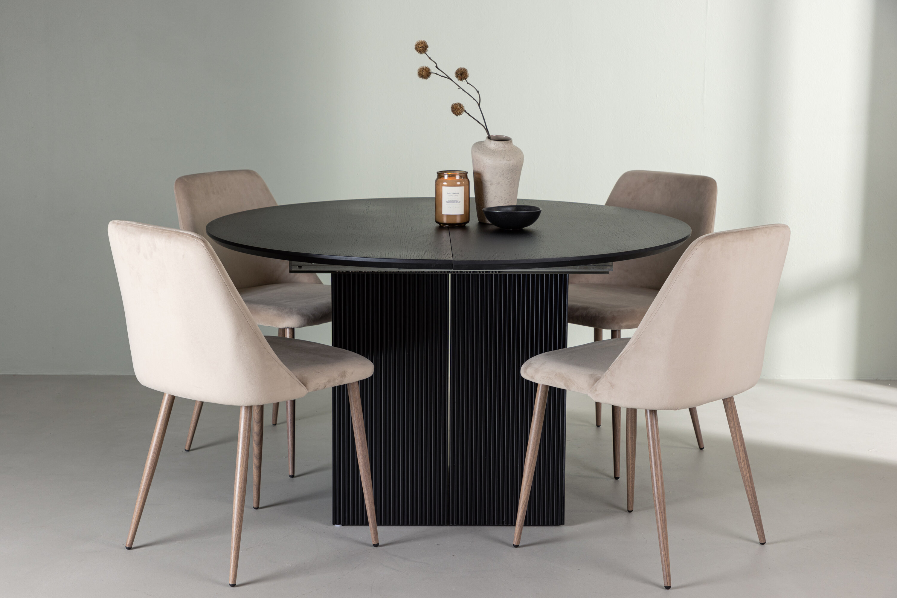 Meie ümmargune söögilaud Matilda on loodud ideaalselt teie vajadustele vastavaks. Mustast spooniga MDF-plaadist ümmargune ülaosa ja plokikujuliste jalgadega vastupidav raam lisab Matilda teie kodule stiilse ilme. Laud on pikendatav ja muutub kiiresti ovaalseks lauaks, kui teil on pere ja külalised. Laua läbimõõt on 130 cm.
