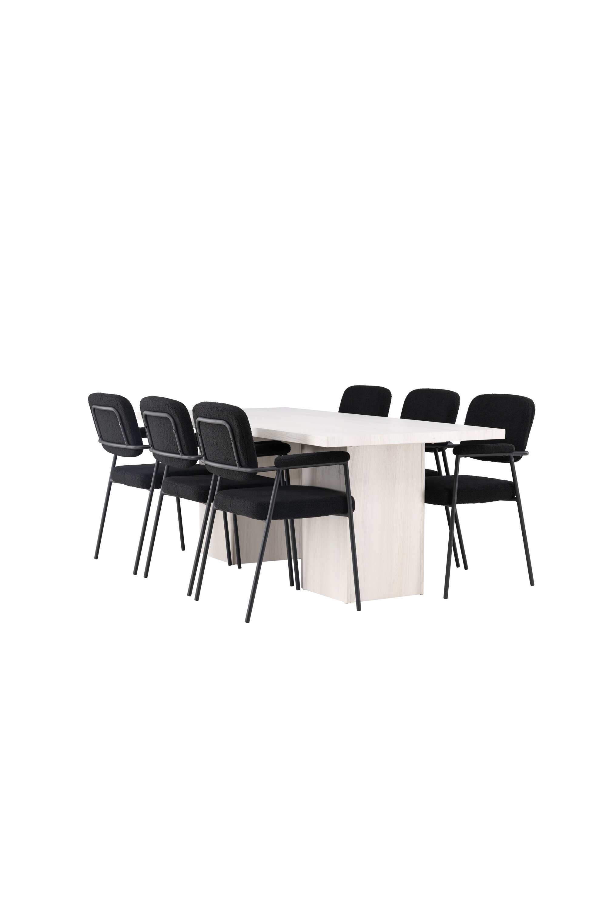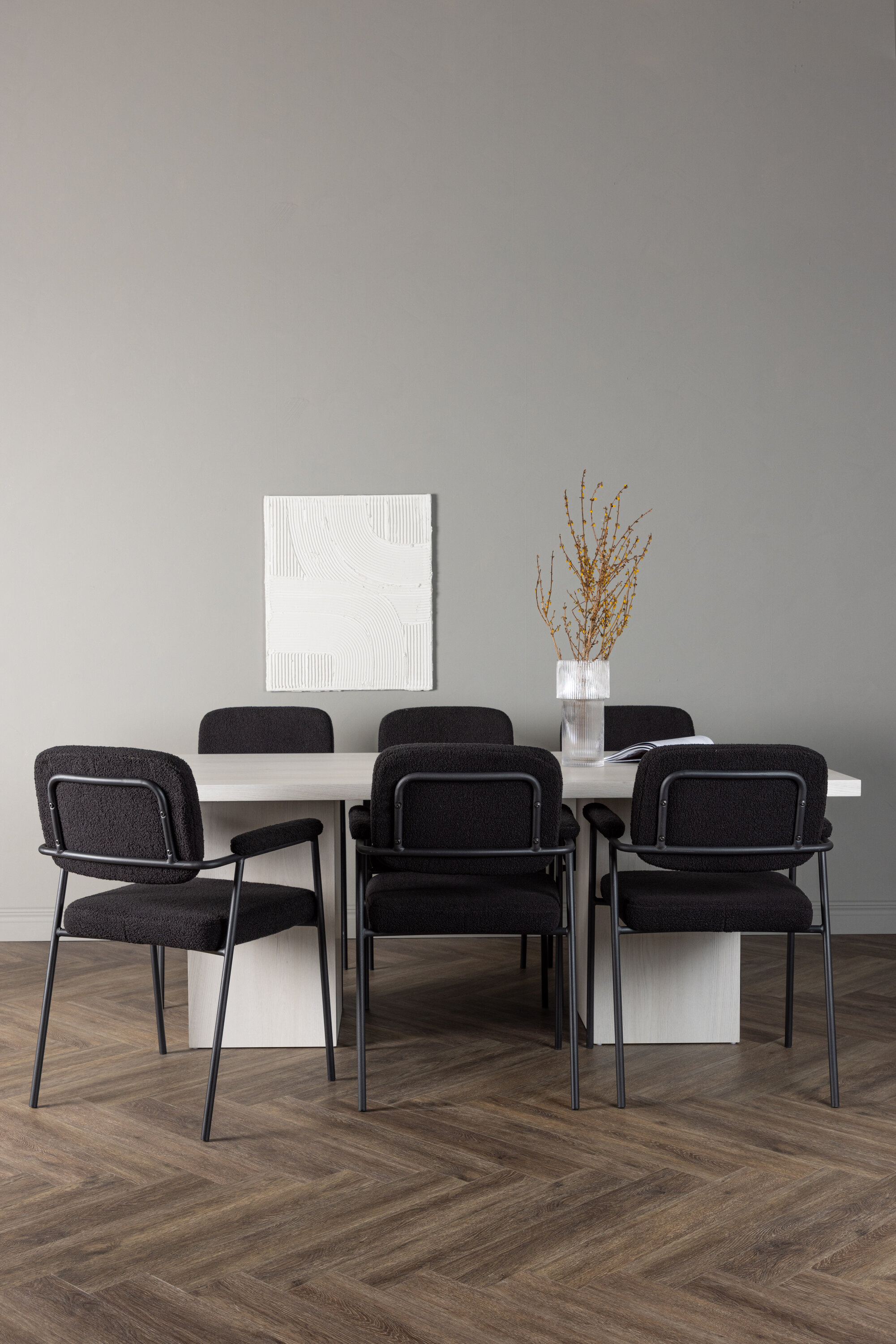 Täiendage seda fantastilist söögilauda meie Yesterday sarja mustade söögitoolidega. Tooli must bouclé kangas lisab peent puudutust ja tundub naha vastu imepehme. Selle õhukeste toolijalgade ja integreeritud mustast metallist käetugedega saate mitte ainult stiilse ja kaasaegse tooli, vaid ka täiendava mugavuse.