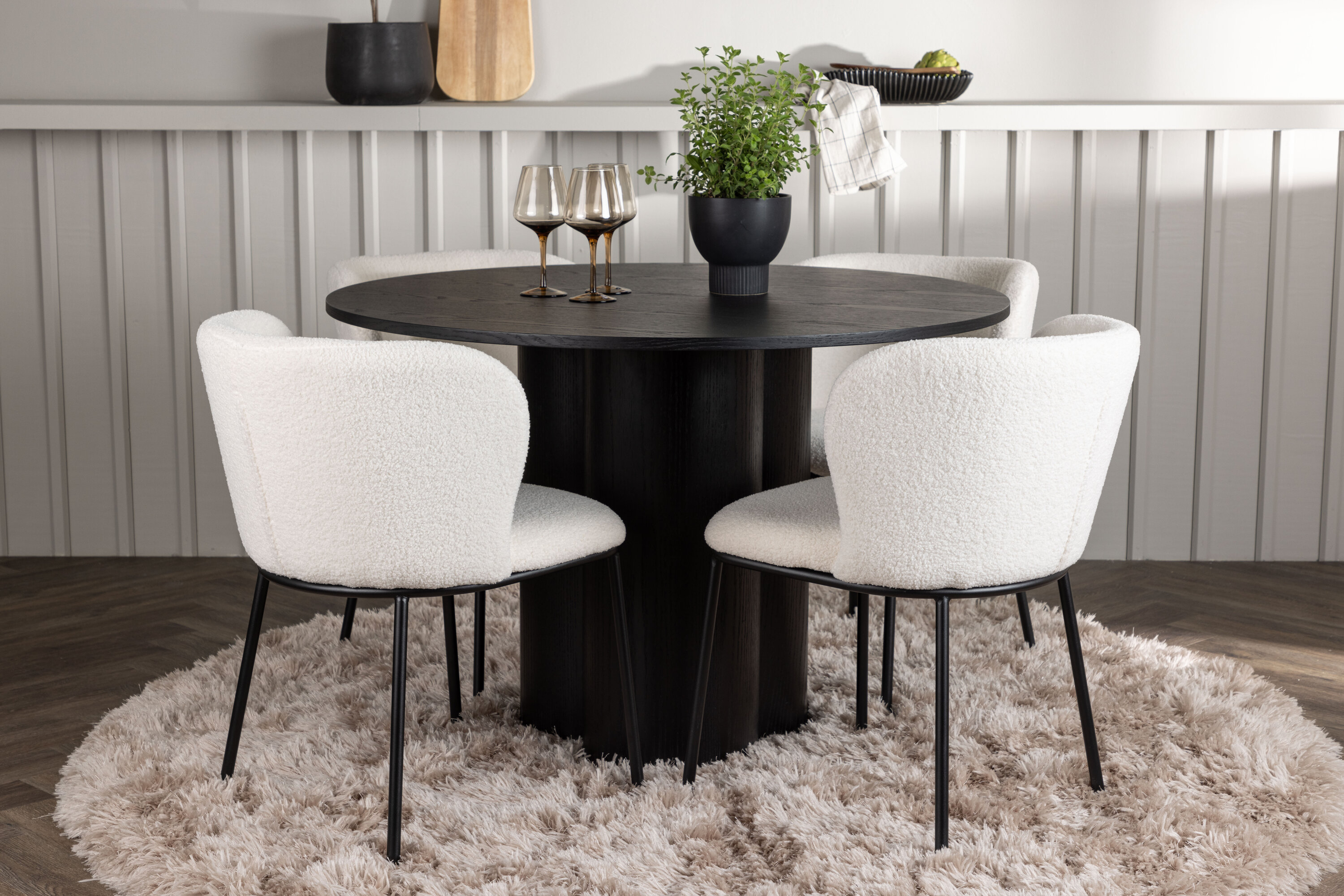 Siin on täiuslikus kombinatsioonis Edina sarja söögitoolid. Nendes toolides on ühendatud painduv ja täielikult polsterdatud valgest boucle kangast iste minimalistlike mustade metallist toolijalgadega. Stiilne disain pakub ajatut tunnet ja mugav iste tagab, et teie ja teie külalised saavad nautida pikki ja veetlevaid õhtusööke.