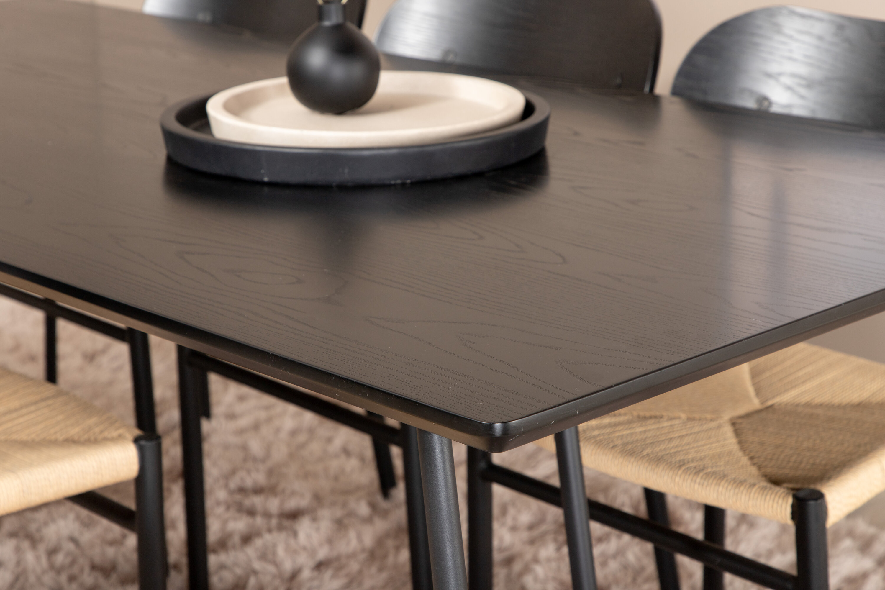 Trendikas toidugrupp, mis sobib suurepäraselt elutuppa! Söögilaud Petra on läbimõeldud disainiga Skandinaavia kujunditega, mis annab stiilse tunde, kitsad, kergelt laienevad rauast jalad ja lauaplaat mustast spooniga MDF-st. Laua mõõdud: pikkus: 190 cm, laius: 90 cm, kõrgus: 75 cm. Siin on ideaalne kombinatsioon 6 Polly seeria söögitooliga. Toolijalad on mustast metallist ja maitsvad naturaalset värvi istmed köites. Tooli mõõdud: kõrgus: 88 cm, istme kõrgus: 47 cm, laius: 42 cm, sügavus: 55 cm. Saagu sellest kaunilt kokkusobivast tänapäevase tunnetusega toidugrupist loomulik kogunemispaik teie kodus.