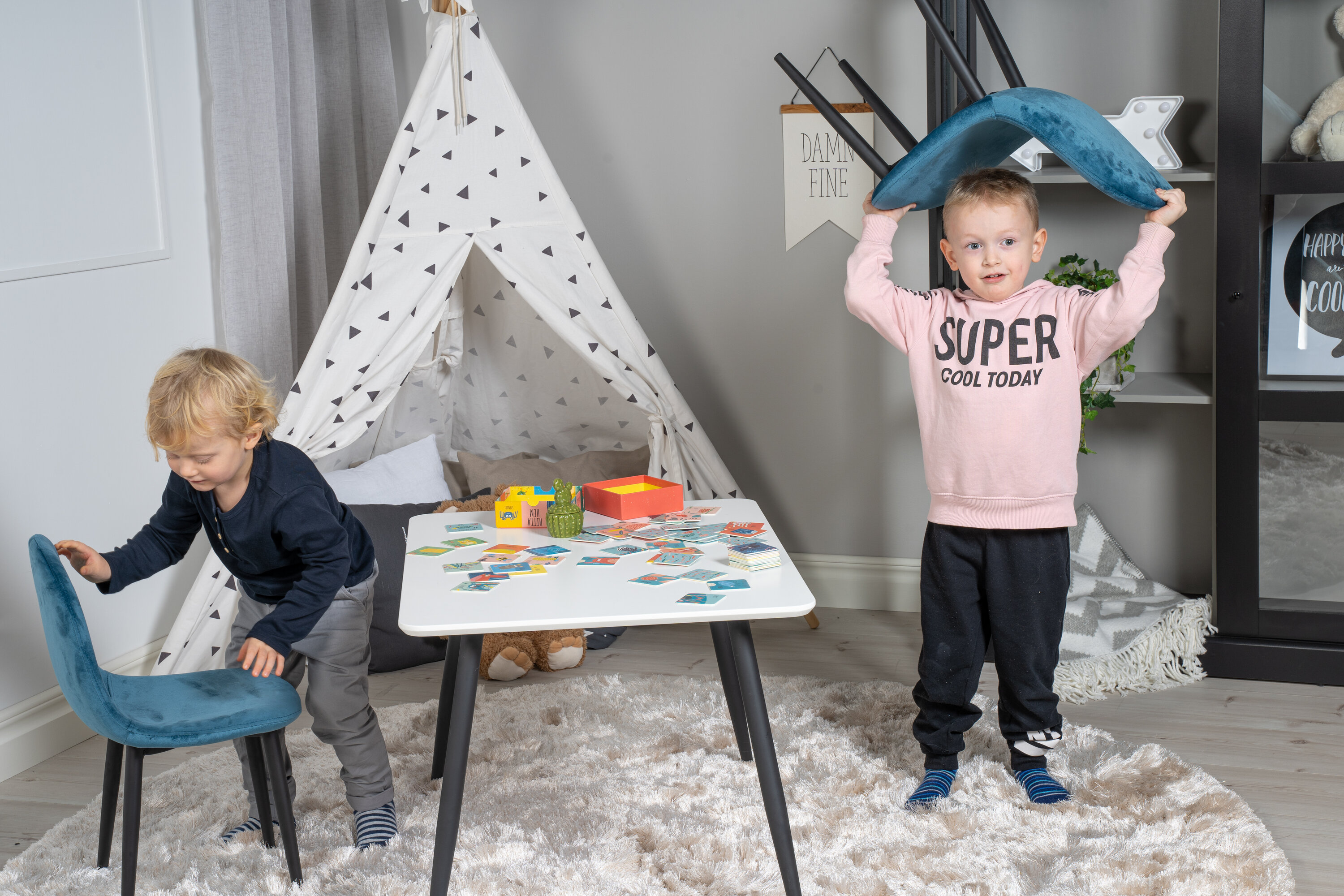 Väike, armas laud Polari peentes värvides, kohandatud lastele. Toolid firmalt Polar.