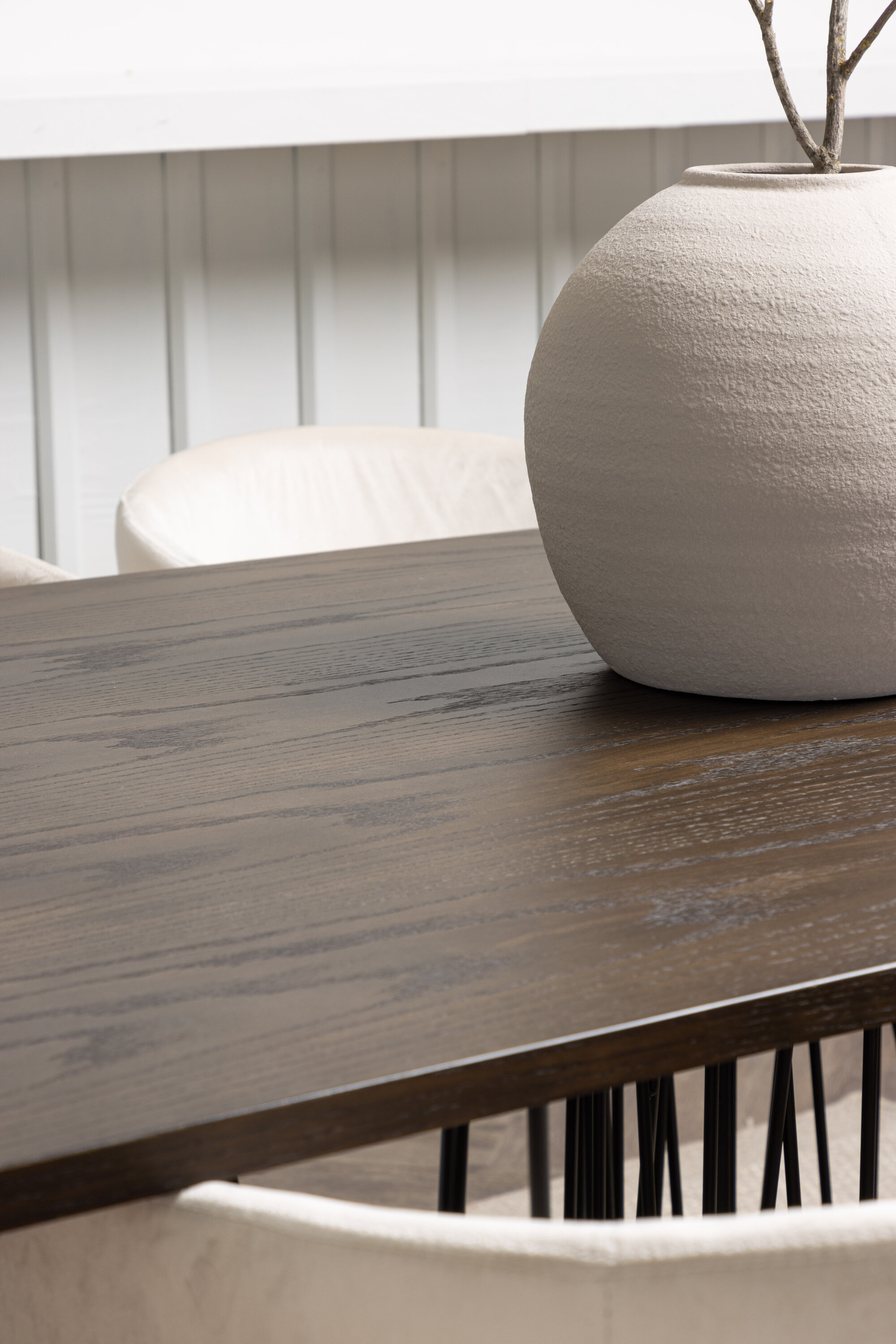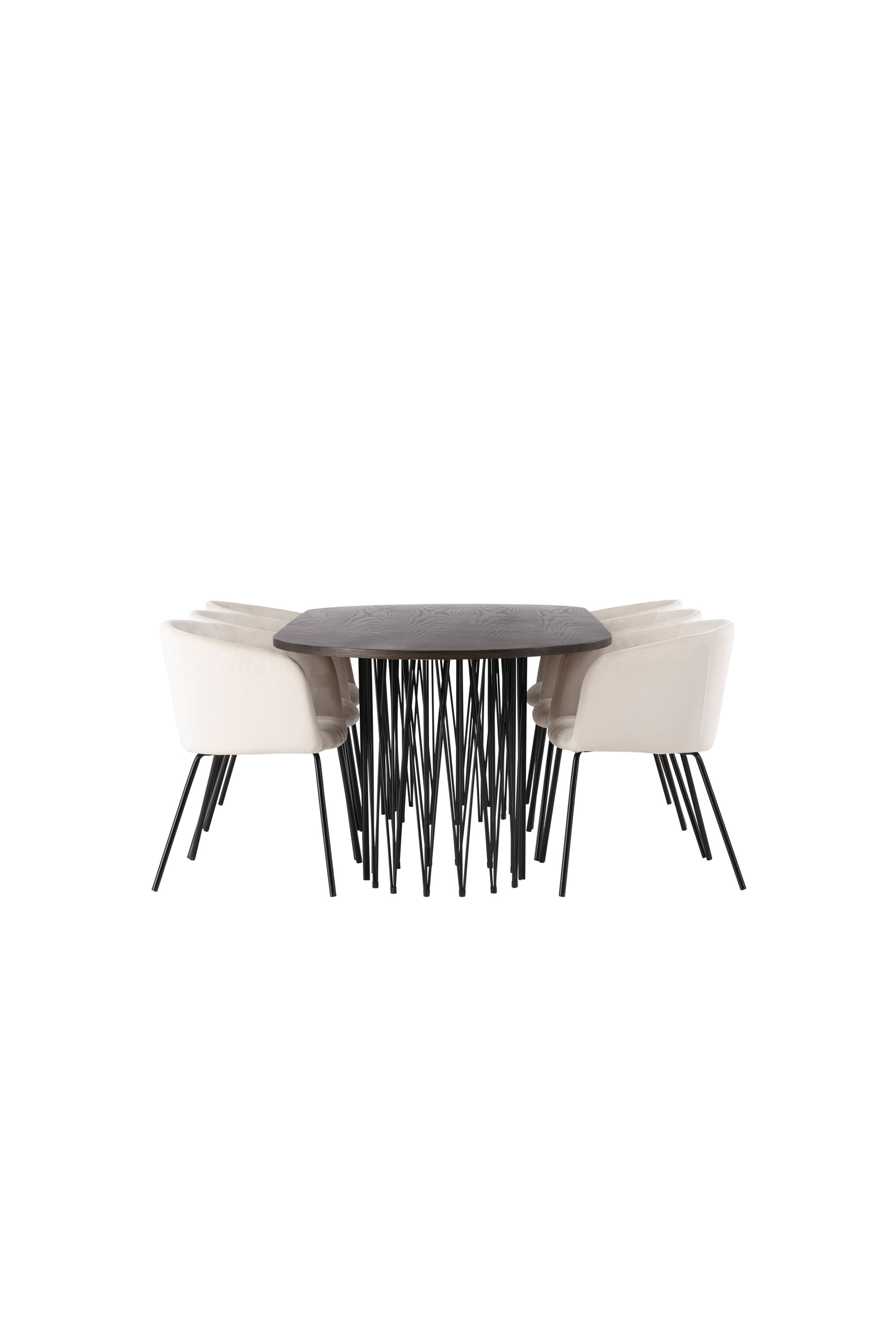 Särav ja värske! Meie ovaalne söögilaud Stone avaldab muljet oma moeteadliku disainiga. Laual on ilus pruuni värvi spooniga MDF lauaplaat ja kaks mustast metallist dekoratiivset silindrilist raami. Siin suurepärases kombinatsioonis meie mugavate Berit söögitoolidega. Toolil on täielikult polsterdatud disain, millel on veidi ümardatud seljatugi ja iste beežist sametkangast ning kitsad mustast rauast jalad. See söögigrupp on täiesti trendidega kooskõlas! Laua mõõdud: 220x100cm.