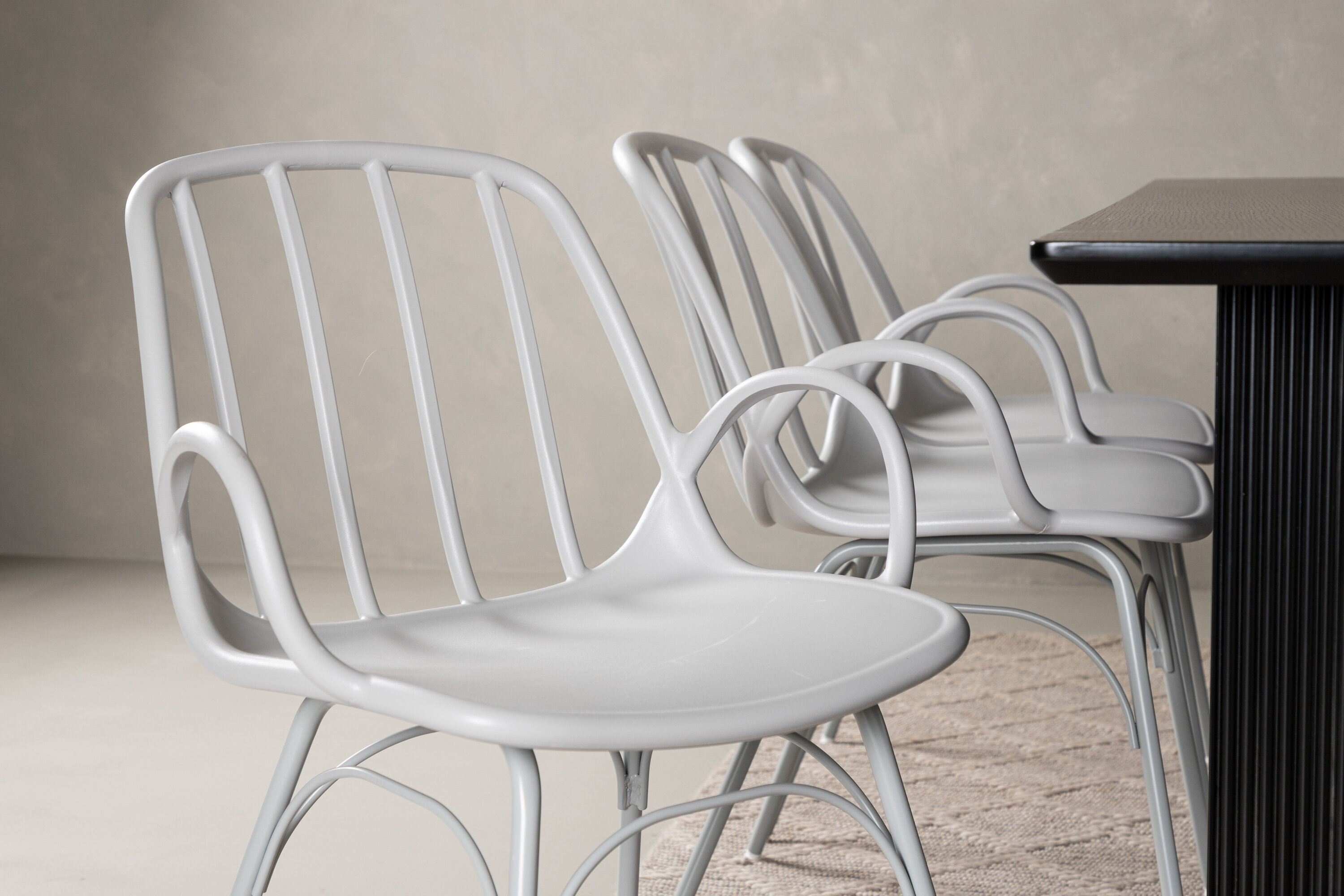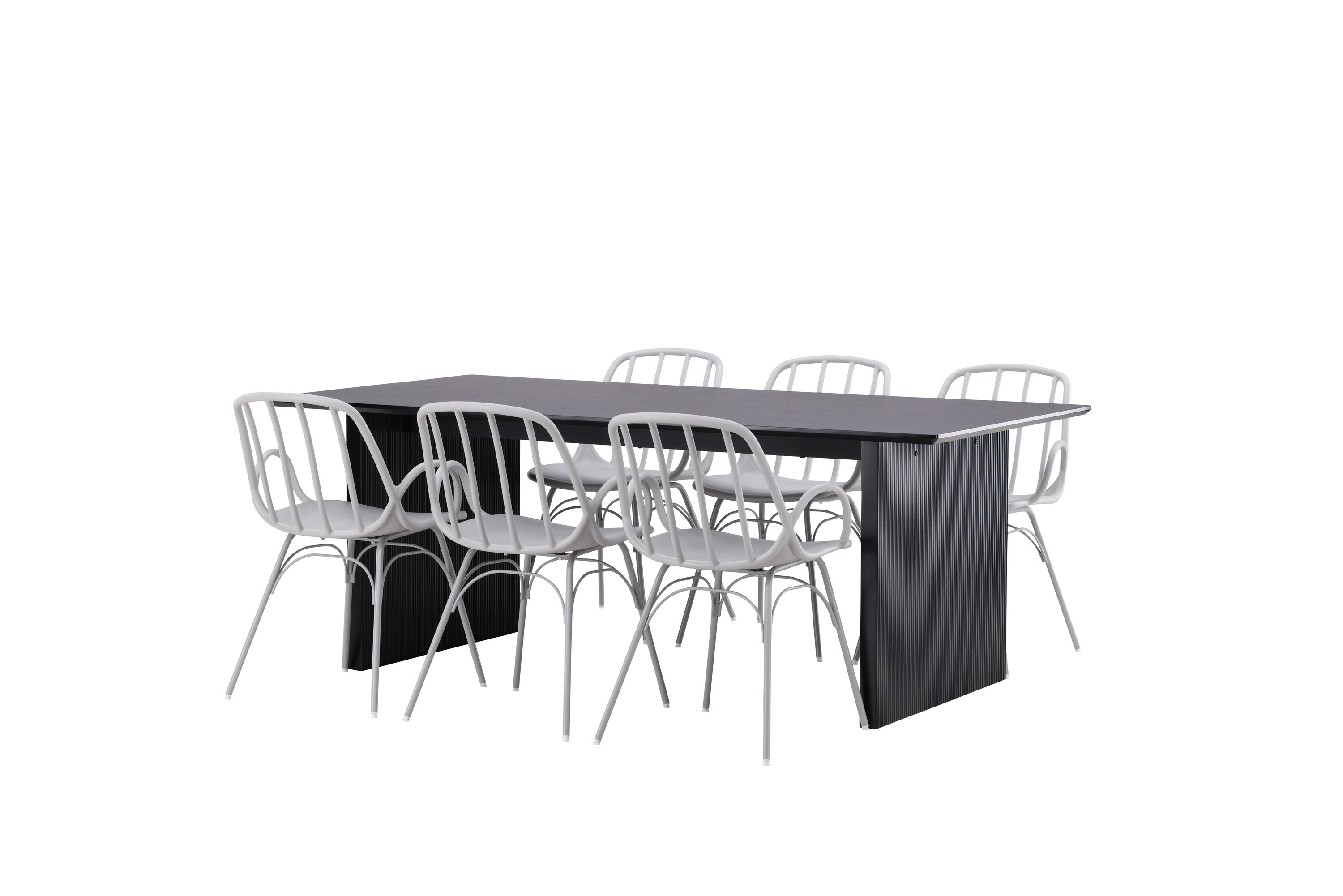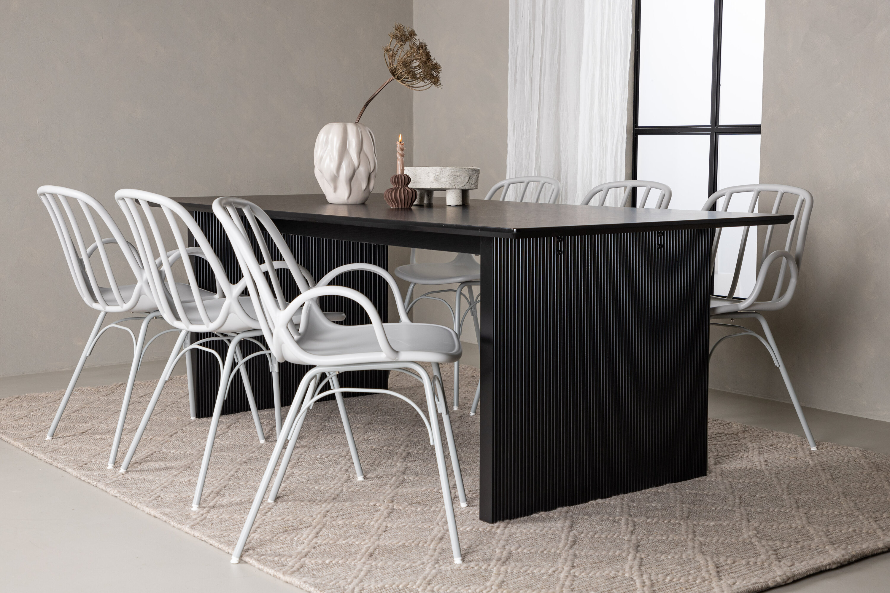 Sisusta stiilselt ja kaasaegselt koos ajaproovile vastu pidanud söögigrupiga! Vail söögilauad on sirgete põhjamaiste vormidega ja valmistatud vastupidavast mustast MDF-ist – nii stiilne kui praktiline. Lauaplaat on õhuke ristkülikukujulise disainiga ja balansseerib kahe tugeva puitlauaga, mis moodustavad veermiku. See sobib ideaalselt meie kaasaegsete Dyrön seeria söögitoolidega. Tool on nii stiilne kui ka praktiline, valmistatud greige plastikust ja terasest. Toolil on integreeritud käetoed ja kergelt ümardatud seljatoe soonik. Kutsuge oma külalisi mitmeks seltskondlikuks hetkeks külla!