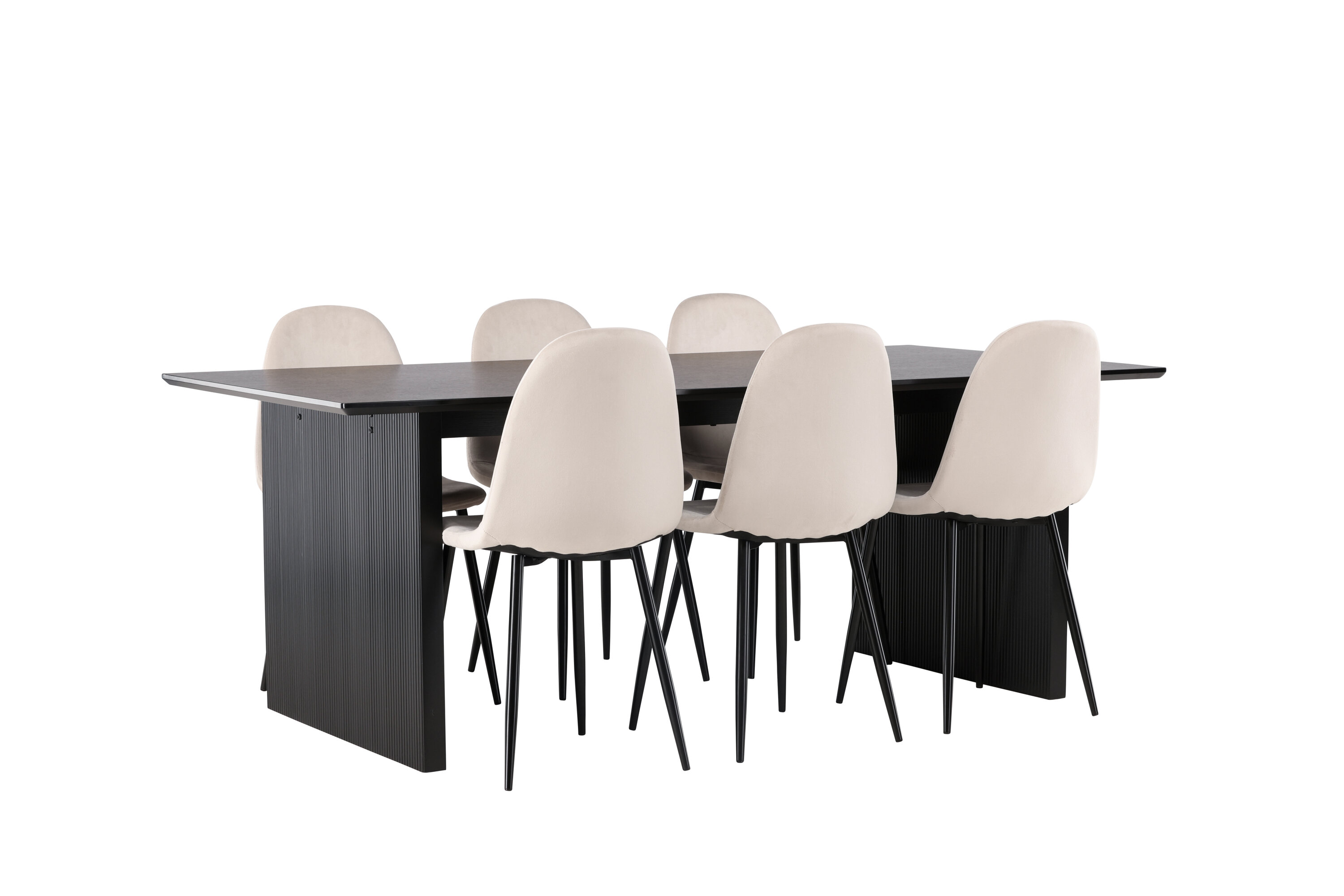 Elegantne ja särav söögigrupp! Ristkülikukujuline söögilaud Vail on sirgete põhjamaiste vormidega ja valmistatud vastupidavast tahmast musta värvi MDF-ist. Lauaplaat on õhuke ristkülikukujulise disainiga ja balansseerib kahe tugeva puitlauaga, mis moodustavad aluse. Siin koos meie suurepäraste söögitoolidega Polar. See täielikult polsterdatud disainiga söögitool, millel on kergelt ümar seljatugi ja sametkangast iste ja musta pulbervärvitud metallist jalad, on sama mugav kui ka pilkupüüdev. Särav värv soojendab tõeliselt atmosfääri! Laua mõõdud: 200x100cm.