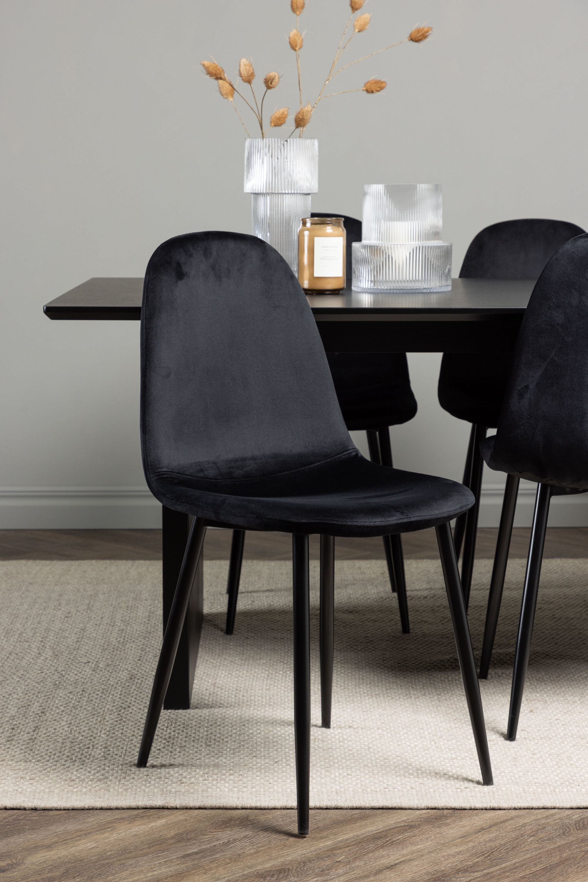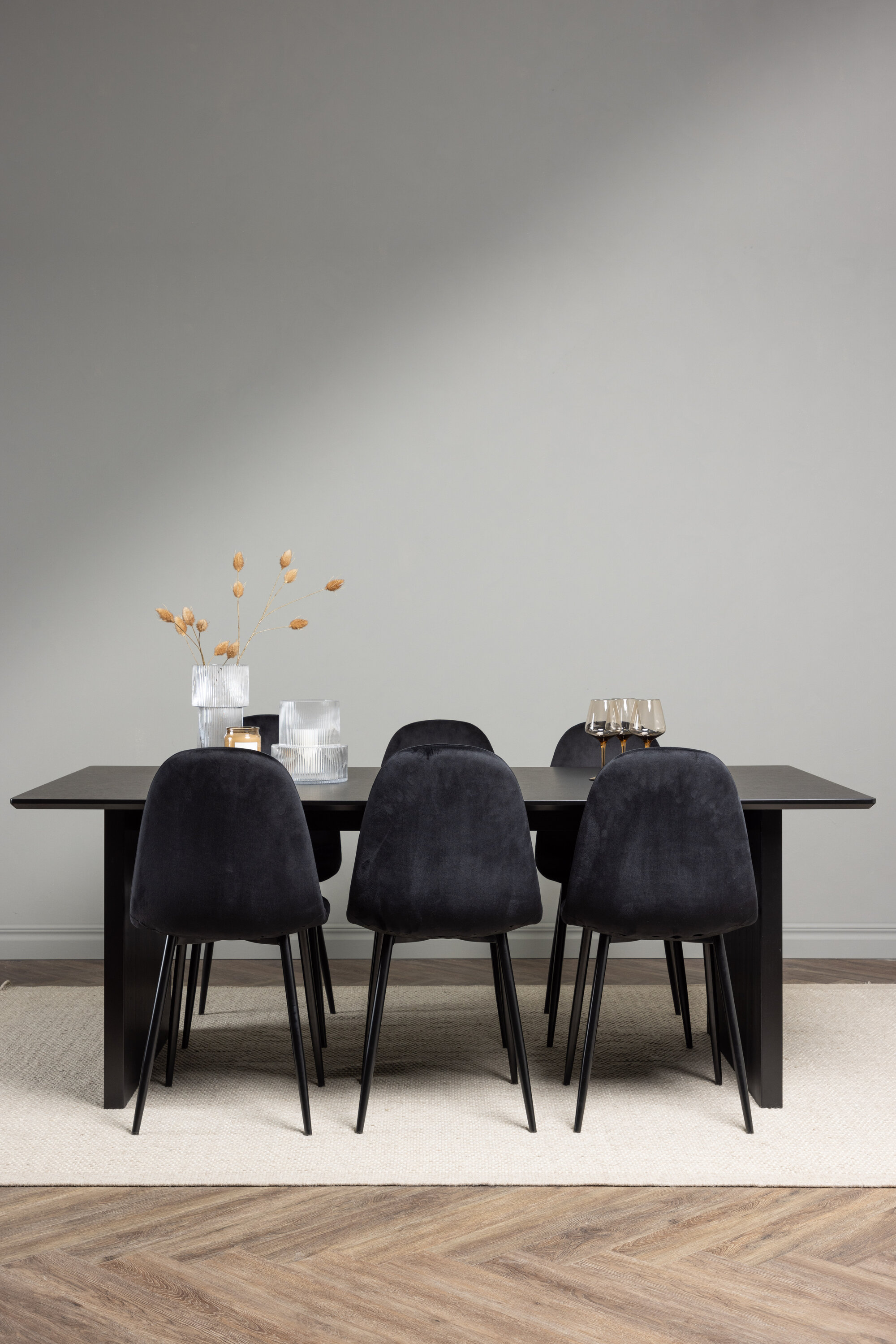 Tahmmust, stiilne ja elegantne söögigrupp! Ristkülikukujuline söögilaud Vail on sirgete põhjamaiste vormidega ja valmistatud vastupidavast musta värvi MDF-ist. Lauaplaat on õhuke ristkülikukujulise disainiga ja balansseerib kahe tugeva puitlauaga, mis moodustavad aluse. Siin stiilne kombinatsioon Polari sarja mustade söögitoolidega. Toolil on täielikult polsterdatud disain, jalad on mustast pulbervärvitud metallist ning ümar seljatugi ja iste on mustast sametkangast pehme polstriga. Muutke argipäev peoks koos luksusliku söögigrupiga! Laua mõõdud: 200x100cm.