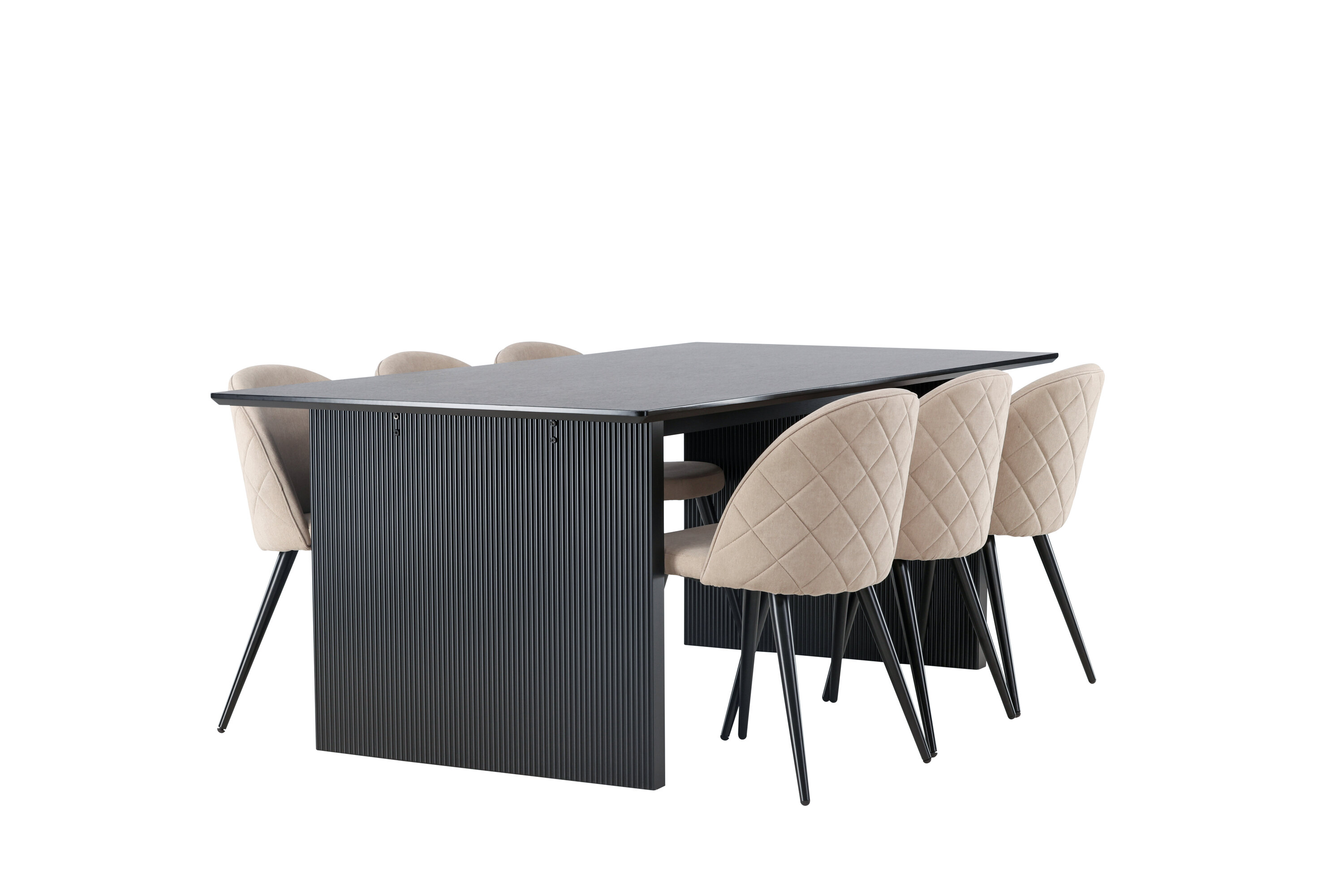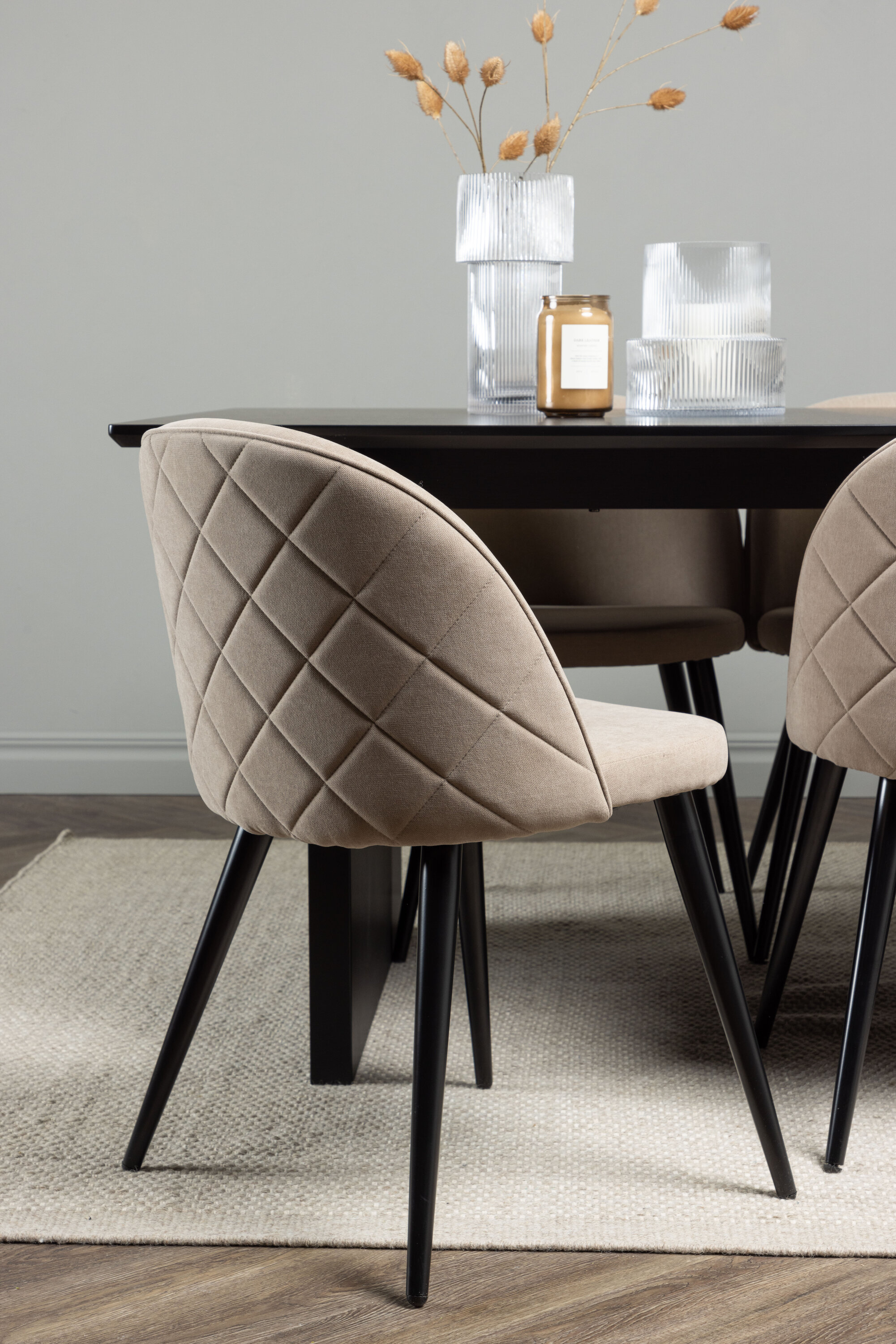 Armas kombinatsioon kaasaegsest disainist ja klassikalistest vormidest! Ristkülikukujuline söögilaud Vail on sirgete põhjamaiste vormidega ja valmistatud vastupidavast tahmast musta värvi MDF-ist. Lauaplaat on õhuke ristkülikukujulise disainiga ja balansseerib kahe tugeva puitlauaga, mis moodustavad aluse. Siin trendikas kombinatsioonis Velvet Stitches sarja söögitoolidega. Tooli seljatugi on ümar ja nagu iste, on see pehmelt polsterdatud beeži polüsterlinaga, millel on dekoratiivsed dekoratiivsed õmblused ja malelaua muster seljatoel. Jalad on mustast rauast veidi laienenud. Sisusta elutuba pidulikult! Laua mõõdud: 200x100cm.