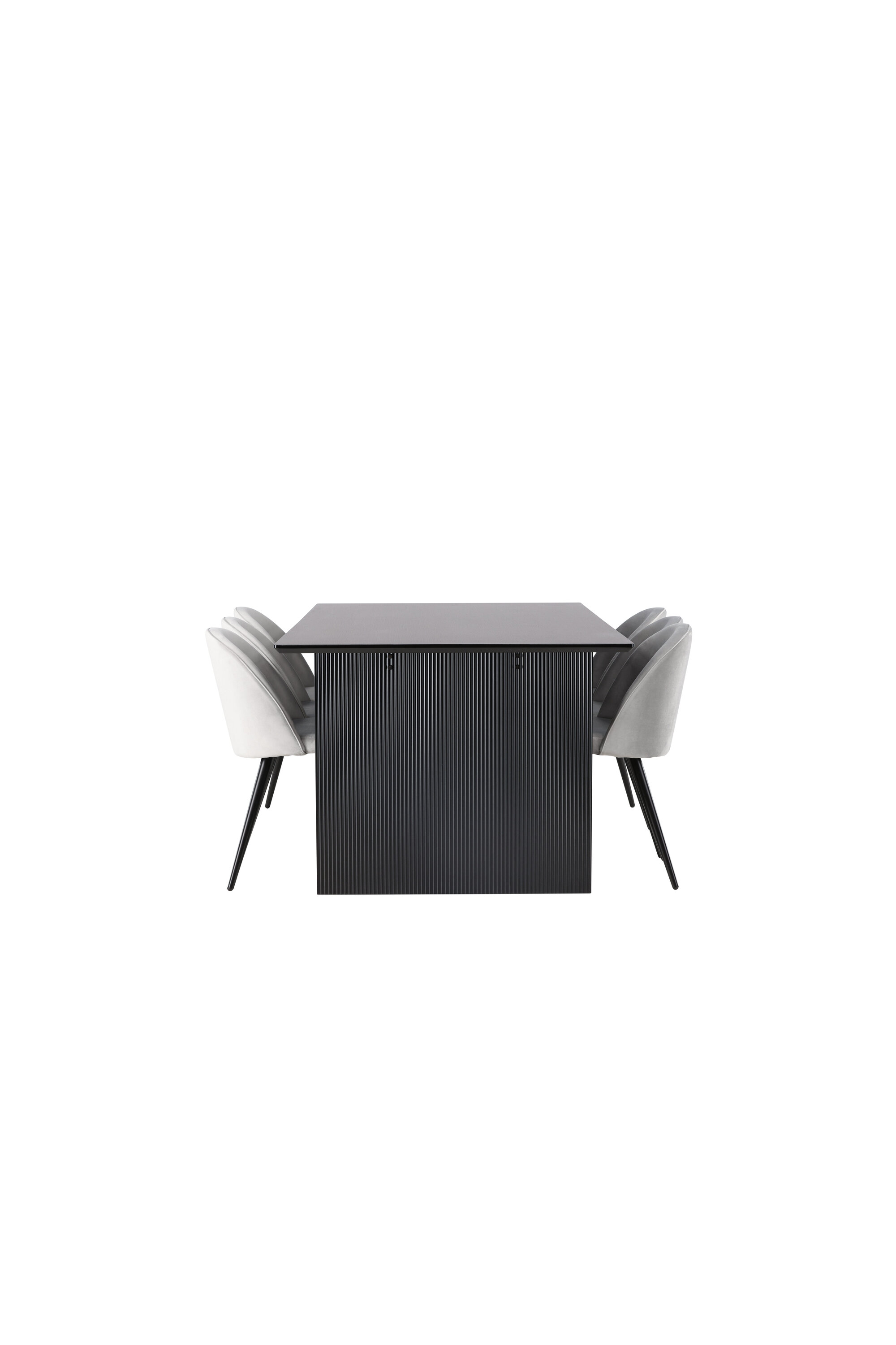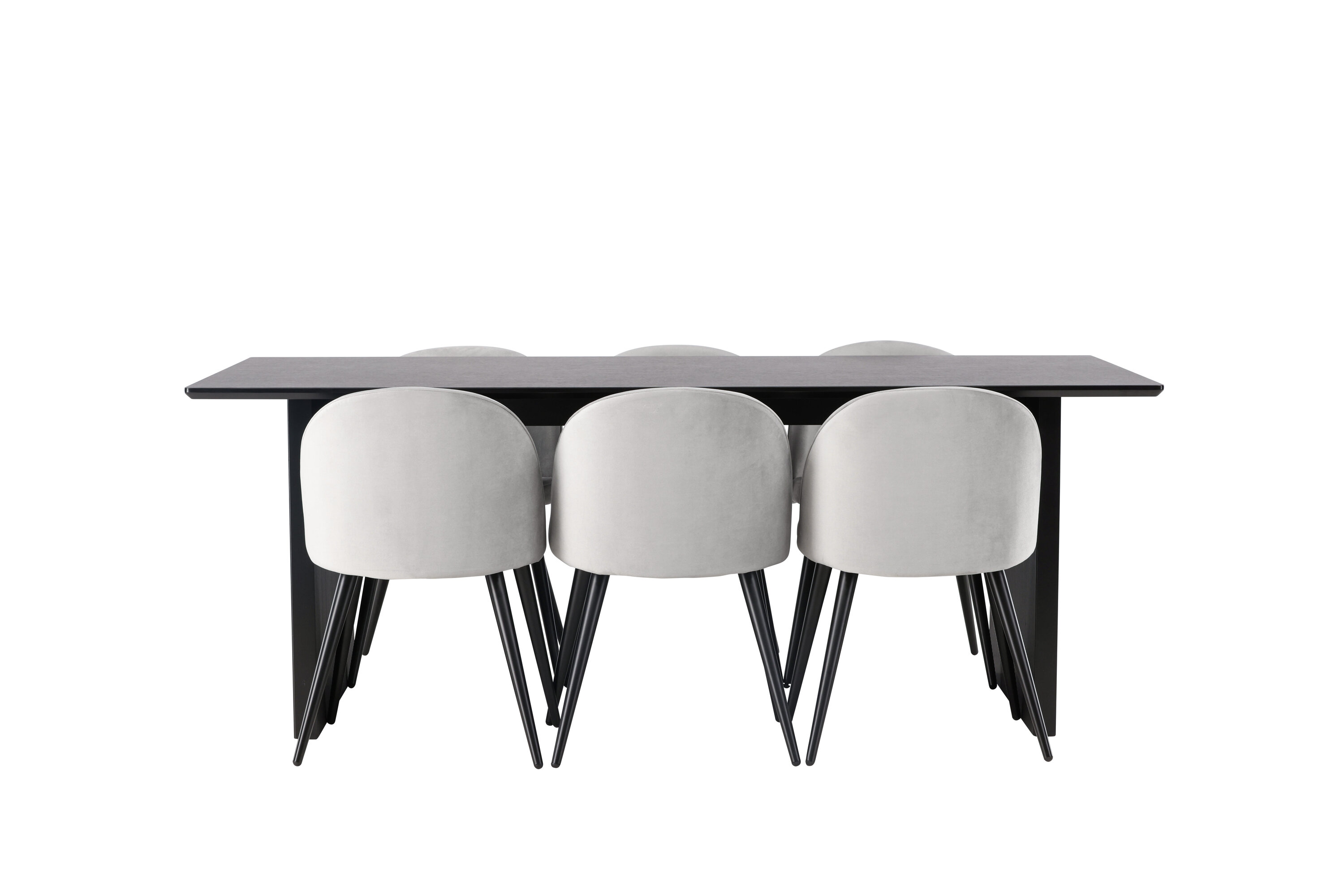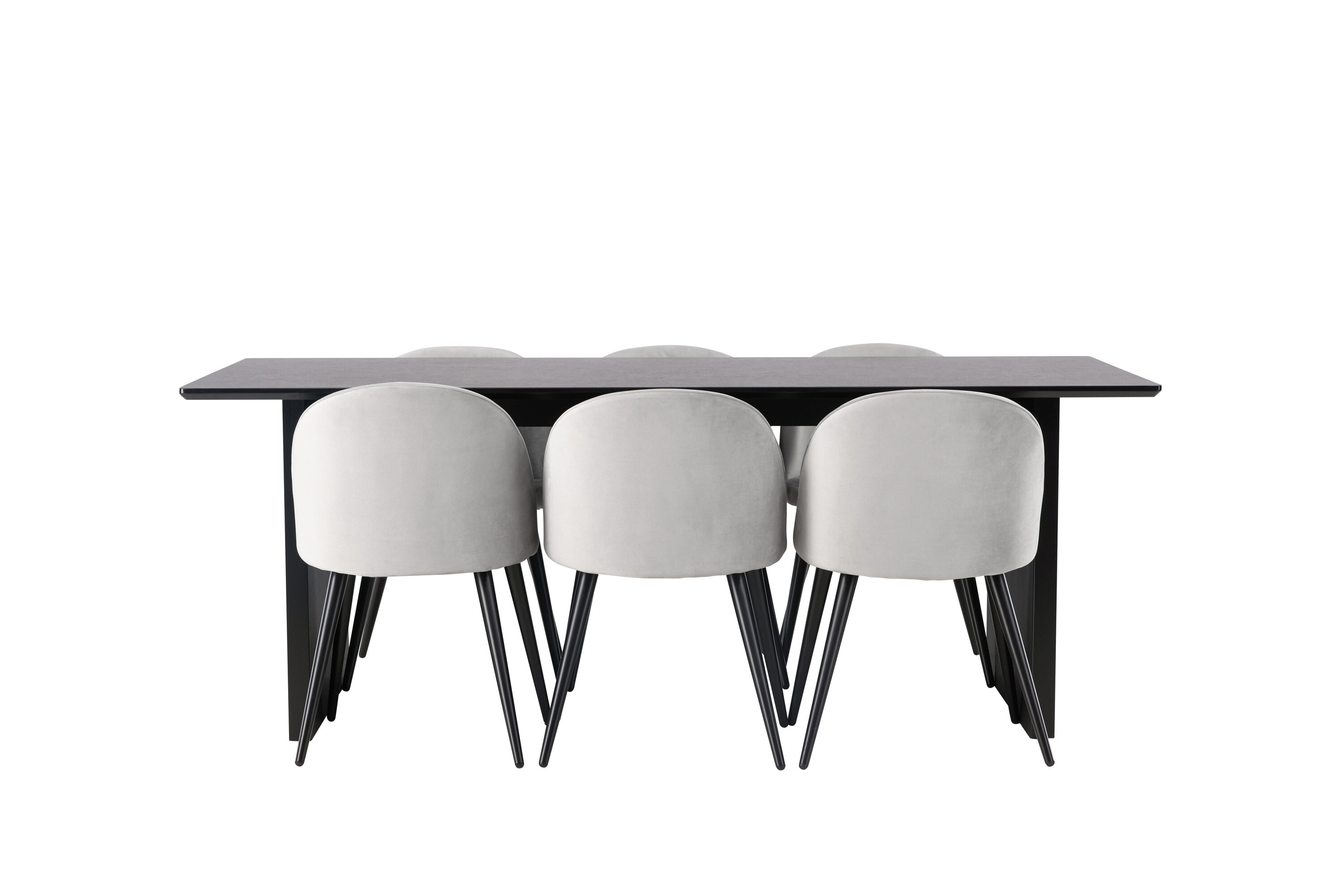 Meeldiv värvikombinatsioon! Ristkülikukujuline söögilaud Vail on sirgete põhjamaiste vormidega ja valmistatud vastupidavast tahmast musta värvi MDF-ist. Lauaplaat on õhuke ristkülikukujulise disainiga ja balansseerib kahe tugeva puitlauaga, mis moodustavad aluse. Siin on täiuslik kombinatsioon meie Velvet sarja hallide söögitoolidega. Toolil on täielikult polsterdatud disain, jalad mustast pulbervärvitud metallist ning ümar seljatugi ja iste hallist sametkangast ja pehme polstriga. Siin saate nii teie kui teie külalised pikka aega mugavalt istuda! Laua mõõdud: 200x100cm.