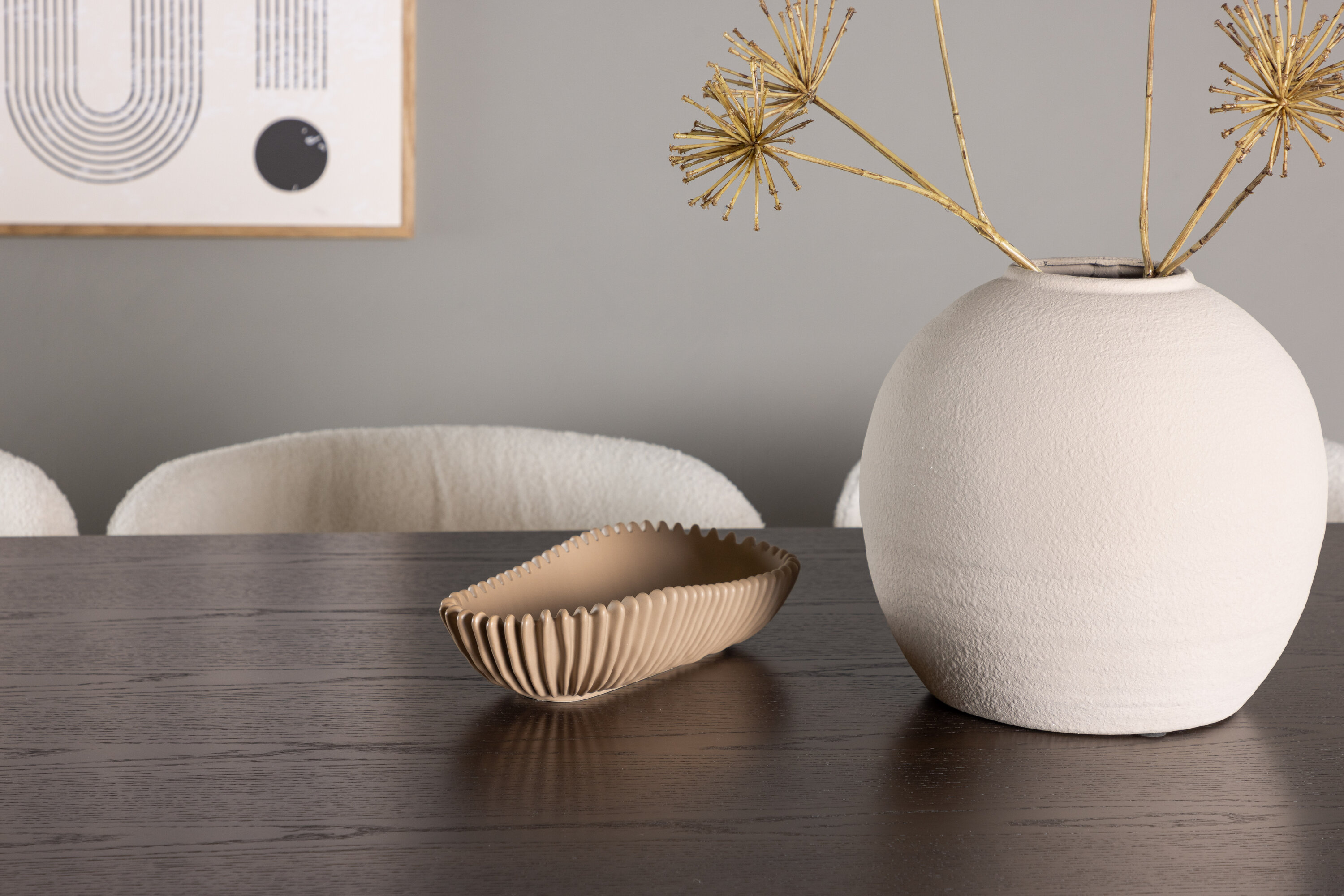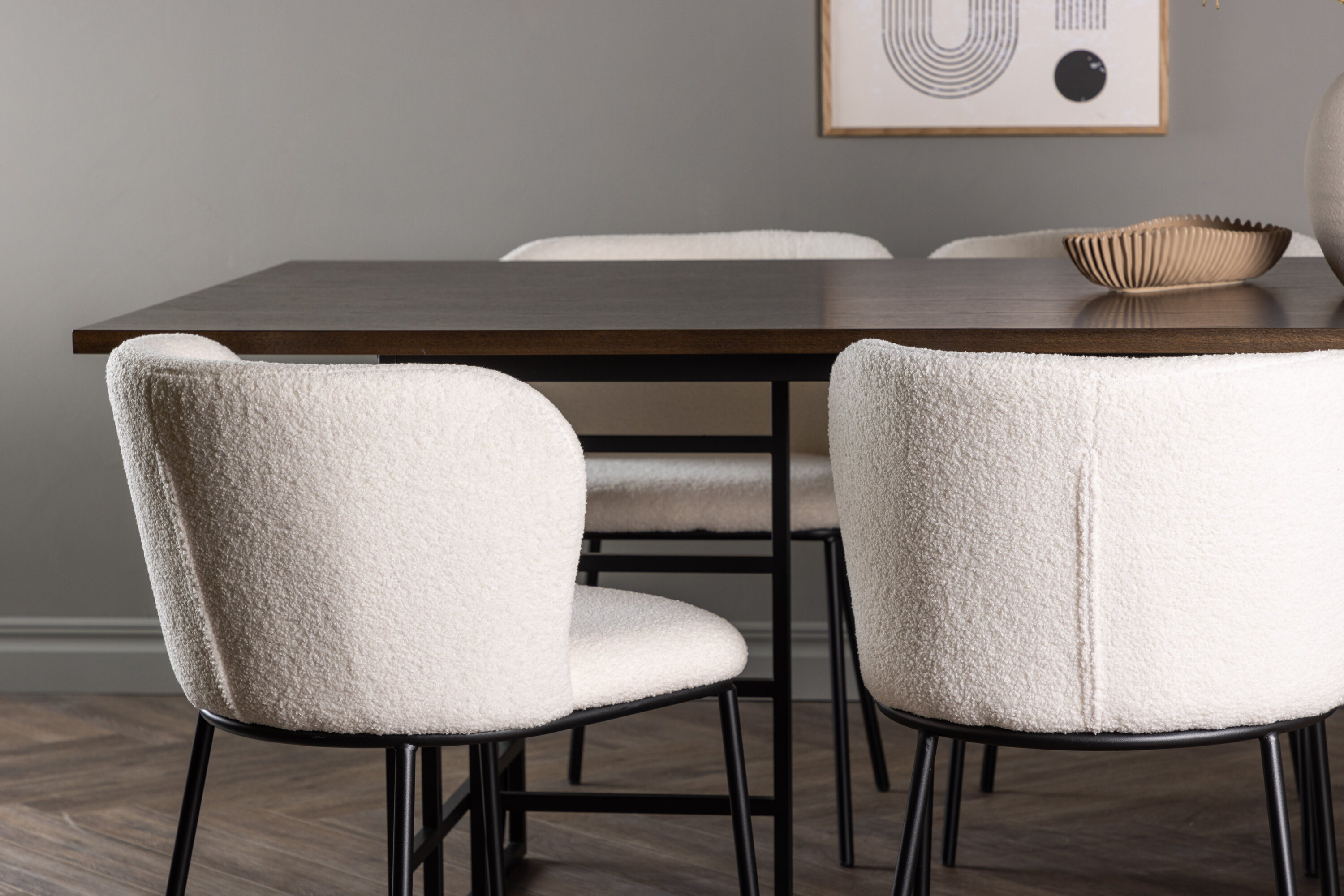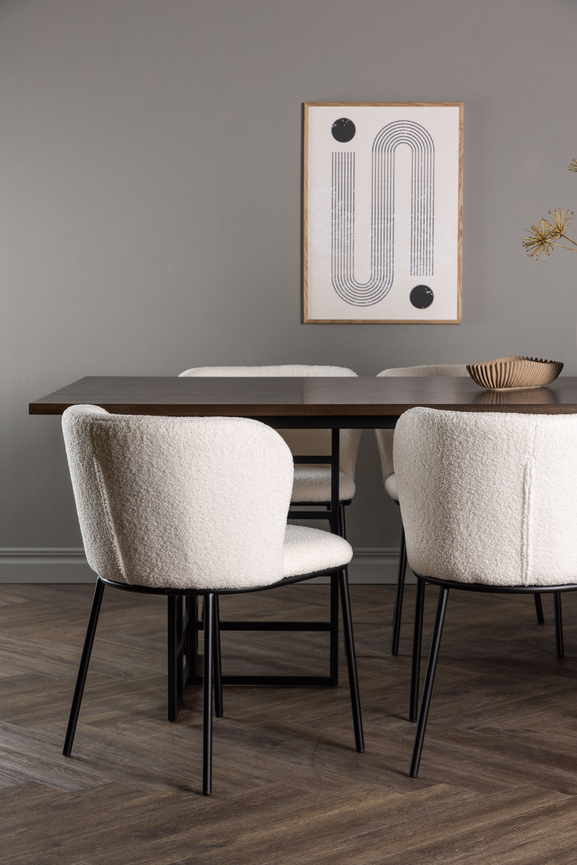 Ristkülikukujulise söögilauaga Ystad on kaasas elegantse Edina sarja toolid. Sellel toolil on sile, täielikult polsterdatud valgest kangast iste, mis kutsub tunde mugavateks vestlusteks ja nauditavaks õhtusöögiks. Minimalistlikud mustast metallist toolijalad täiustavad elegantset disaini ja lisavad kogu söögikomplektile moodsat hõngu.