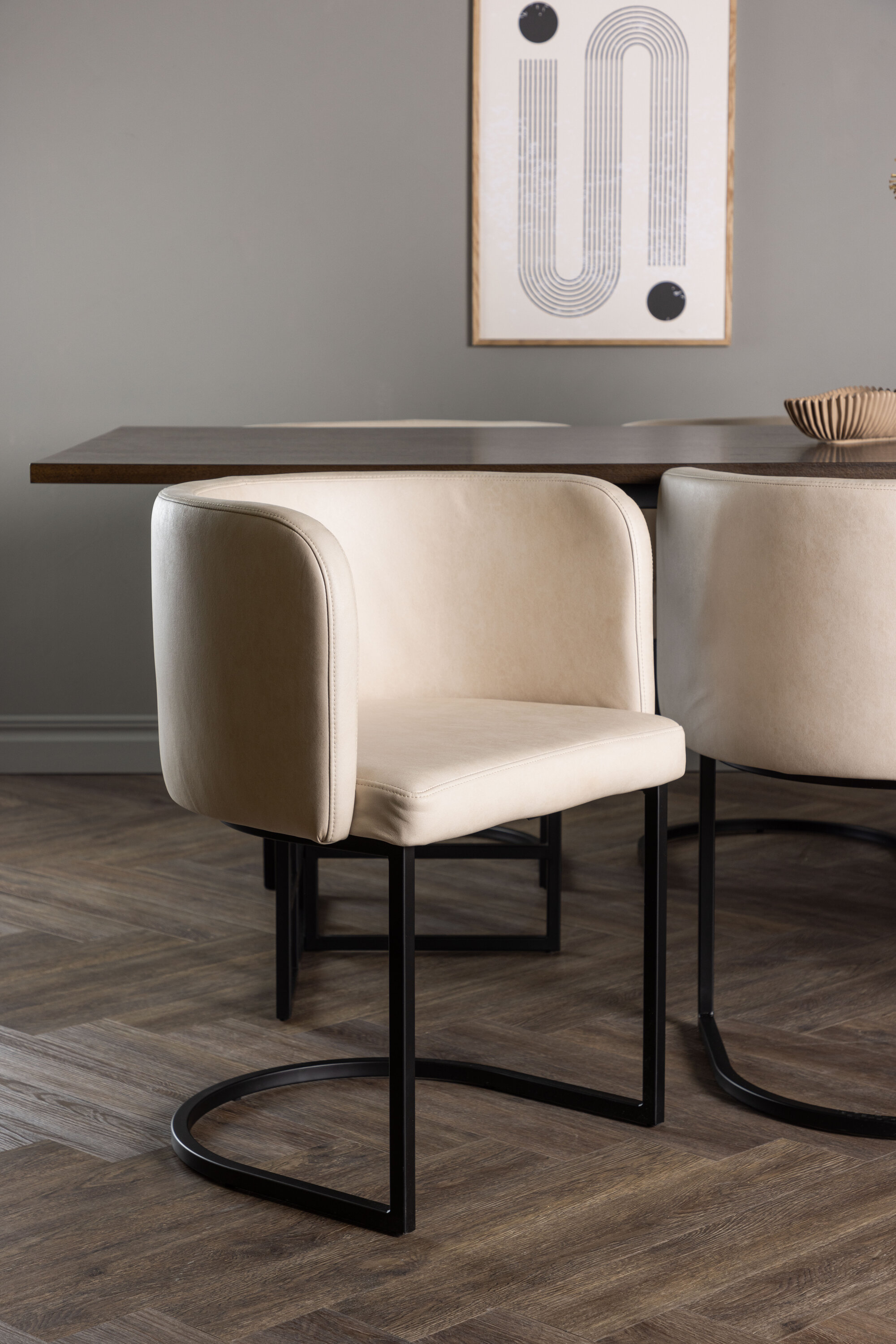 Siin koos meie suurepäraste Simrishamni seeria söögitoolidega. See tool on sama mugav kui ka stiilne ning loob teie söögilaua ümber luksusliku atmosfääri. Täielikult polsterdatud iste ja ümar beežist TC-kangast seljatugi annavad luksuse ja elegantsi tunde. Selle minimalistlik must terasraam täiendab suurepäraselt söögilaua tööstuslikku disaini.