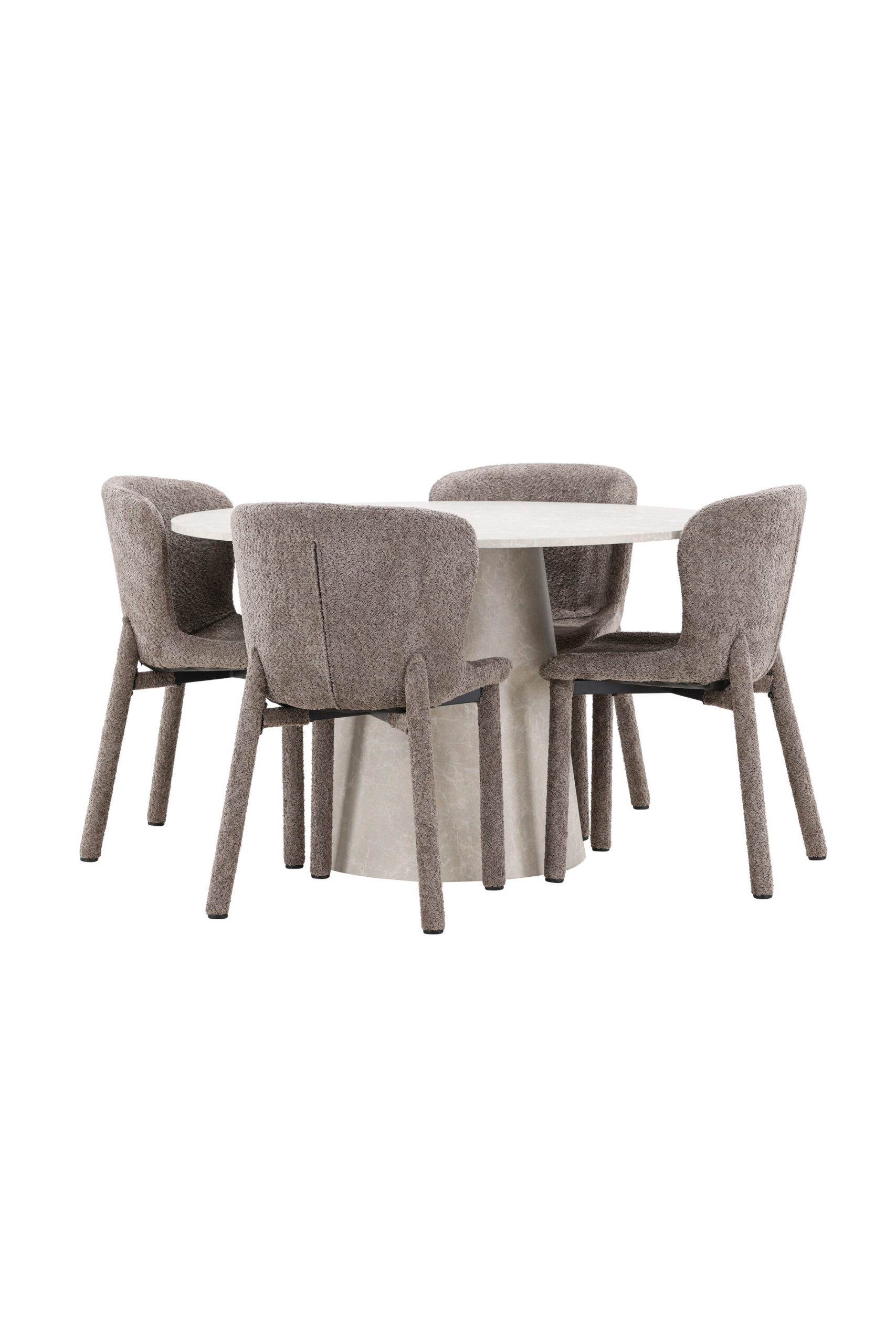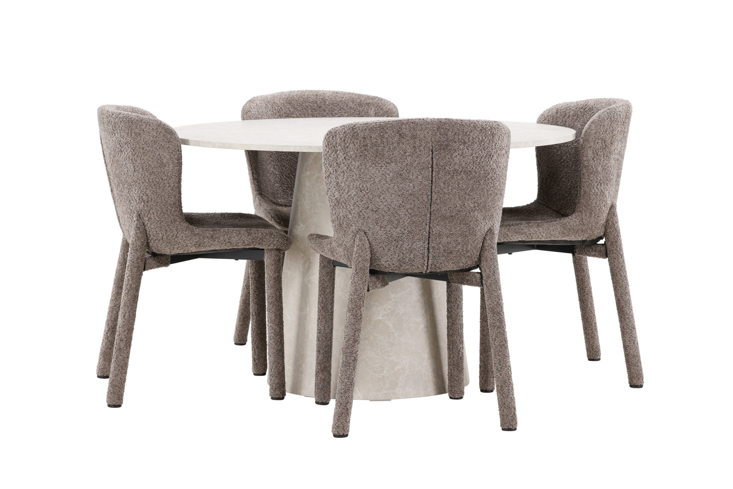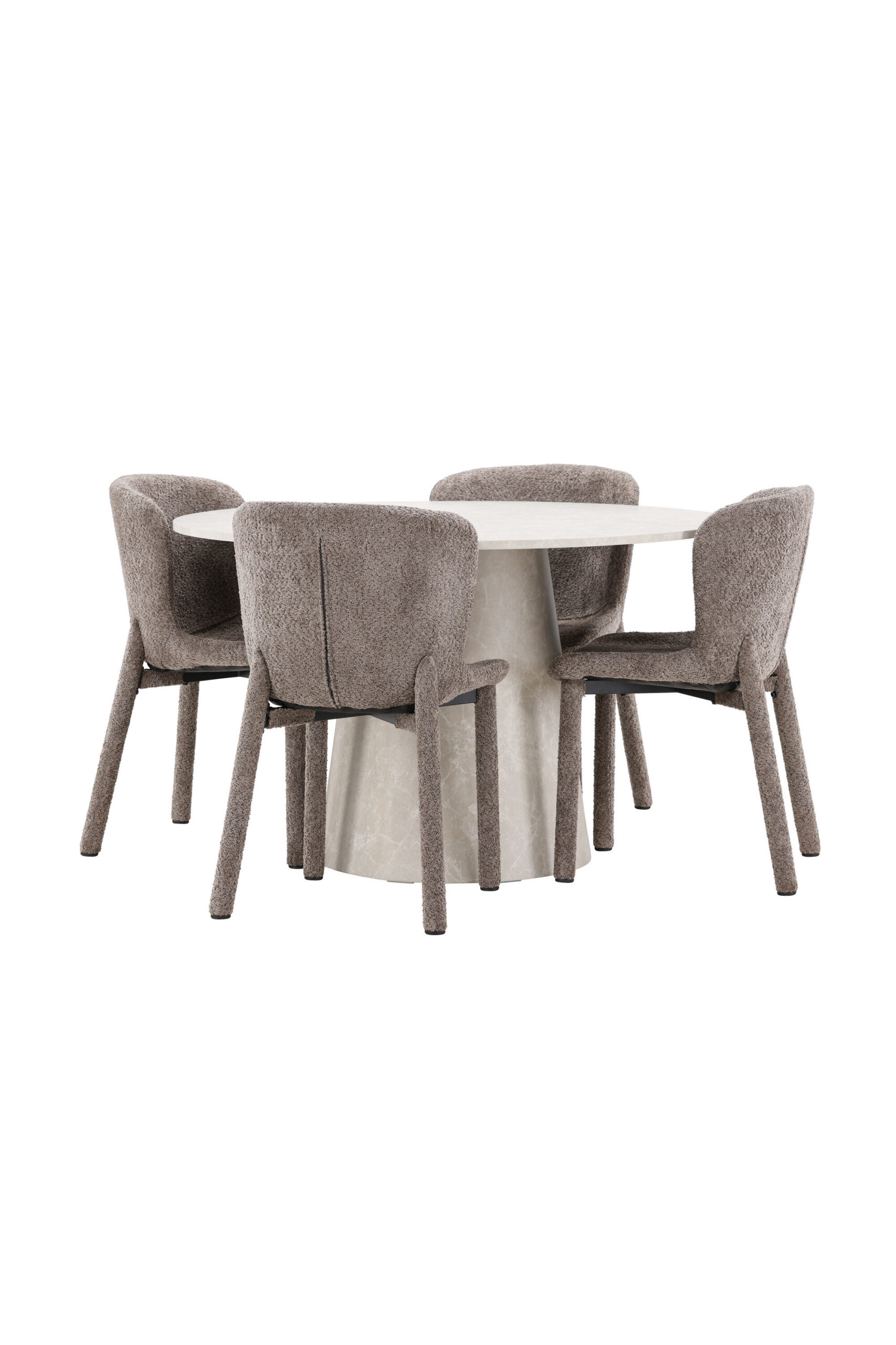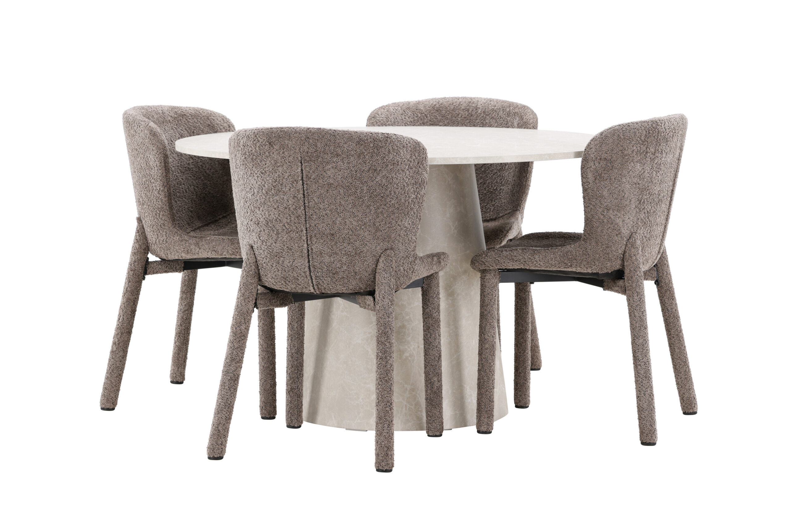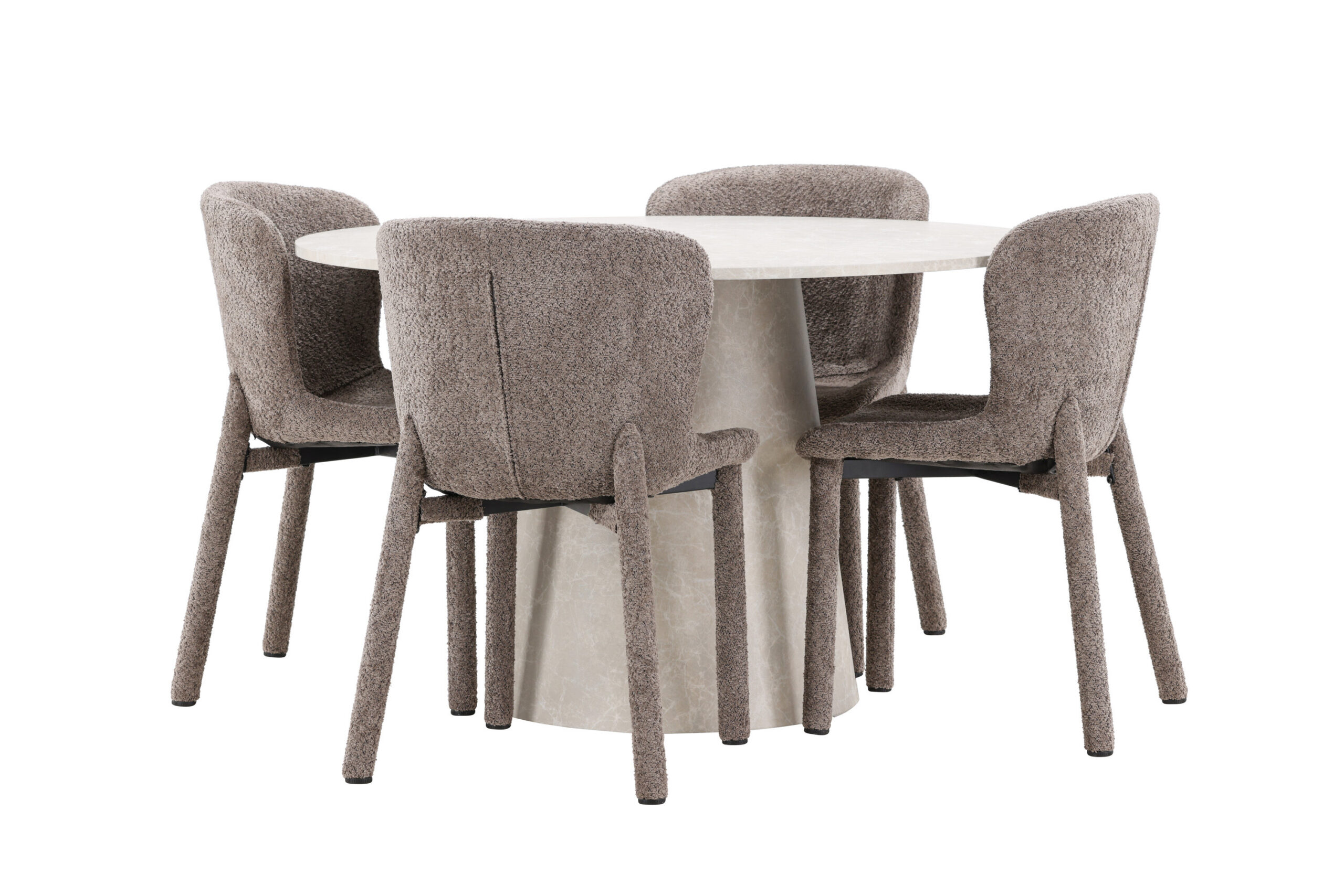 Lauaga on ühendatud Astoria söögitool, mis on polsterdatud elegantse pruuni bukleega. Toolist õhkub soojust ja kutsuvat tunnet ning pehme tekstuuriga bouclé kangas lisab luksust. Rikkalik värv ja keerukas tekstuur muudavad Astoria silmatorkavaks omaduseks nii moodsas kui ka klassikalises keskkonnas. Ergonoomikat silmas pidades kujundatud toolil on kallistav seljatugi ja mugav polsterdatud iste, mis muudab selle ideaalseks pikkadeks lõõgastavateks õhtusöökideks.