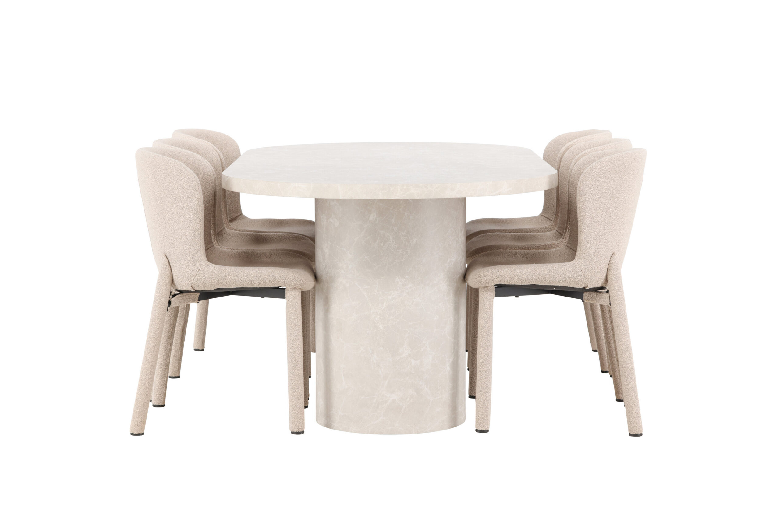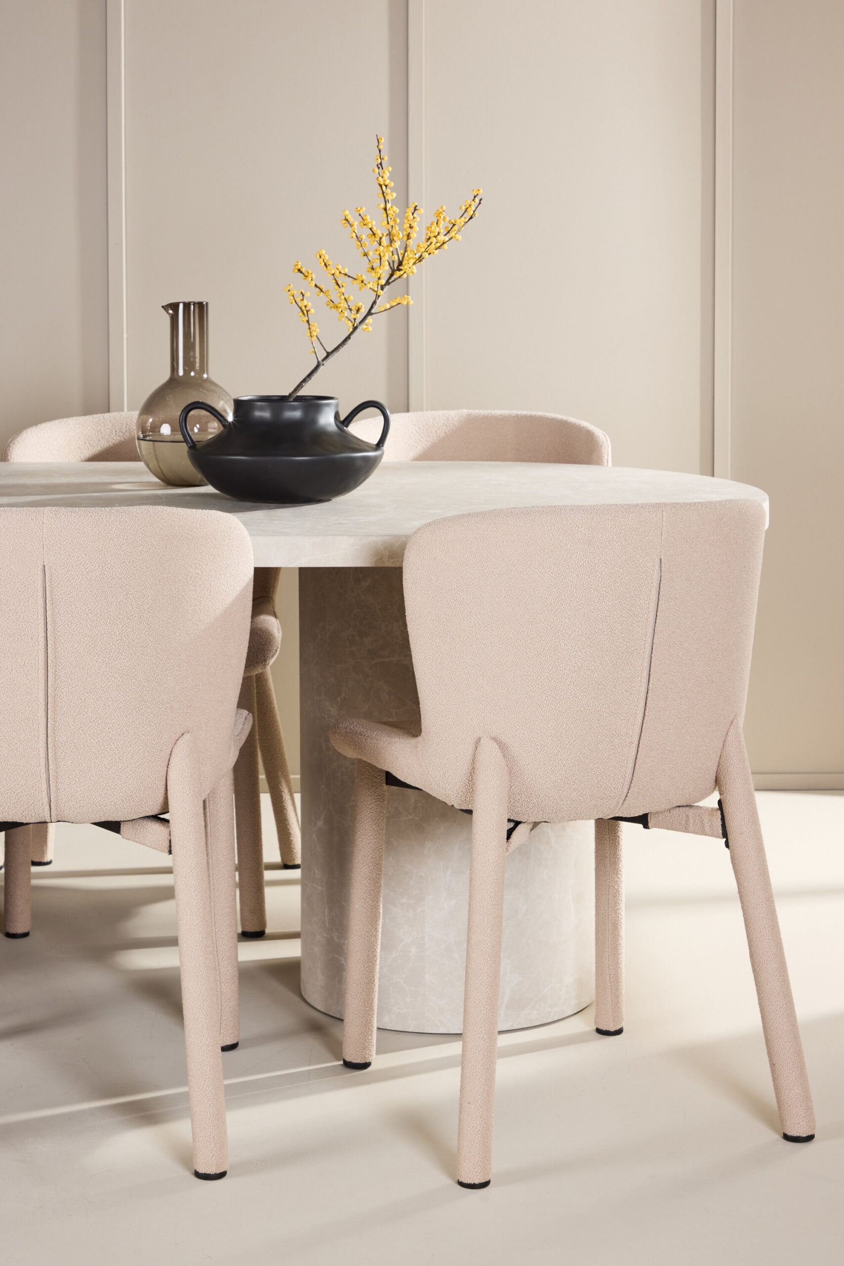 Lauaga on ühendatud Astoria söögitool, mis on polsterdatud luksusliku beeži boucléga. Kanga pehme tekstuur ja loomulik toon annavad toolile eksklusiivse ja kutsuva tunde, võimaldades sellel sujuvalt integreeruda erinevatesse interjööriseadetesse. Astoria pole mitte ainult visuaalselt vapustav, vaid ka ergonoomiliselt kujundatud, et pakkuda suurepärast tuge pikkade söögikordade ajal. Nii istme kui ka seljatoe rikkalik polsterdus pakub mugavat ja lõõgastavat kogemust.