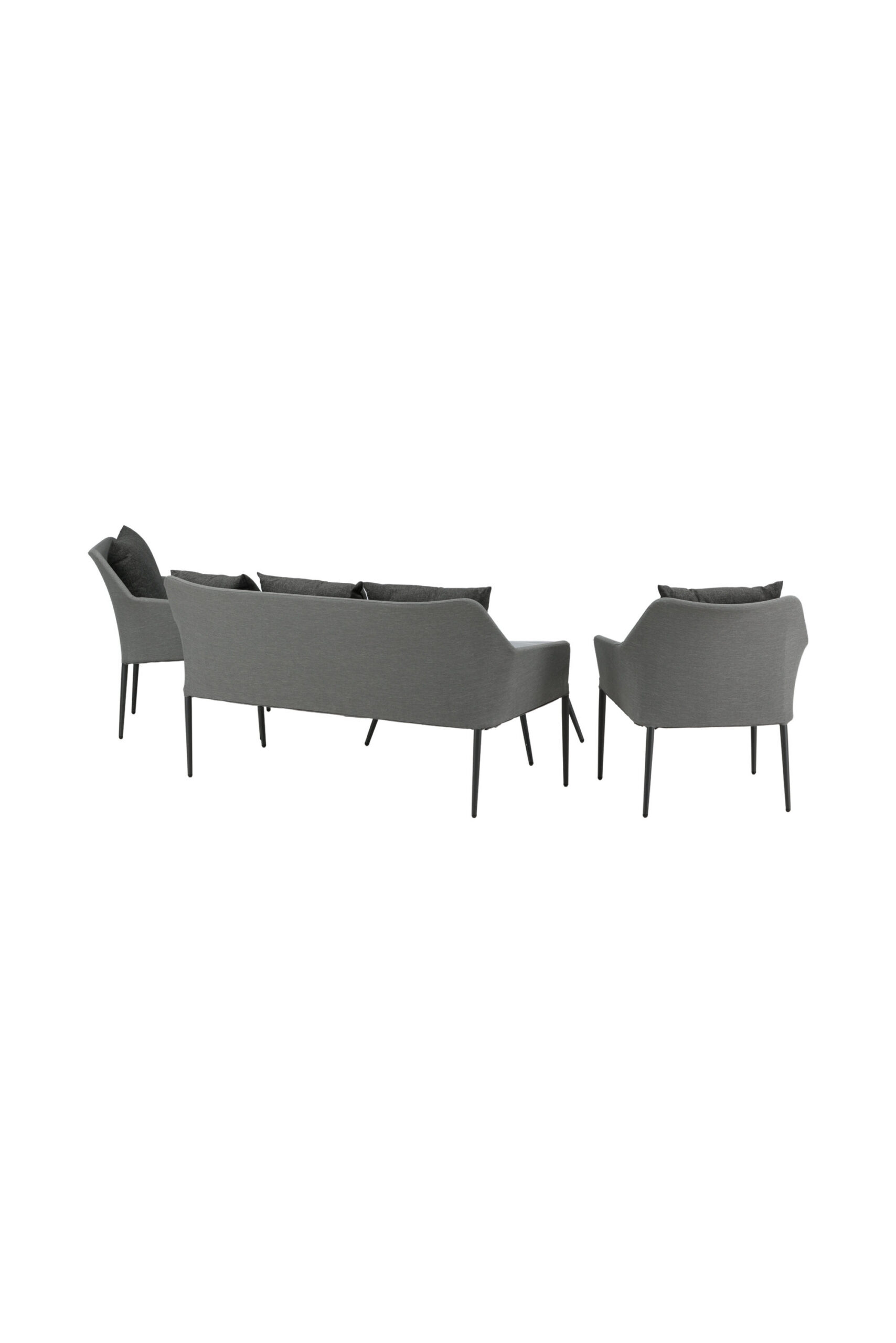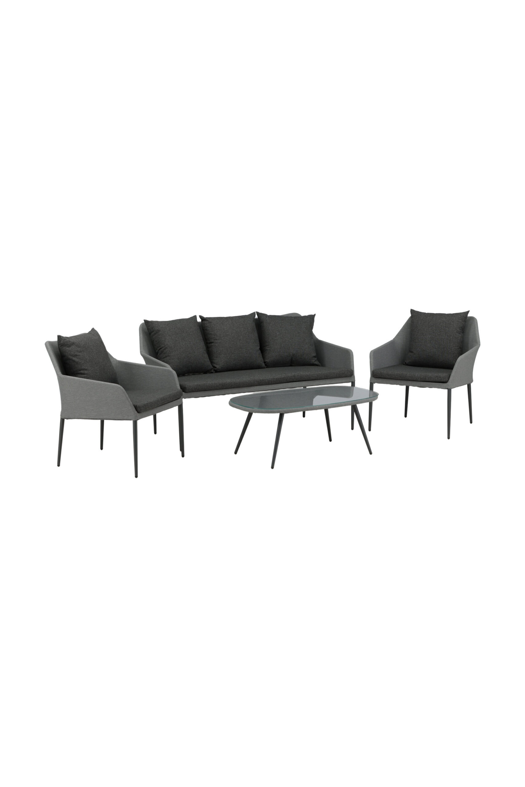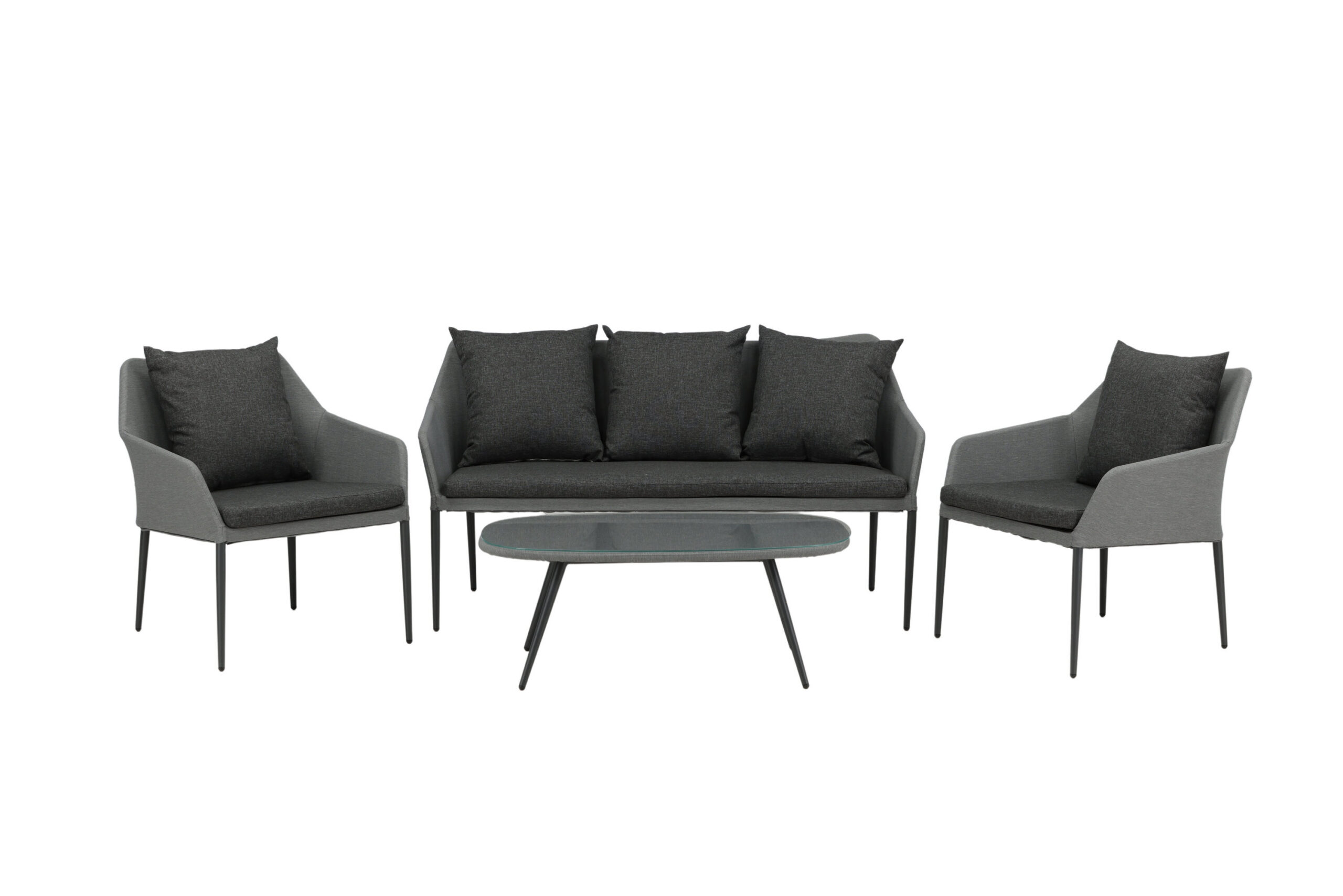Spoga on kaasaegne lounge-grupp, mille fookuses on mugavus – see sobib suurepäraselt terrassile või rõdule. Mööbligrupp koosneb kahekohalisest diivanist ja kahest karkassist tugitoolist. Gruppi kuuluvad ka mustad pehmed padjad ning ovaalne madal kohvilaud, mille läbipaistvast klaasist lauaplaat loob eksklusiivse terviku. Naudi mõnusaid suveõhtuid mõnusas diivanigrupis!