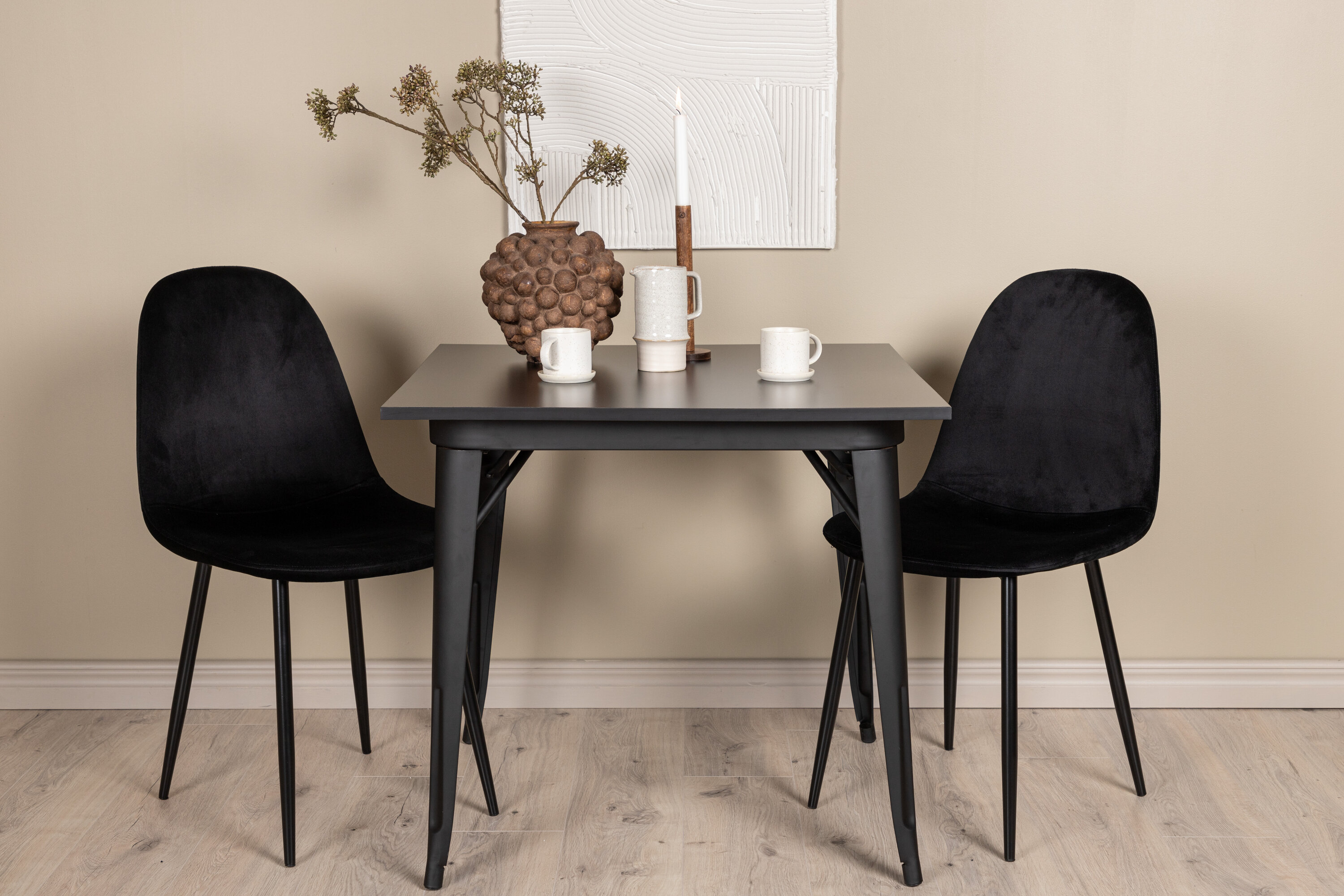 Võluv söögigrupp kahele – ideaalne väikesesse kööki! Sellel Tempe sarja söögilaual on klassikaline, kandiline disain ja ajatu must värv. Lauaplaat on mustast MDF-st ja lauajalad mustast metallist. Siin maitsekas kombinatsioonis kahe tahmmustas toonis Polari seeria söögitooliga. Toolil on täielikult polsterdatud disain, ümardatud seljatugi ja iste mustast sametkangast, pehme polstriga ning jalad mustast pulbervärvitud metallist. Vältige kompromisse mugavuse ja disaini vahel!