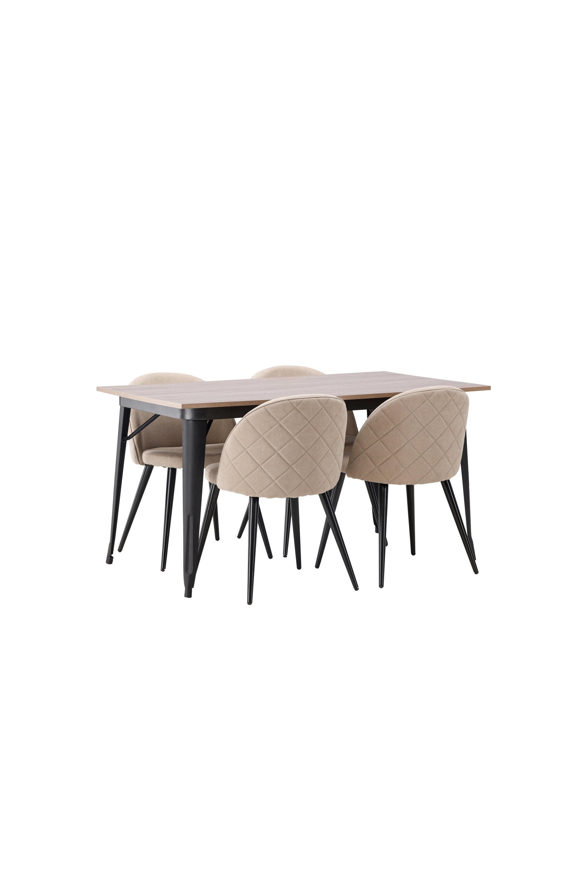 Trendikindel ja läbimõeldud! Tempe sarja söögilaud on stiilse skandinaavialiku disainiga. Valmistatud ruudukujulisest pähklivärvi MDF-ist lauaplaadist ja mustast metallist lauajalad. Siin trendikindlas kombinatsioonis Velvet Stitches sarja söögitoolidega. Tooli seljatugi on ümar ja nagu istmegi, on see pehmelt polsterdatud beeži sameti ja polüesterlinaga, mille seljatoel on dekoratiivsed dekoorõmblused ja malemustrid. Jalad on mustast rauast kergelt laienenud ja jätavad ühtlase mulje. See söögigrupp on sama mugav kui kutsuv! Laua mõõdud: 140x80cm.