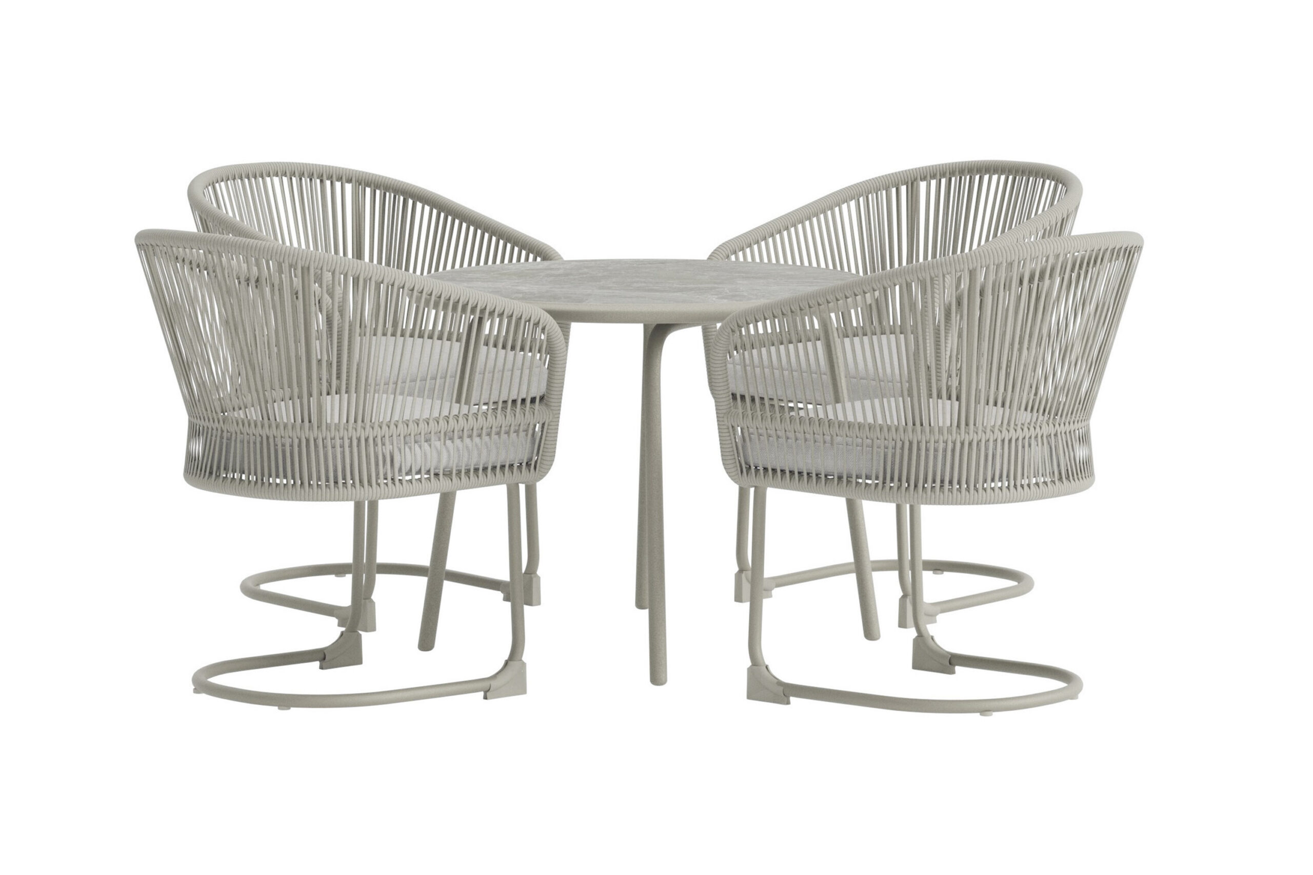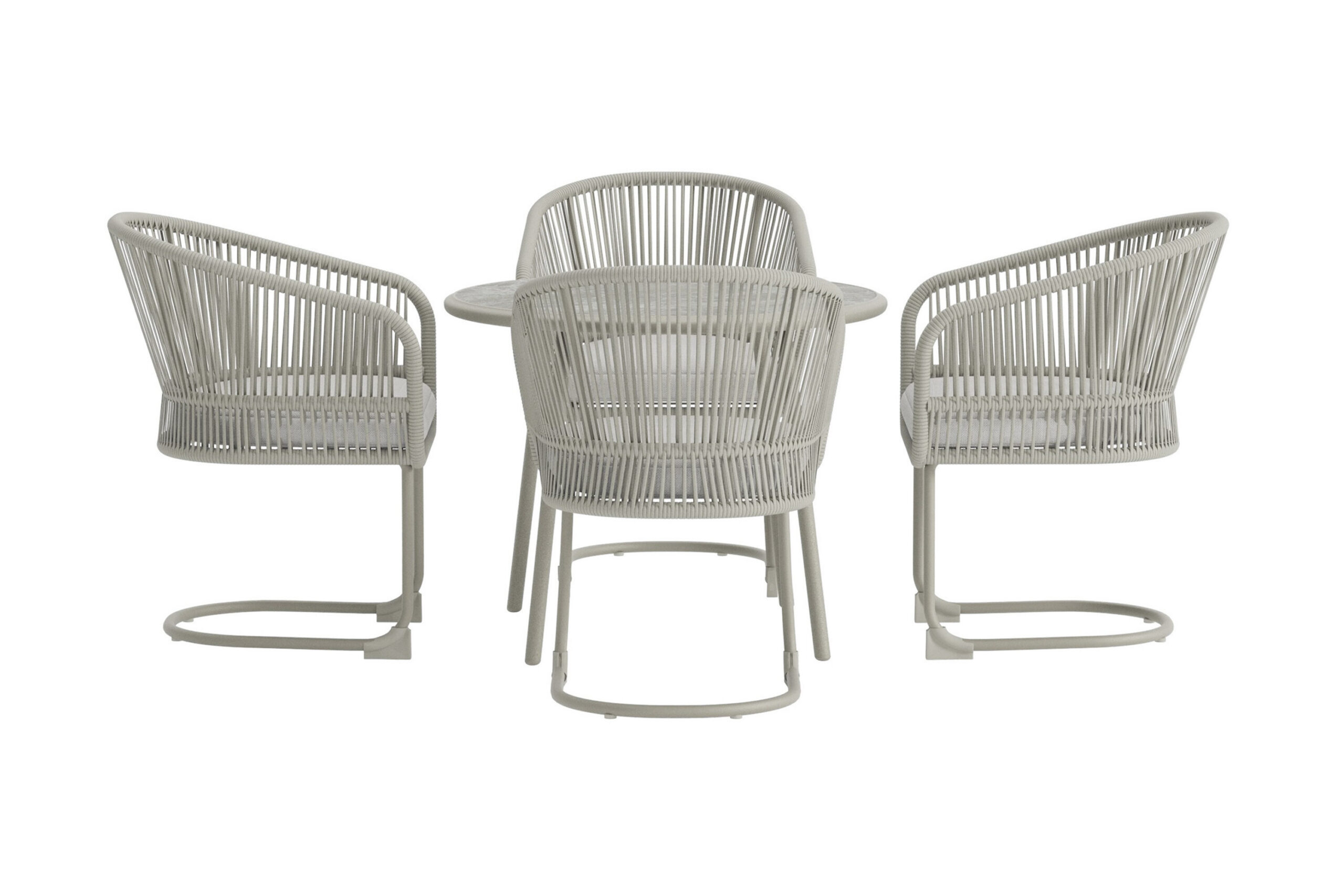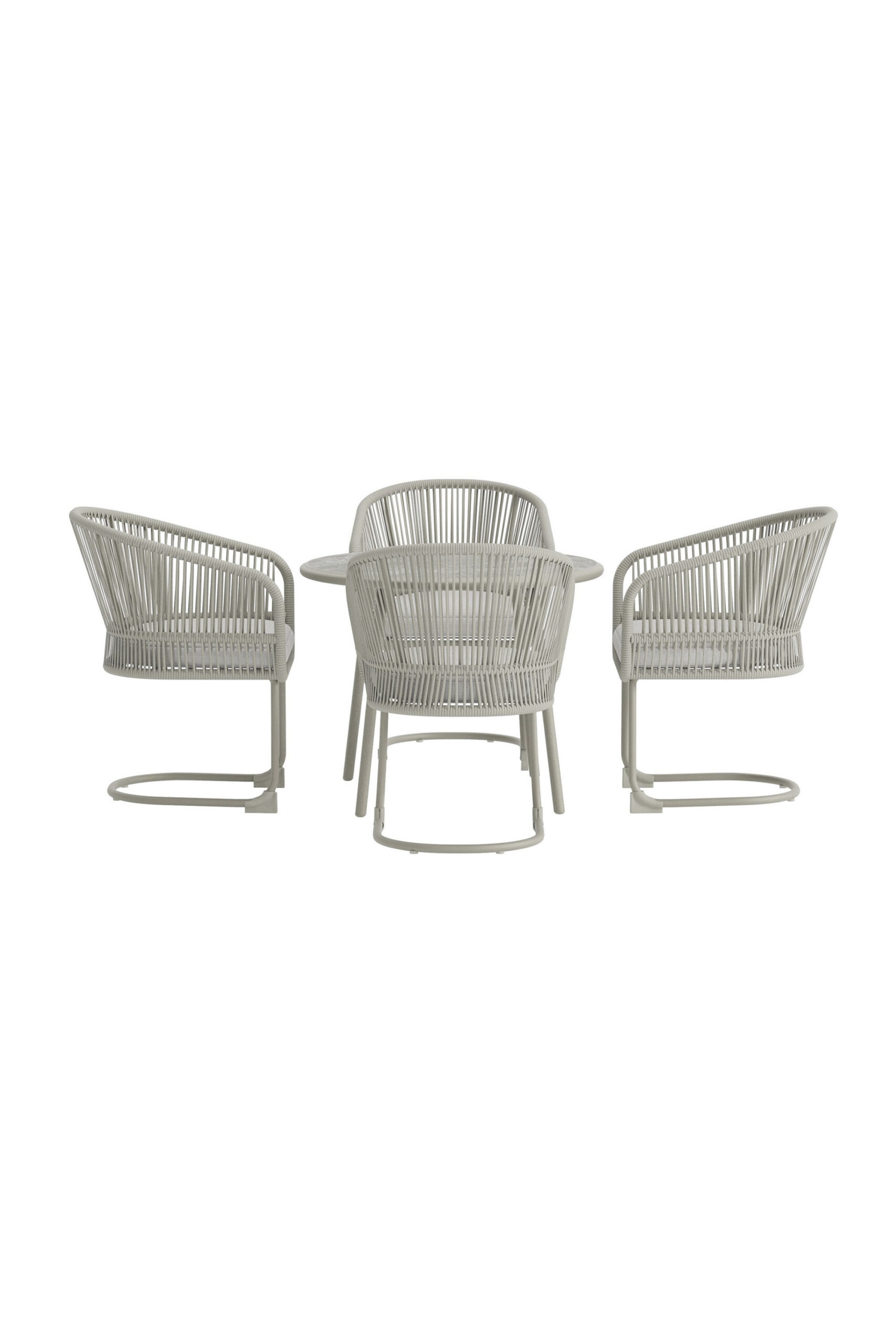 Tilos on elegantne ümar söögikomplekt, mis ühendab moodsa vormi kutsuva mugavusega. Ümmargune lauaplaat loob loomuliku kogunemiskoha ja võimaldab kõigil laua taga suhelda võrdsetel tingimustel. Kaasasolevatel toolidel on kaasahaarav disain ja pehmed padjad, mis pakuvad suurepärast istumismugavust ning sobivad ideaalselt pikkadeks õhtusöökideks ja lõõgastavateks õues veedetud hetkedeks.