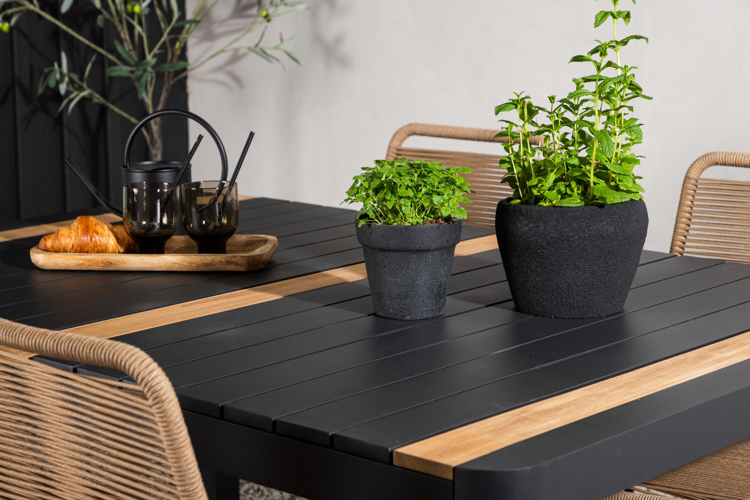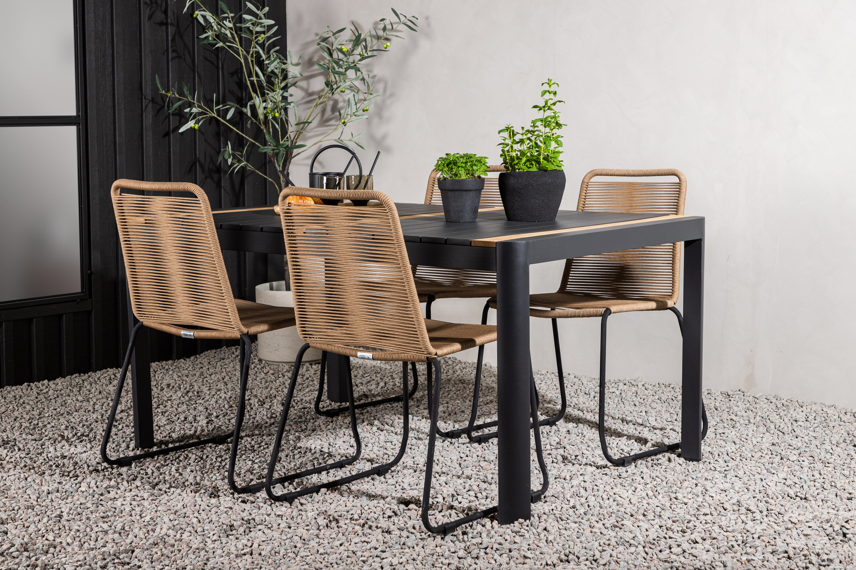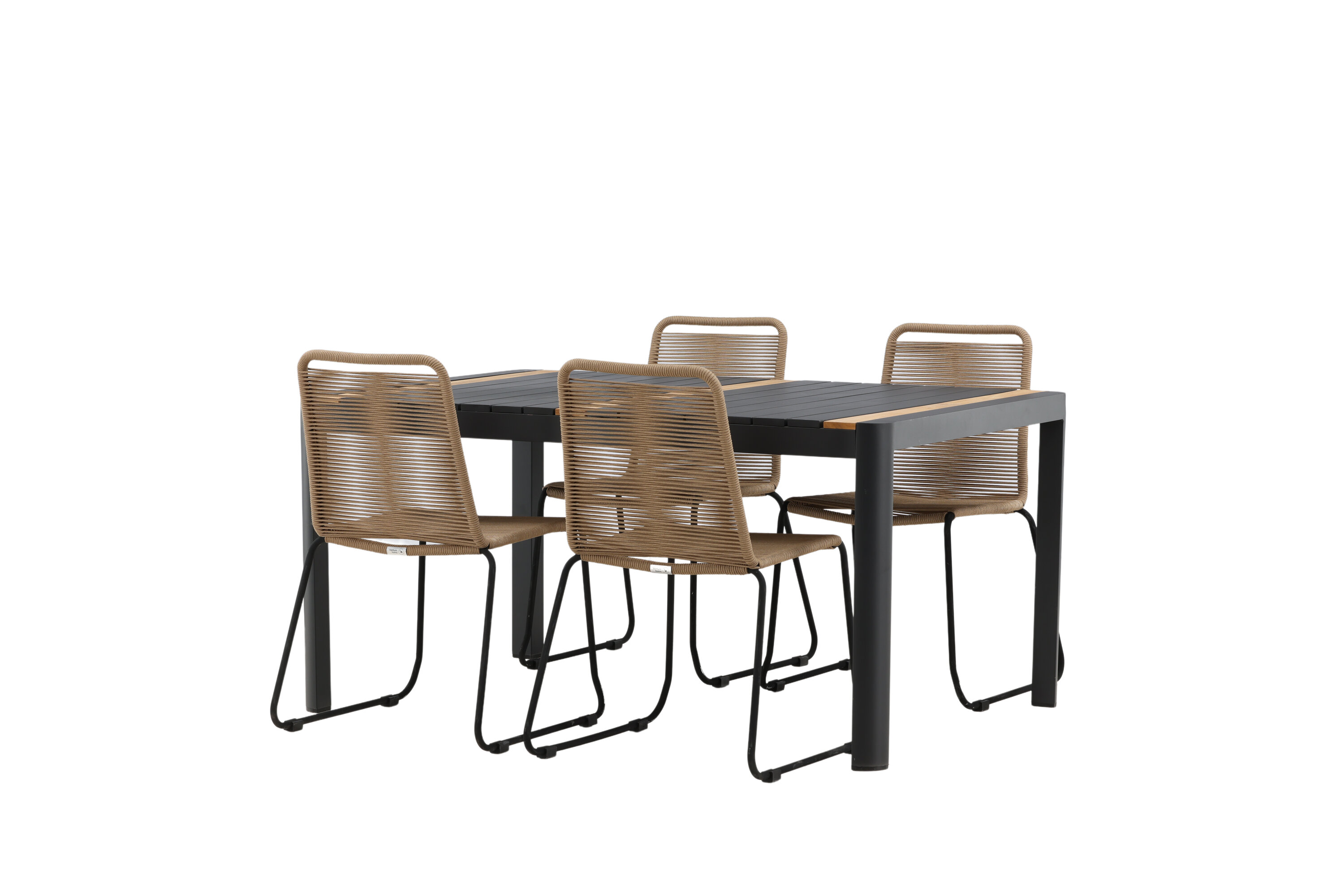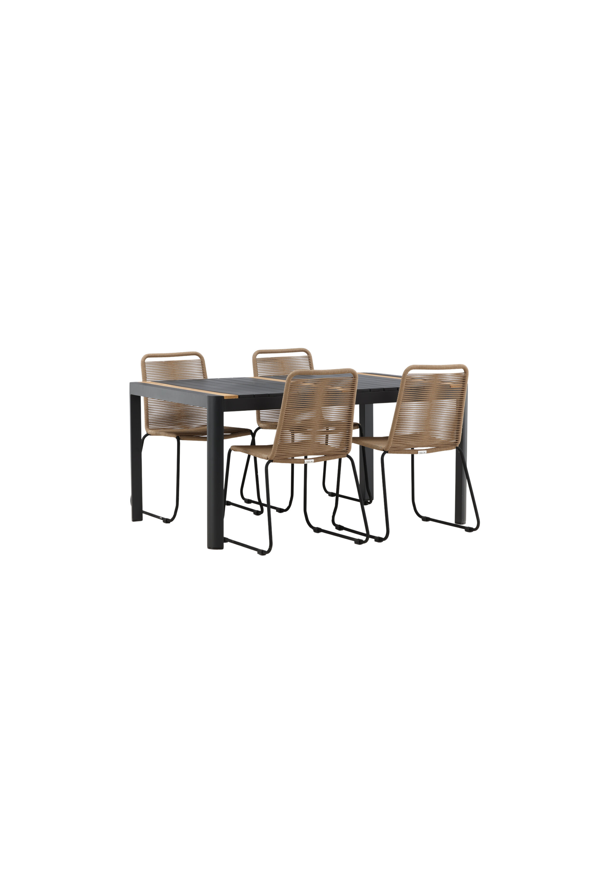 Stiilne, vastupidav ja elegantne – toidugrupp, kus kõigil on õigus! Söögilaual Togo on maitsekas versioon mustast ja puidust tiikpuust ristkülikukujulise lauaplaadi ning mustast alumiiniumist veermikuga. Sirge põhjamaine disain on sama klassikaline kui ajatu. Mõõdud: 150×100 cm. Siin moodsas kombinatsioonis Lindose sarja latte värvi söögitoolidega. Toolidel on stiilsed kitsad mustast terasest jalad ja iste vastupidavast beežist köiest. Maalähedane värv jätab mööblile sooja mulje. Kutsu ees palju meeldivaid eineid!