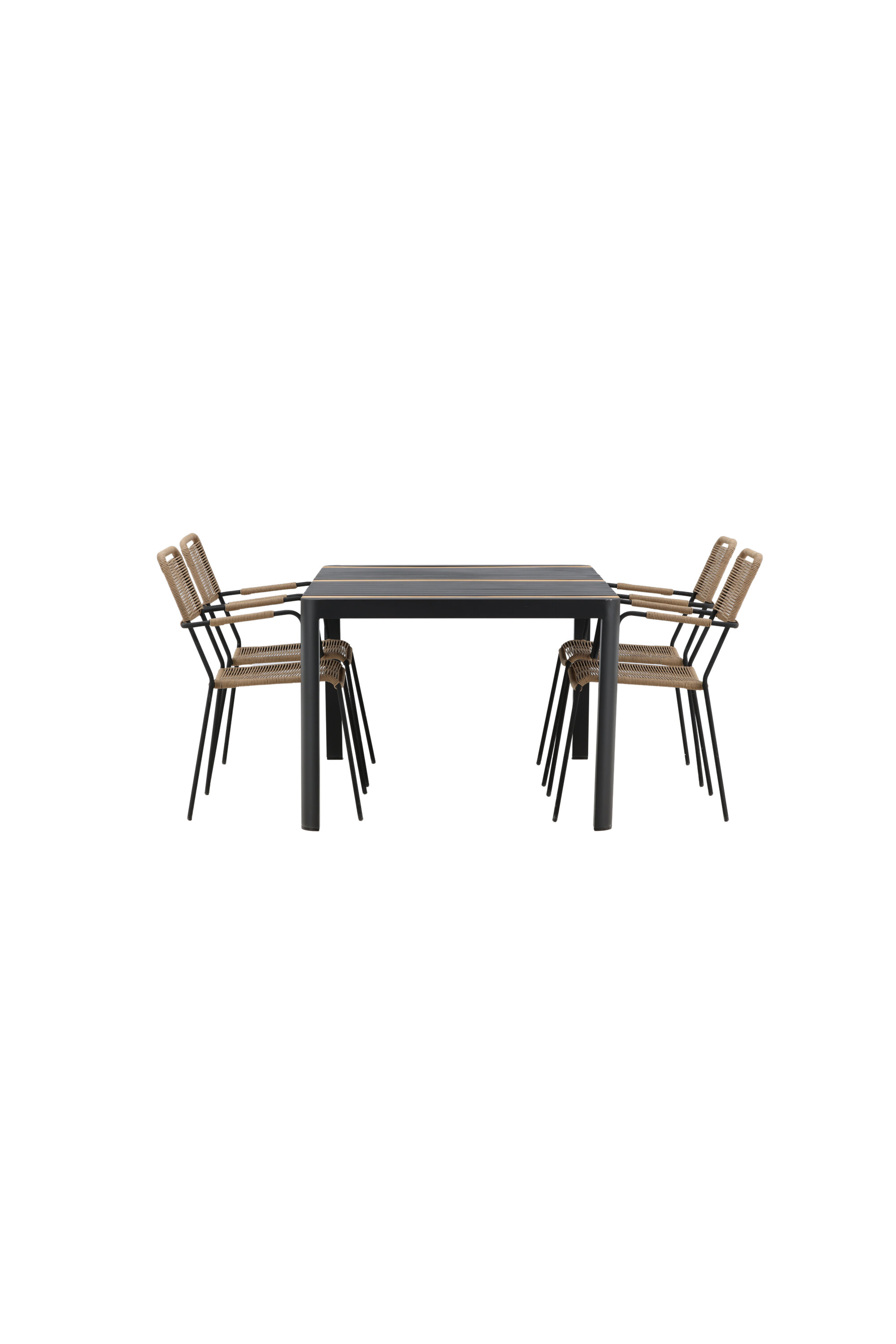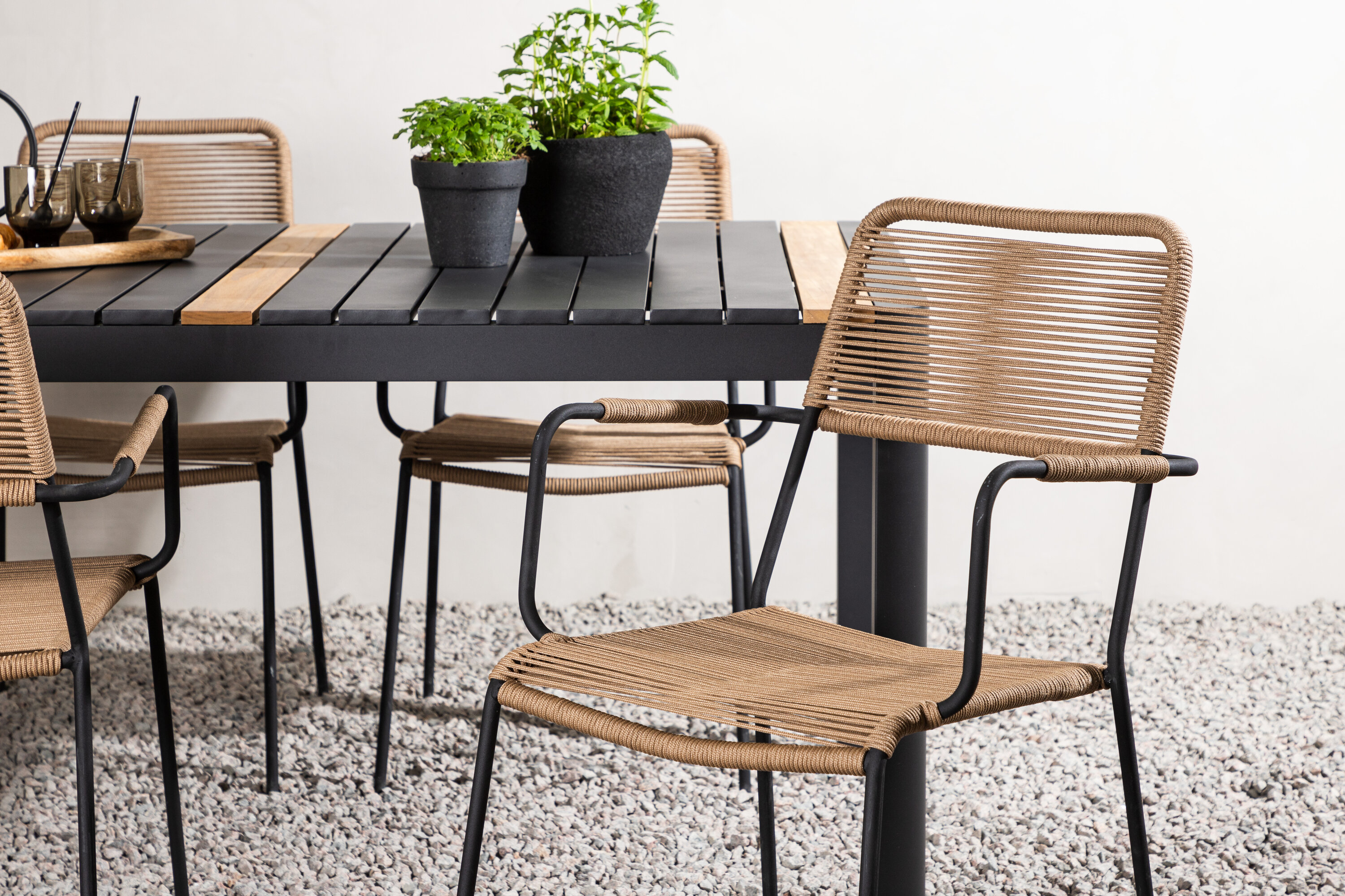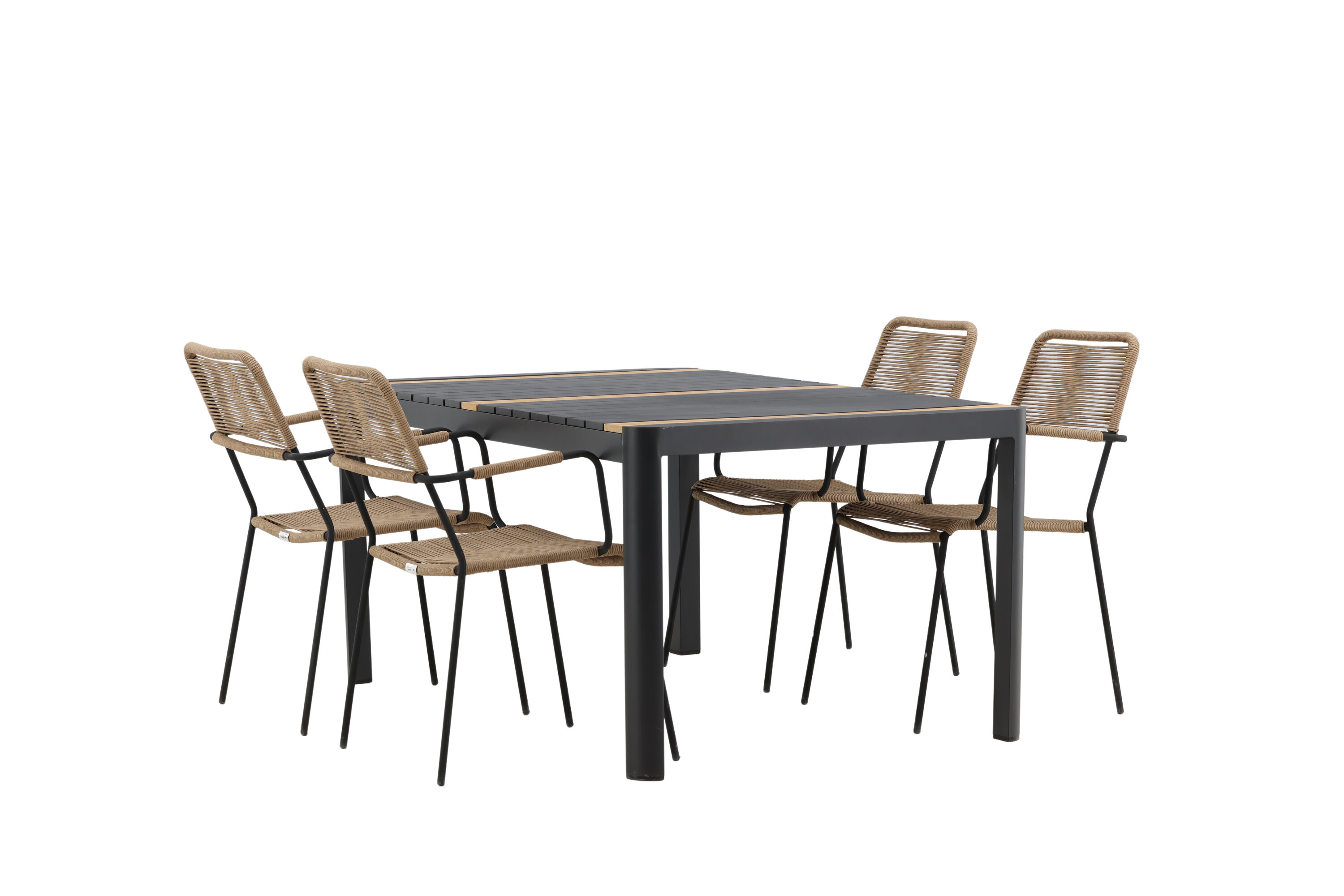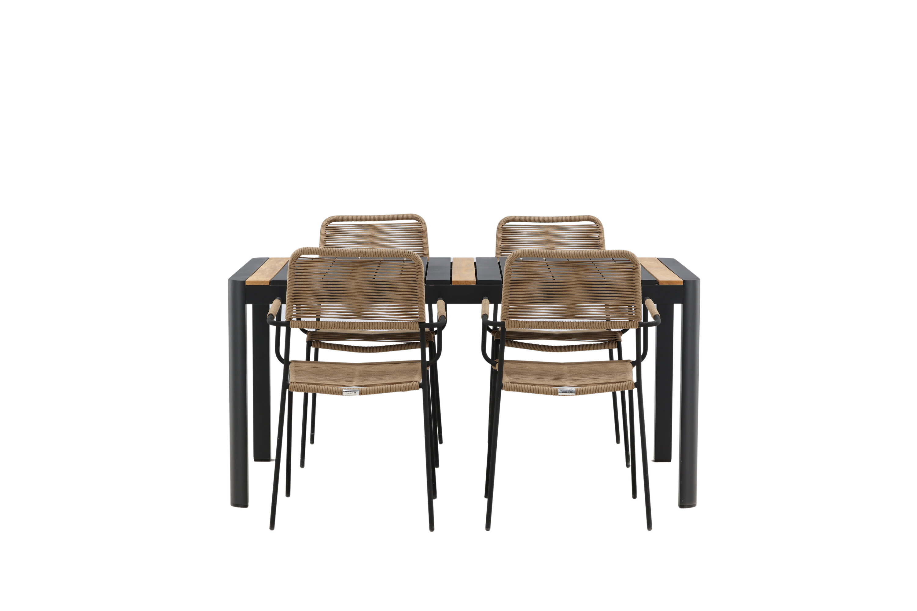 Stiilne, vastupidav ja elegantne – toidugrupp, kus kõigil on õigus! Söögilaual Togo on maitsekas versioon mustast ja puidust tiikpuust ristkülikukujulise lauaplaadi ning mustast alumiiniumist veermikuga. Sirge põhjamaine disain on sama klassikaline kui ajatu. Mõõdud: 150×100 cm. Siin moodsas kombinatsioonis Lindose sarja latte värvi söögitoolidega. Toolidel on stiilsed kitsad jalad ja integreeritud mustast terasest käetoed ning vastupidavast beežist köiest iste. Maalähedane värv jätab mööblile sooja mulje. Kutsu ees palju meeldivaid eineid!