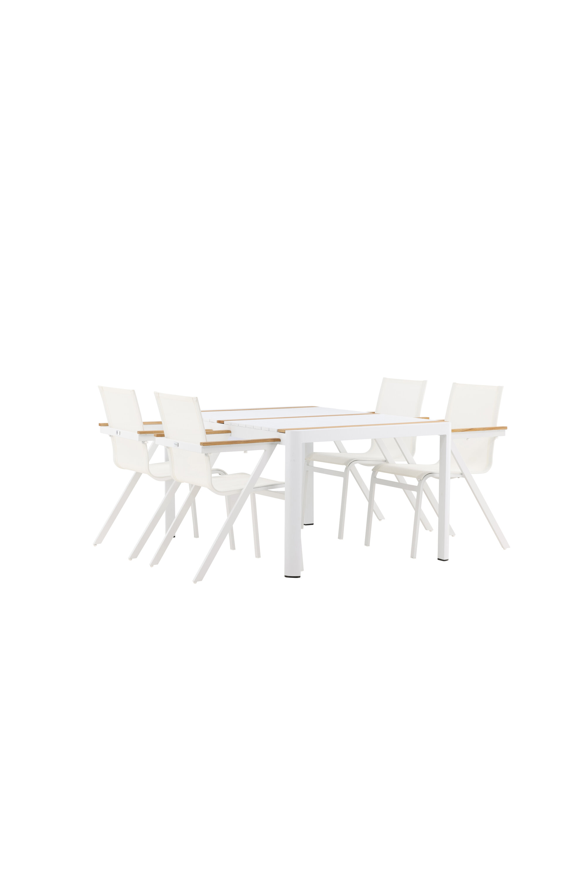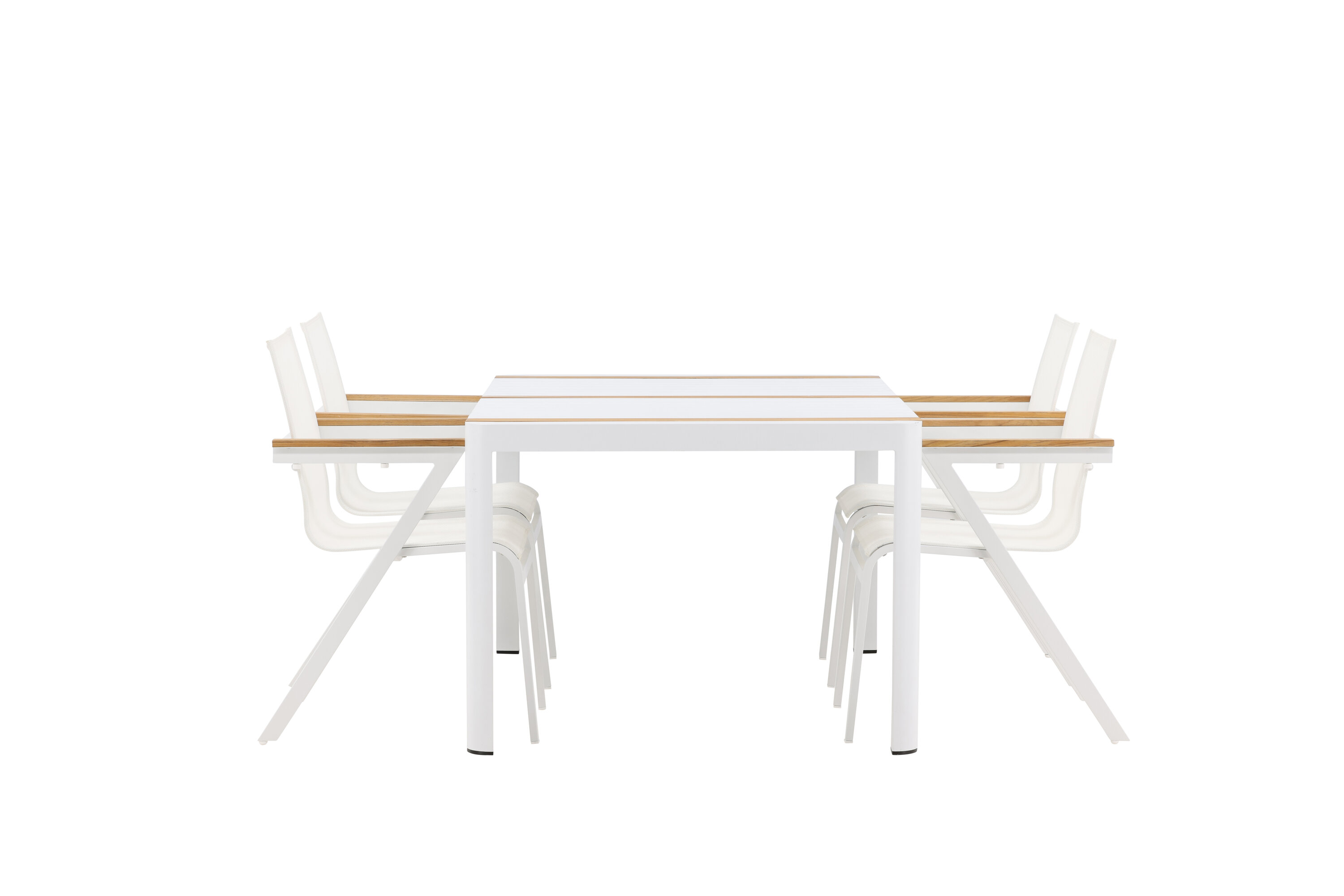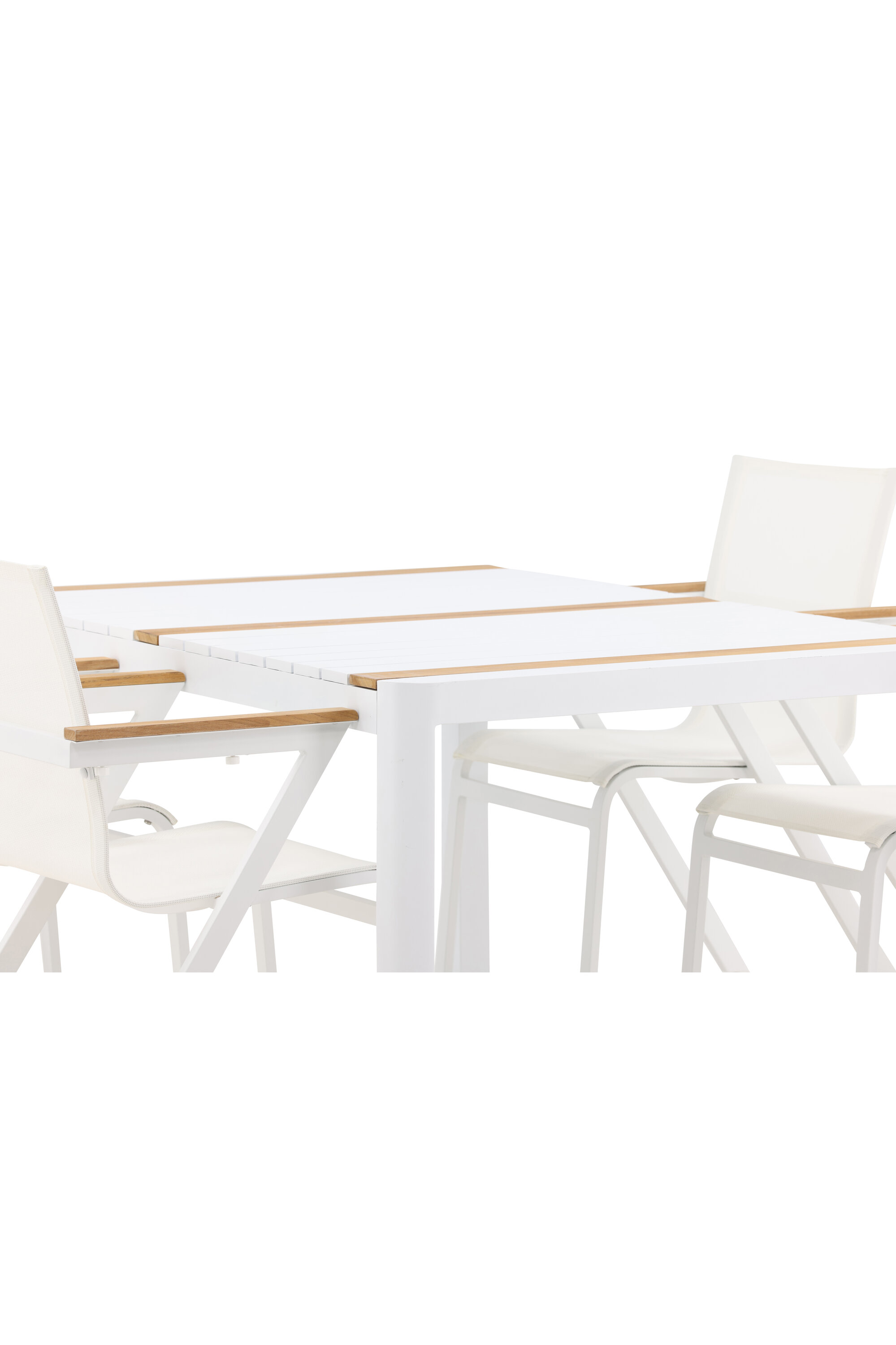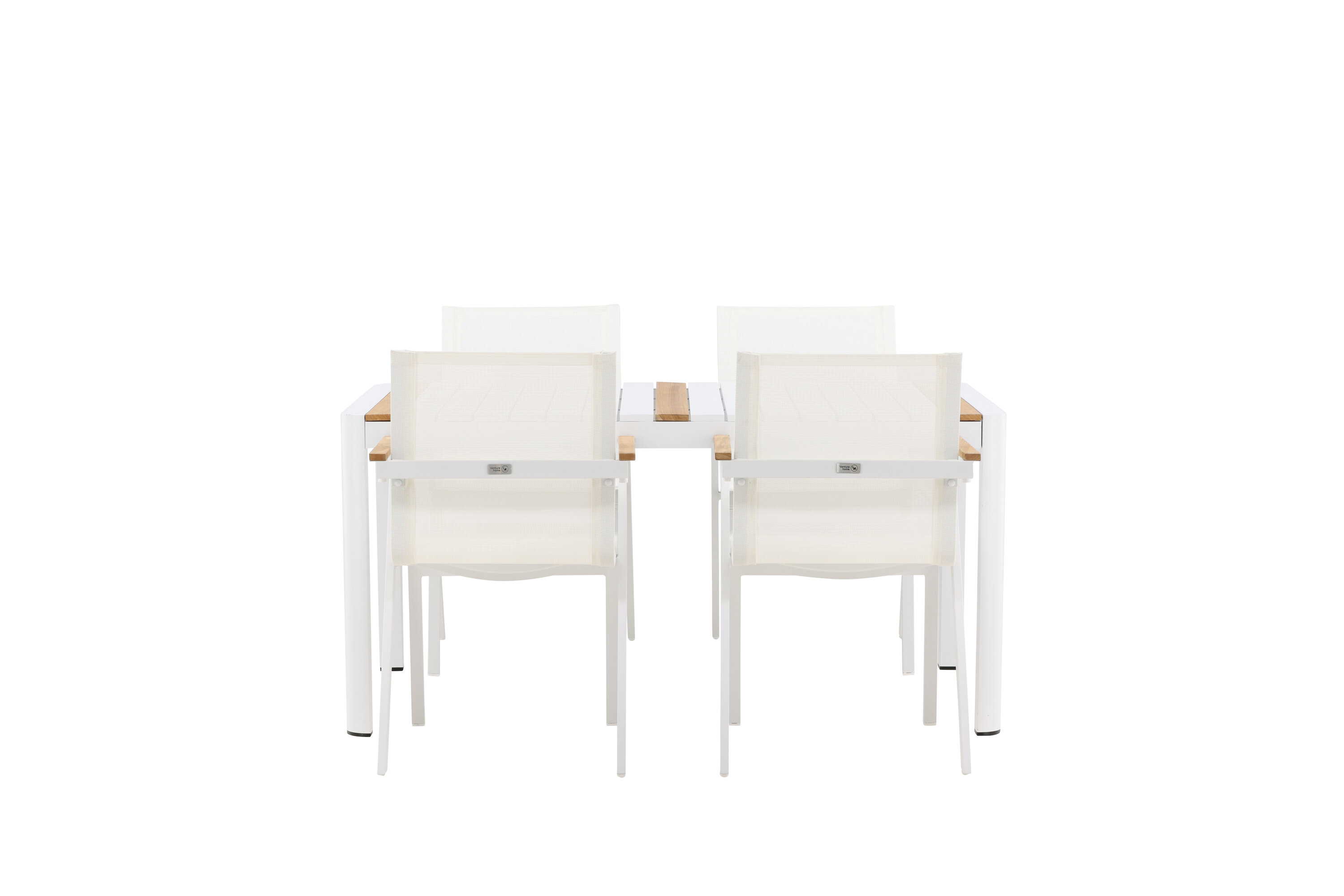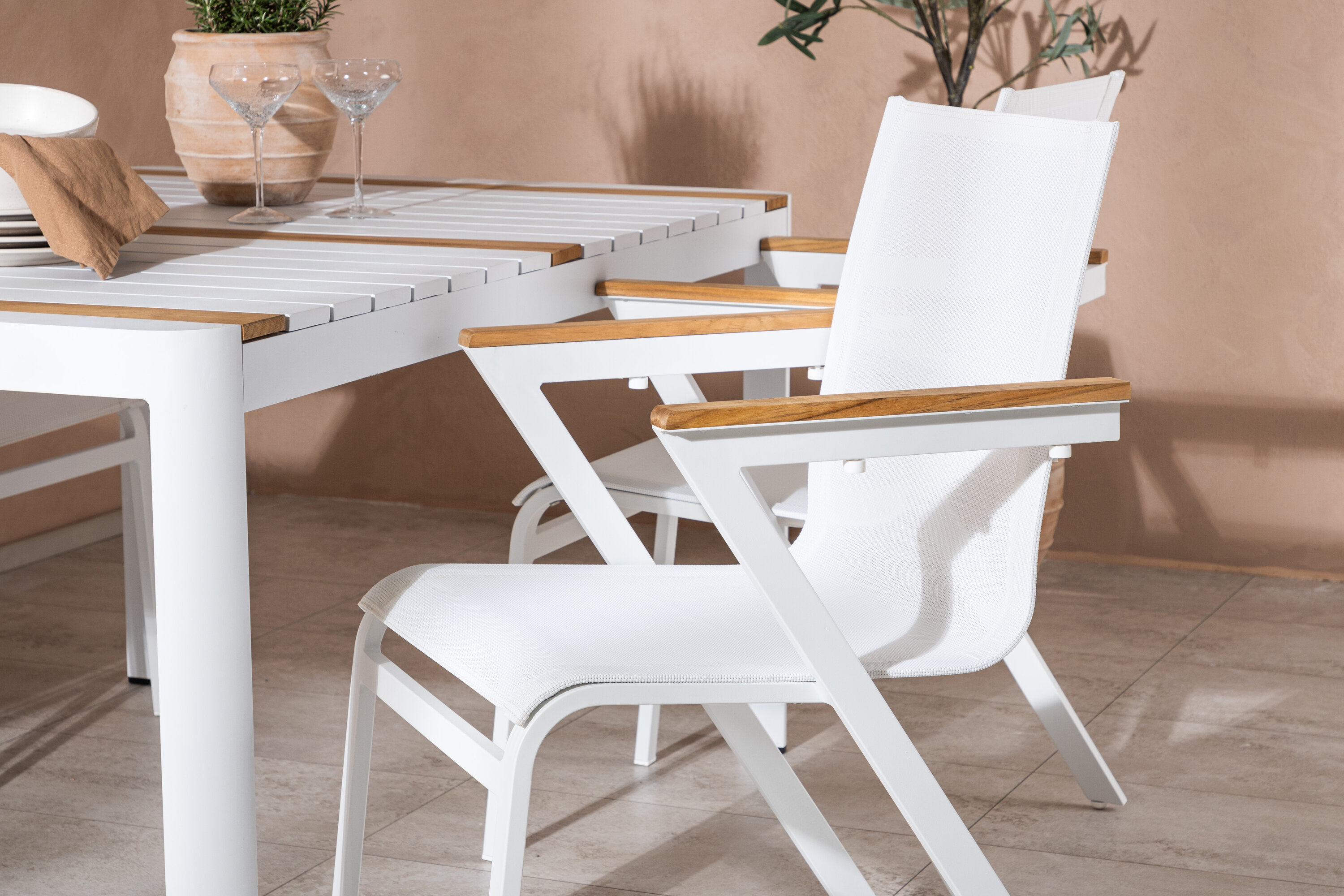 Loo trendikas -ohutu pilgupüüdja, mis avaldab muljet – see toidugrupp on sama pilkupüüdev kui vastupidav! Söögilaual Togo on maitsekas versioon valgest ja puidust tiikpuust ristkülikukujulise lauaplaadi ja valge alumiiniumist alusvankriga. Mõõdud: 150×100 cm. Siin Smaster kombinatsioonis Skandinaavia disainiga söögitoolidega sarjast Mexico. Valmistatud valgest alumiiniumist, iste tekstiilist ja käetoed dekoratiivsest tiikpuust, mis on kena, kokkusobiv detail. Tool on ladusaks hoiustamiseks virnastatav. Siin istute kaua ja naudite suveõhtuid!