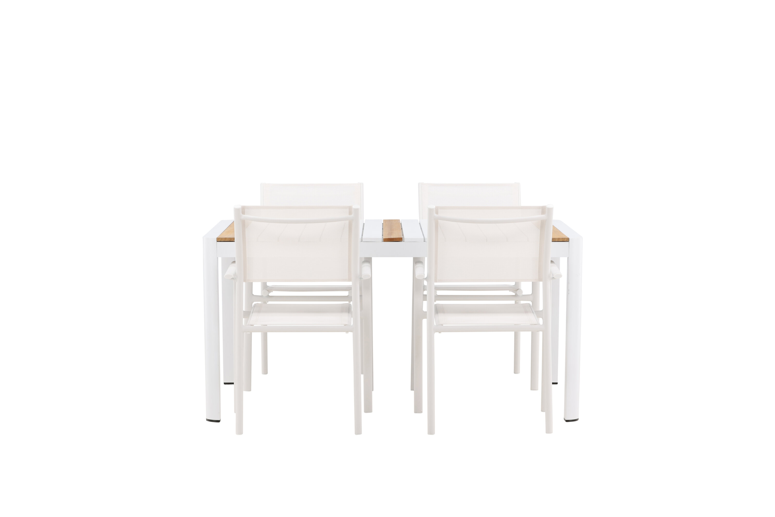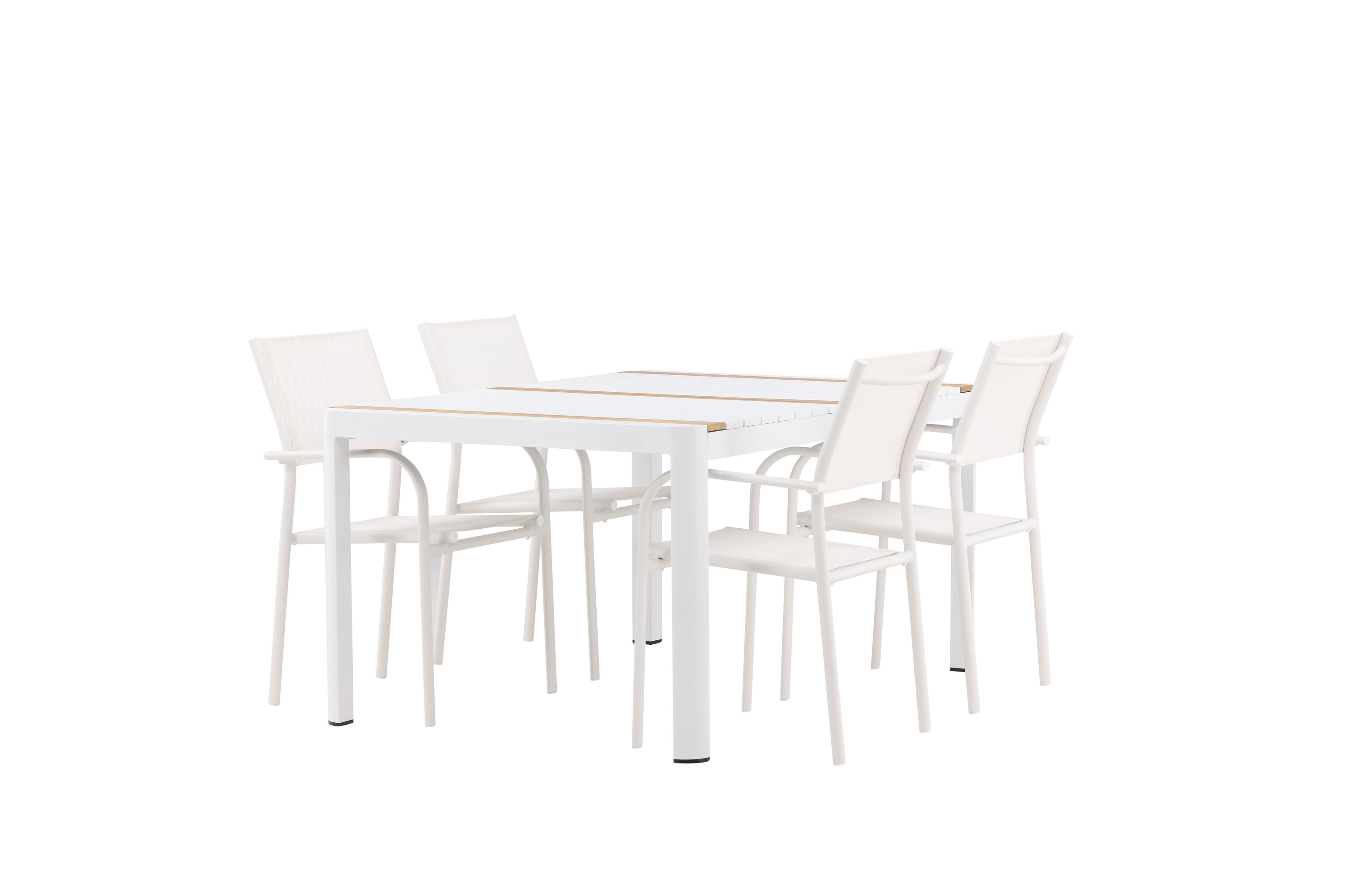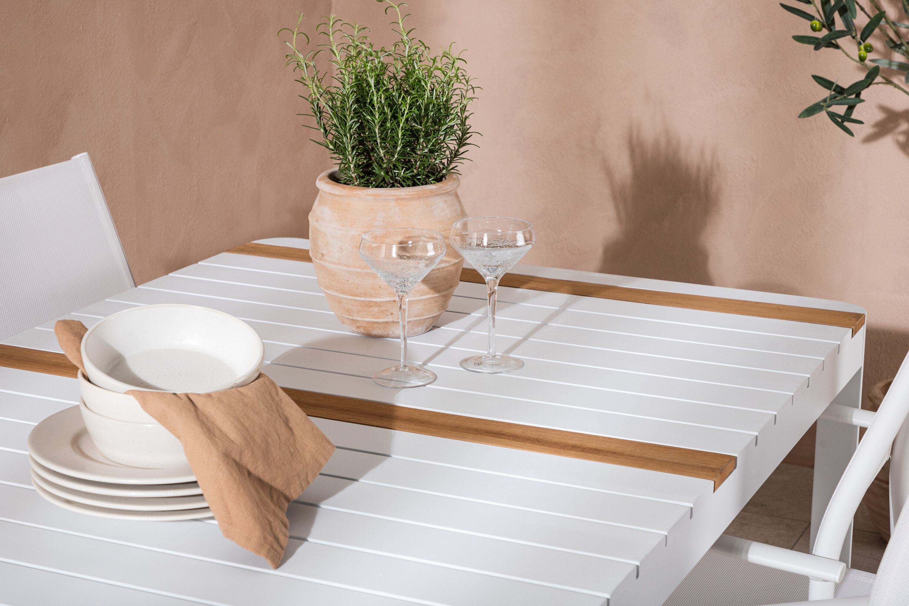 Loo elegantne pilgupüüdja, mis avaldab muljet – see toidugrupp on sama pilkupüüdev kui vastupidav! Söögilaual Togo on maitsekas versioon valgest ja puidust tiikpuust ristkülikukujulise lauaplaadi ja valge alumiiniumist alusvankriga. Mõõdud: 150×100 cm. Siin moodsas kombinatsioonis valgete söögitoolidega sarjast Santorini. Toolidel on põhjamaised sirged kujundid integreeritud alumiiniumist käetugedega ja valgest tekstiilist istmega. Need on ka virnastatavad praktiliseks hoiustamiseks. Kutsu ees palju meeldivaid eineid!