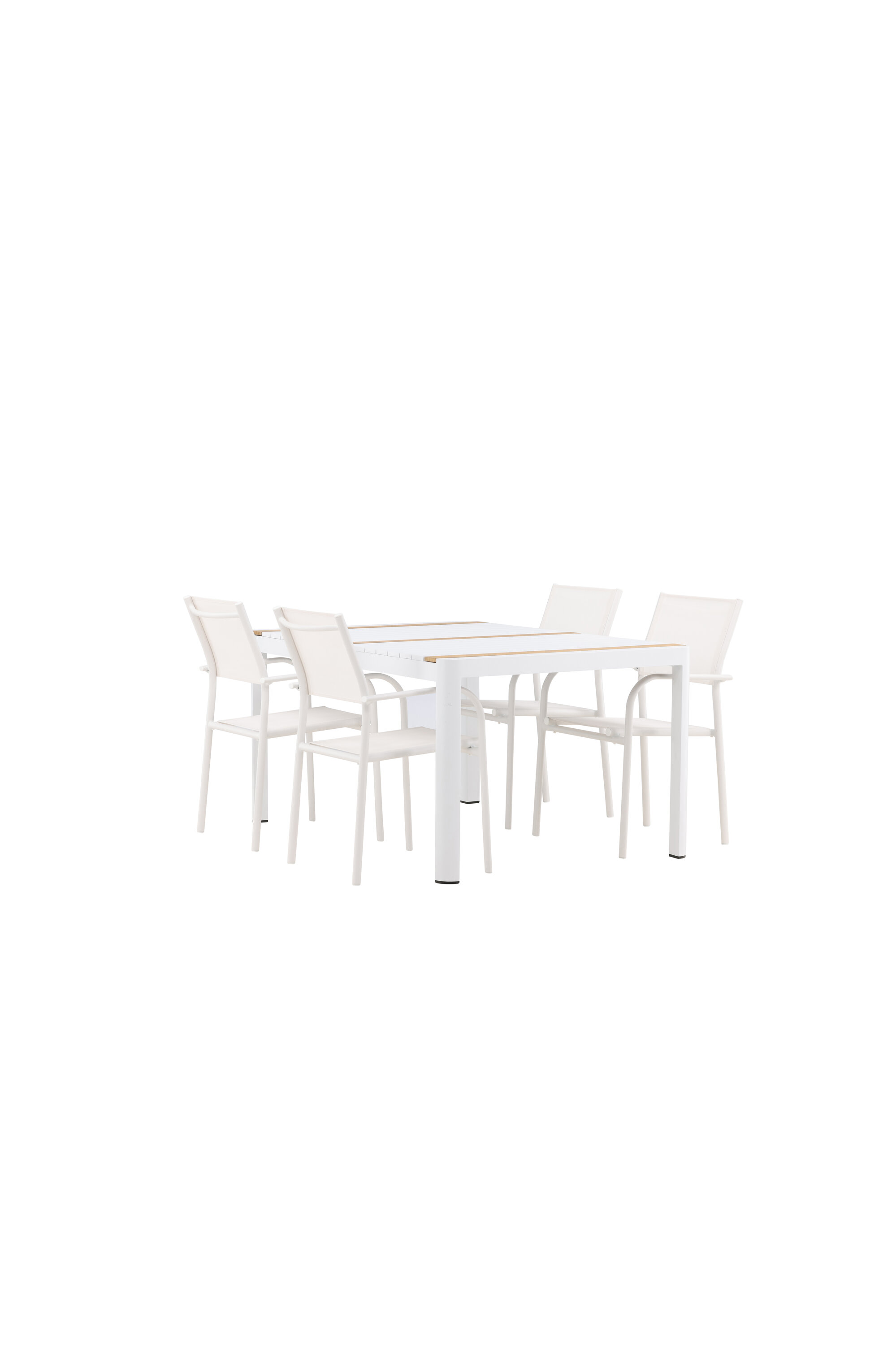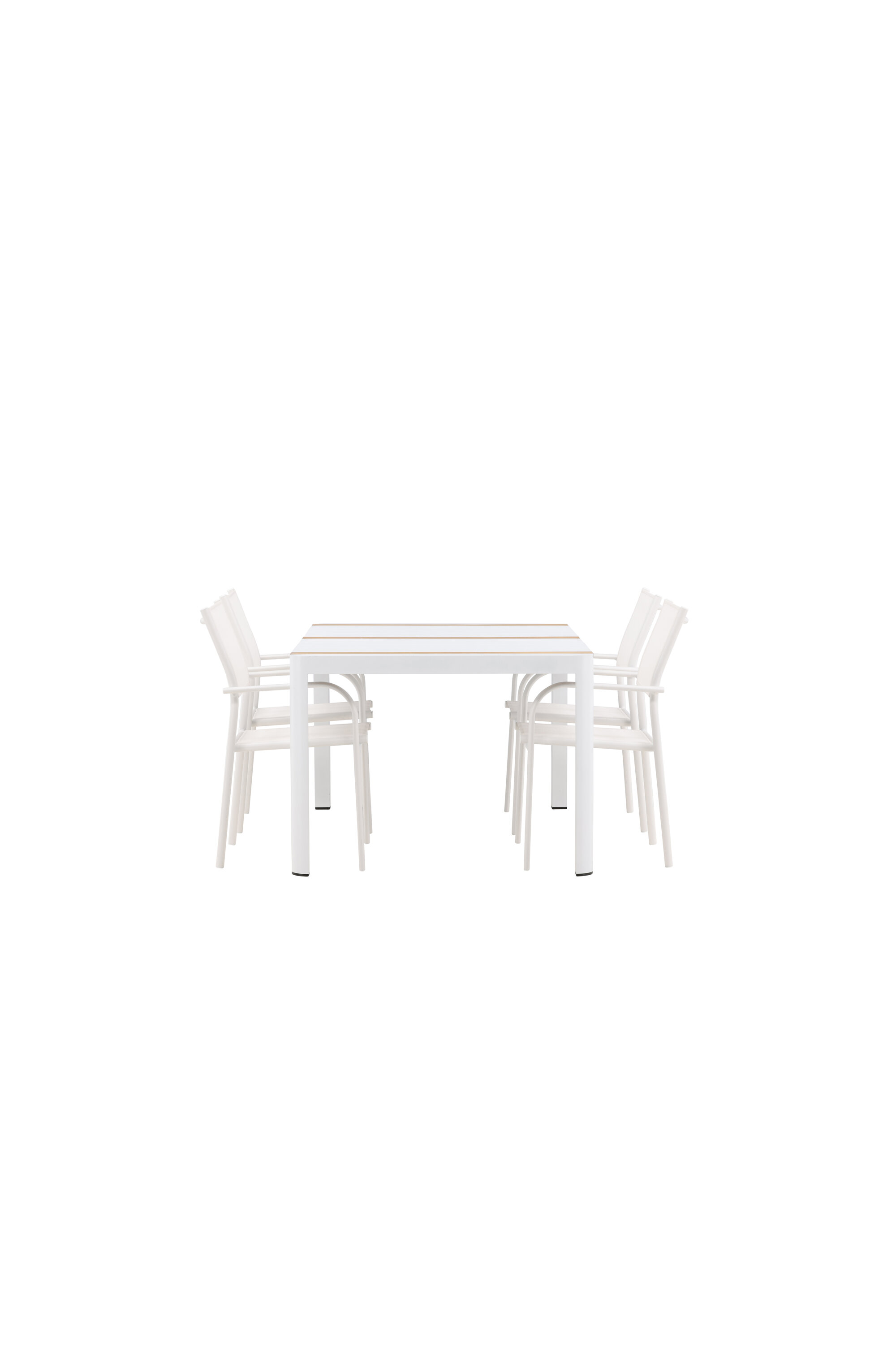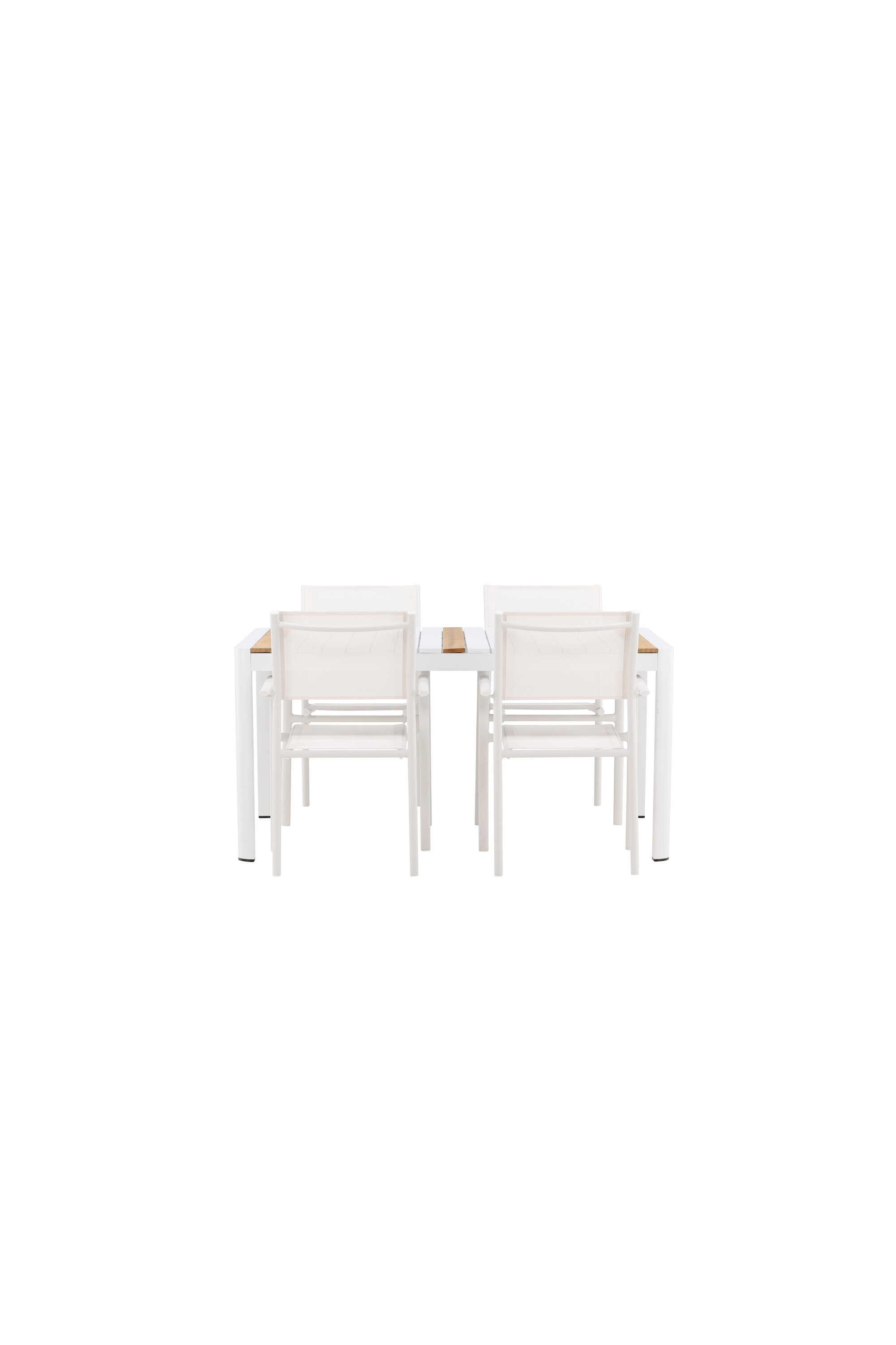 Loo elegantne pilgupüüdja, mis avaldab muljet – see toidugrupp on sama pilkupüüdev kui vastupidav! Söögilaual Togo on maitsekas versioon valgest ja puidust tiikpuust ristkülikukujulise lauaplaadi ja valge alumiiniumist alusvankriga. Mõõdud: 150×100 cm. Siin moodsas kombinatsioonis valgete söögitoolidega sarjast Santorini. Toolidel on põhjamaised sirged kujundid integreeritud alumiiniumist käetugedega ja valgest tekstiilist istmega. Need on ka virnastatavad praktiliseks hoiustamiseks. Kutsu ees palju meeldivaid eineid!