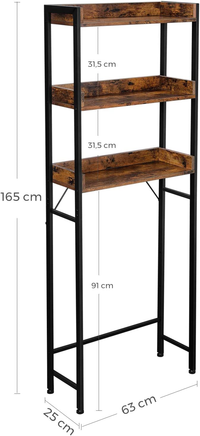 Toote andmed: Värvus: Vintage pruun-must Materjal: Puitlaastplaat, teras Mõõtmed: 63 x 25 x 165 cm (P x L x K). Kaal: 10,2 kg. Maksimaalne staatiline kandevõime: 15 kg. Karbi sisu: 1 x WC-riiul, 1 x tarvikute pakett, 1 x kaldekaitse, 1 x juhend (saksa, inglise, prantsuse, itaalia keeles).