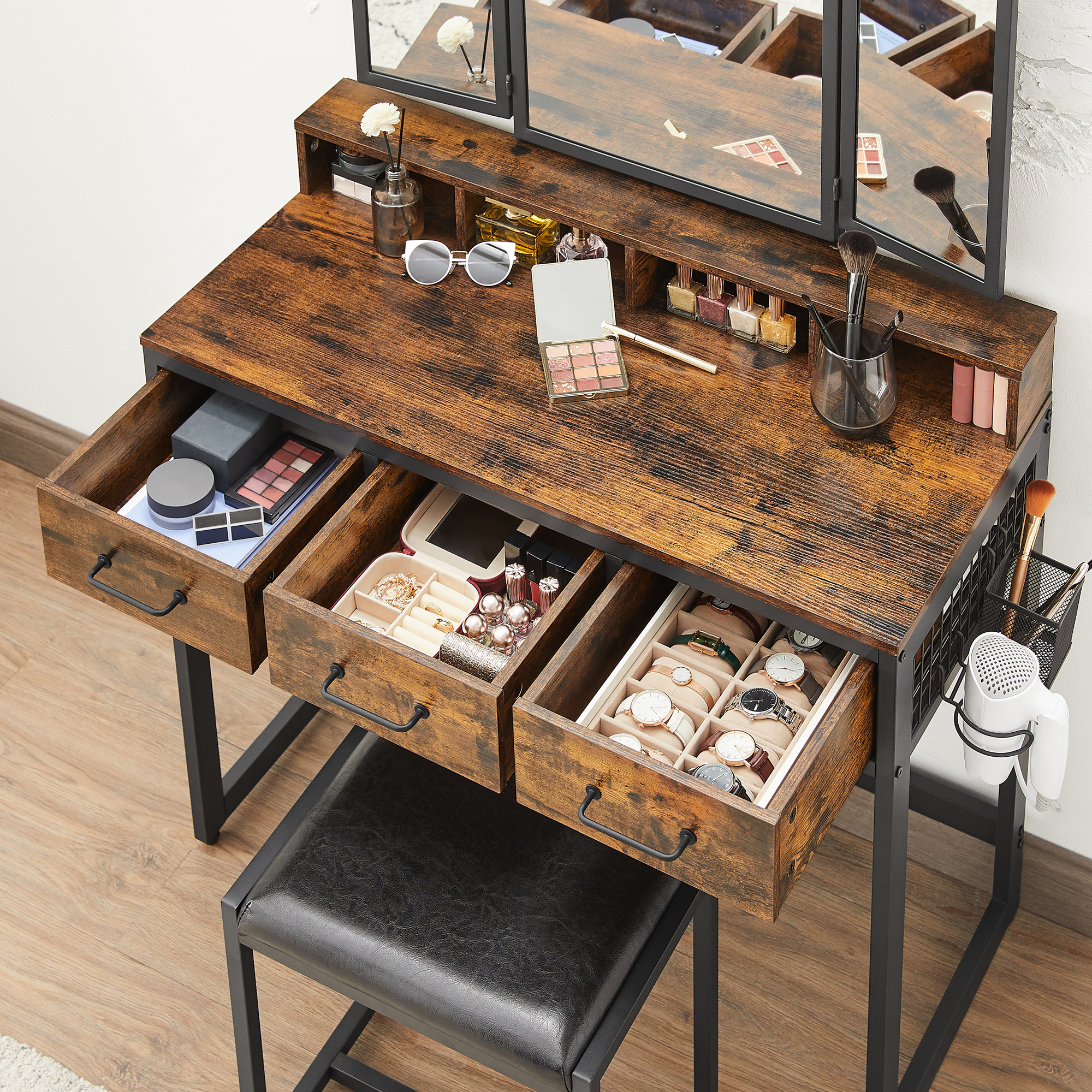Spetsifikatsioonid: – Värvus: maalähedane pruun, must – Materjal: puitlaastplaat, teras, klaas, sünteetiline nahk, poroloon – Laua mõõdud: 90 x 40 x 141 cm (P x L x K) – Tabureti mõõdud: 42 x 28,6 x 42,5 cm (P x L x K) – Toote kaal: 25,7 kg – Tabureti maksimaalne staatiline kandevõime: 150 kg Pakisisu: – 1 x tualettlaud – 1 x taburet – 1 x tarvikute komplekt – 1 x juhend (EN, DE, FR, ES, IT)