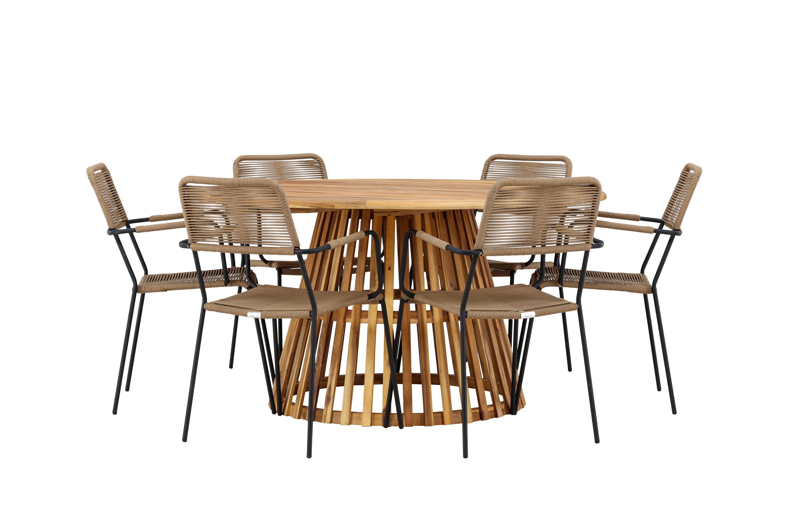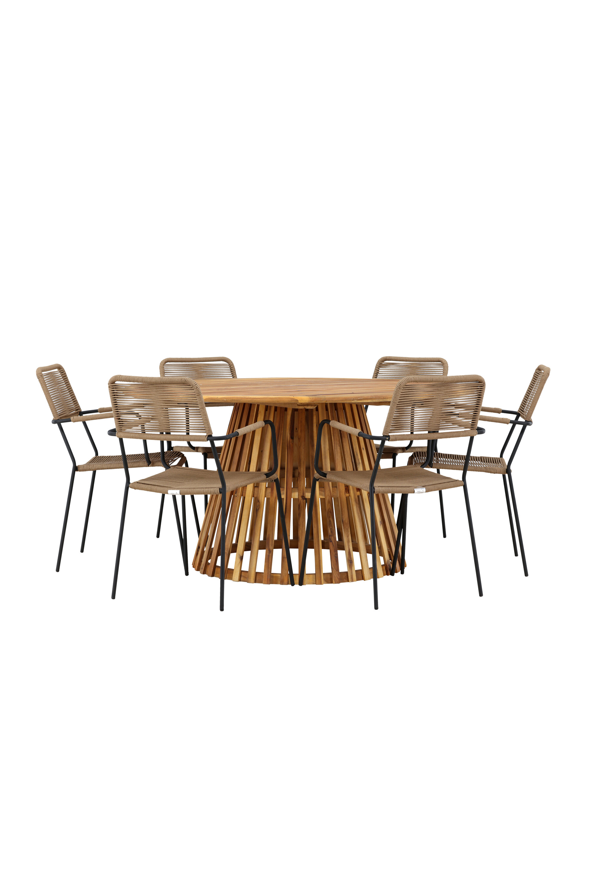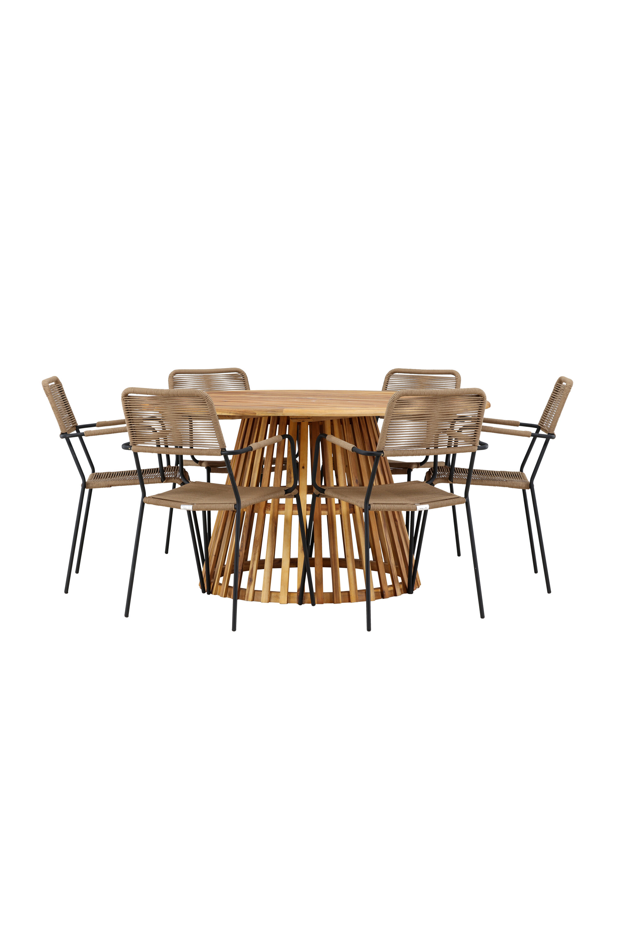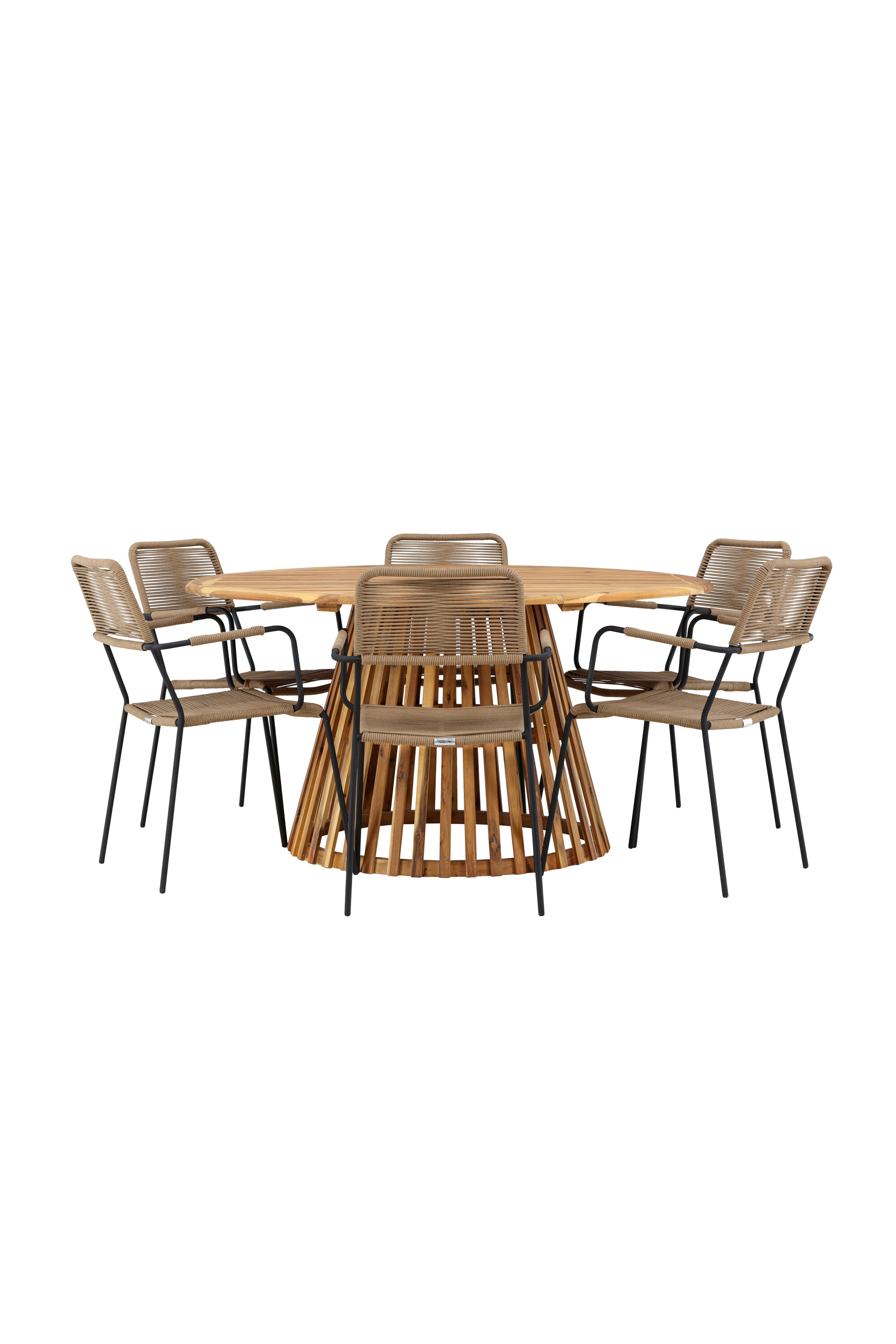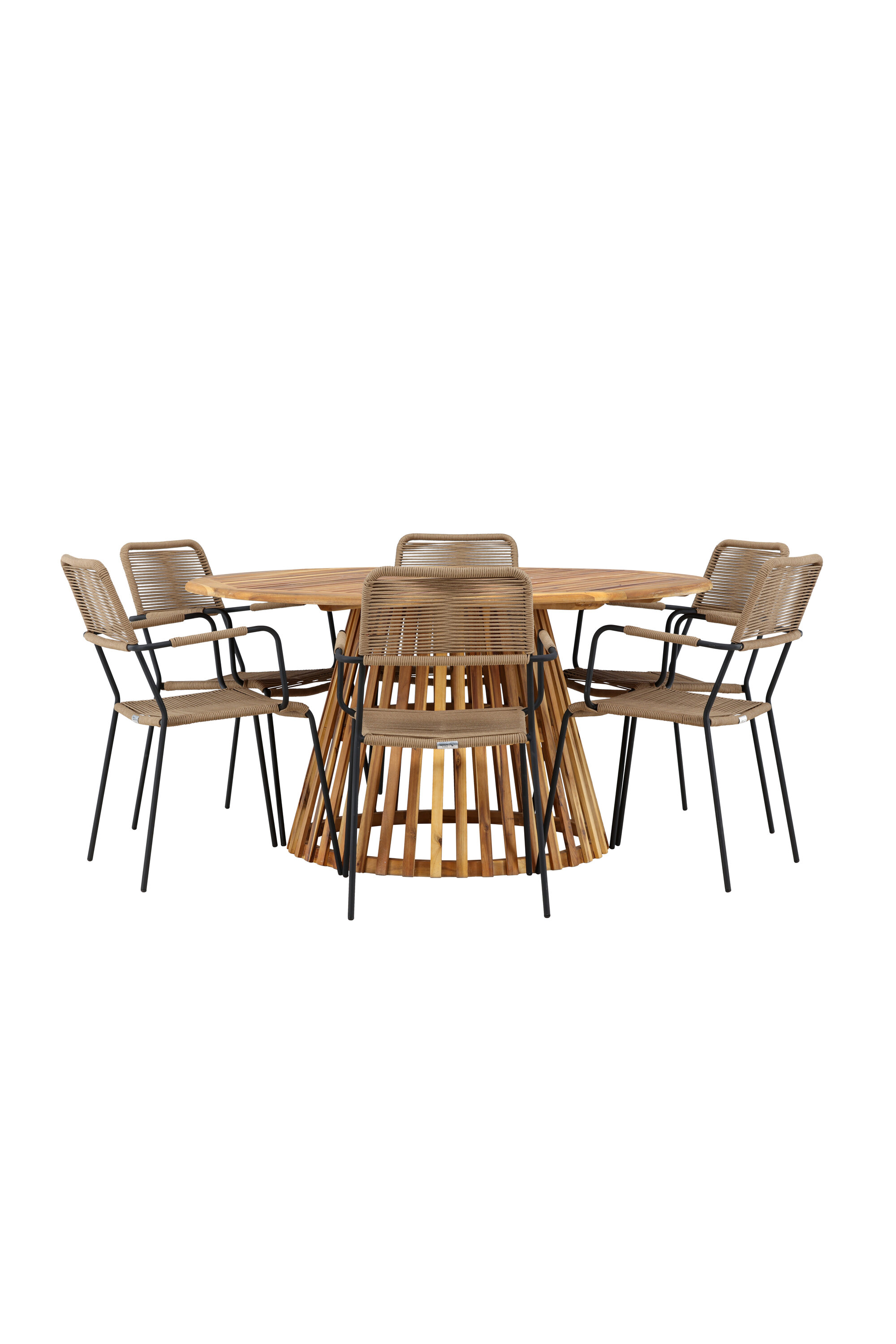 Meie elegantse Tucumáni laua ja stiilsete Lindose toolidega avastage oma väliruumi jaoks ideaalne söögikomplekt. Muljetavaldava 120 cm läbimõõduga laud Tucumán pakub rohkelt ruumi perekondlikeks õhtusöökideks ja mõnusaks koosviibimiseks lageda taeva all.