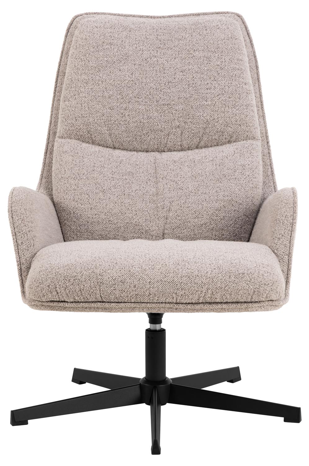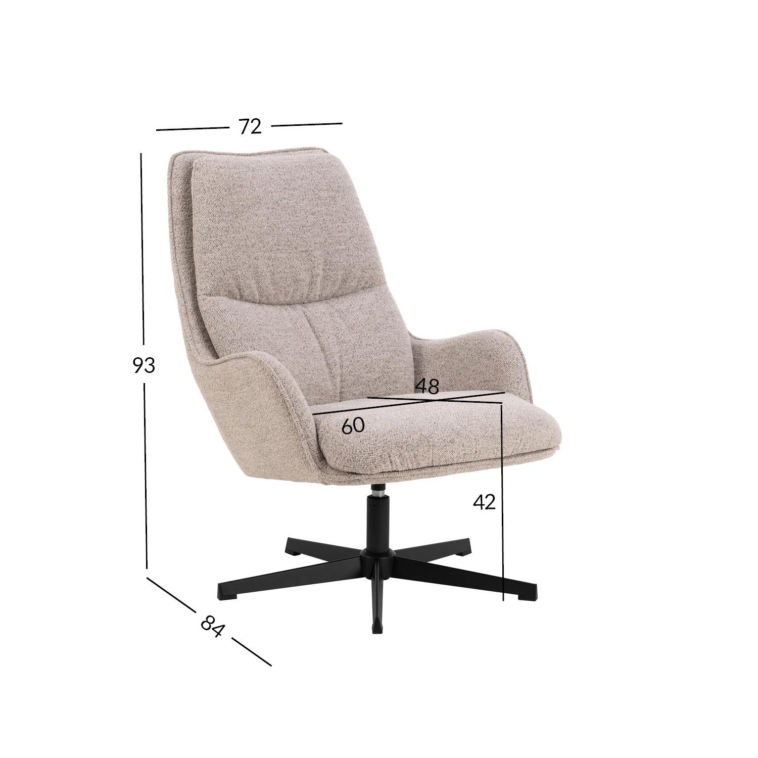 Tugitool mõjub kutsuvana. Kergelt kumer iste on kaetud beeži bukleelaadse kangaga. Toolil on must terasest pöörlev alus. Tool on kaasaegse disainiga ja võimendab seda tunnetust ka interjööris. Mõõdud on 72x84xH93cm.