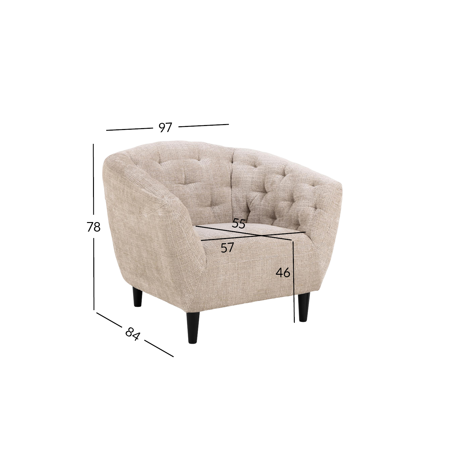 Tugitoolist õhkub klassikalist esteetikat. Pocket-vedrud muudavad istumise mugavamaks. Tugitool on kaetud beeži kangaga. Jalad on valmistatud mustaks lakitud kummipuidust. Mõõdud on 97x84xH78cm.
