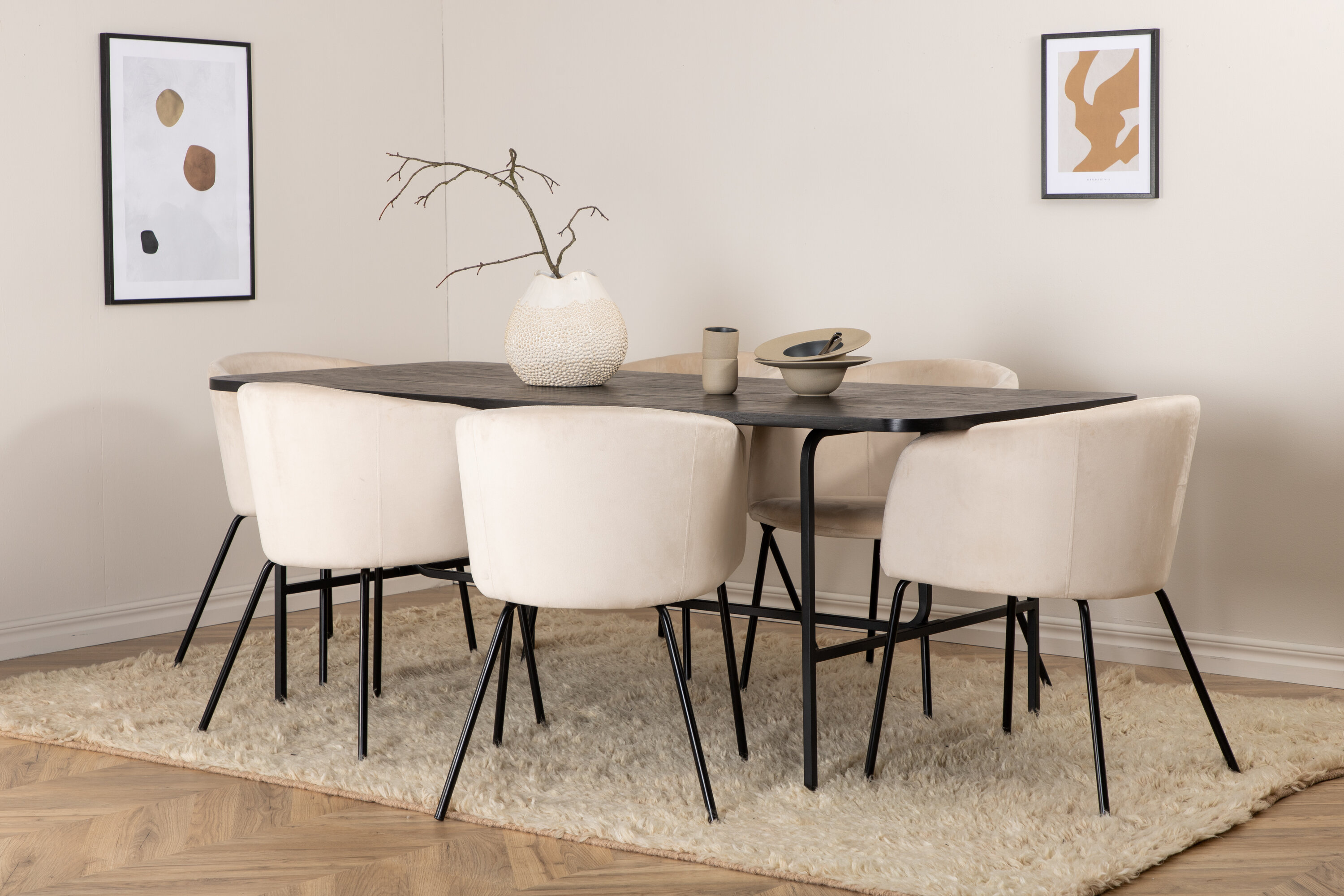 Meie populaarne söögilaud Uno on sama stiilne kui ajatu! Laud on ristkülikukujulise disainiga kergelt ümarate nurkadega, pealisplaat mustast spooniga MDF-ist ja stiilne mustast metallist alumine osa. Laua mõõdud: pikkus: 200 cm, laius: 90 cm, kõrgus: 74 cm. Siin on ideaalne kombinatsioon 6 beežist sametkangast Berit söögitooliga ja stiilsete kitsaste mustast rauast toolijalgadega. Tooli mõõdud: kõrgus: 78 cm, istme kõrgus: 49 cm, laius: 55 cm, sügavus: 55 cm. Mugavusele ja elegantsile keskenduv toidugrupp!