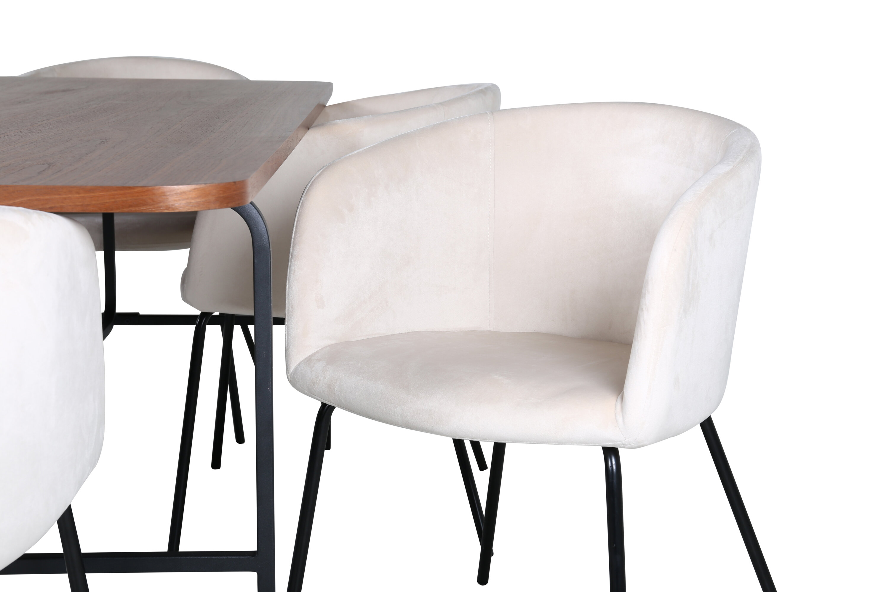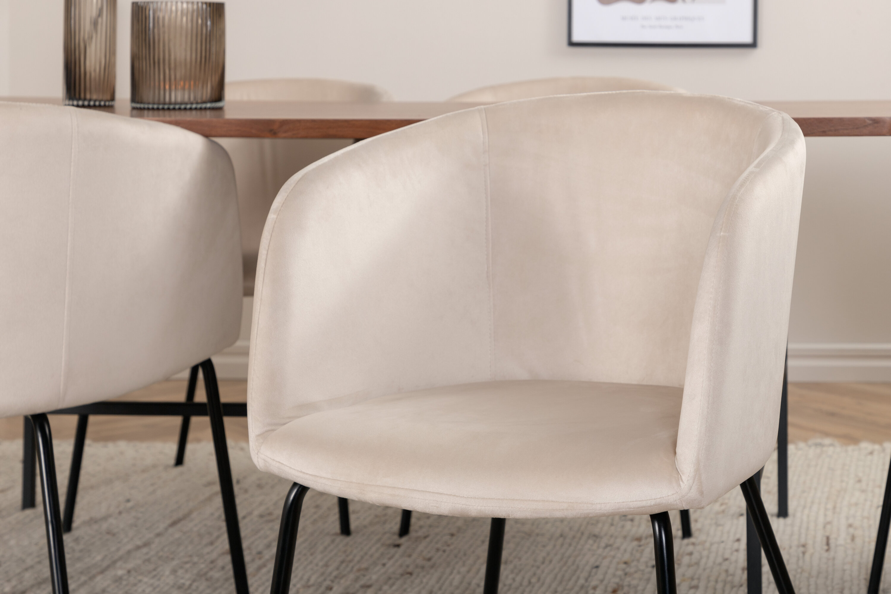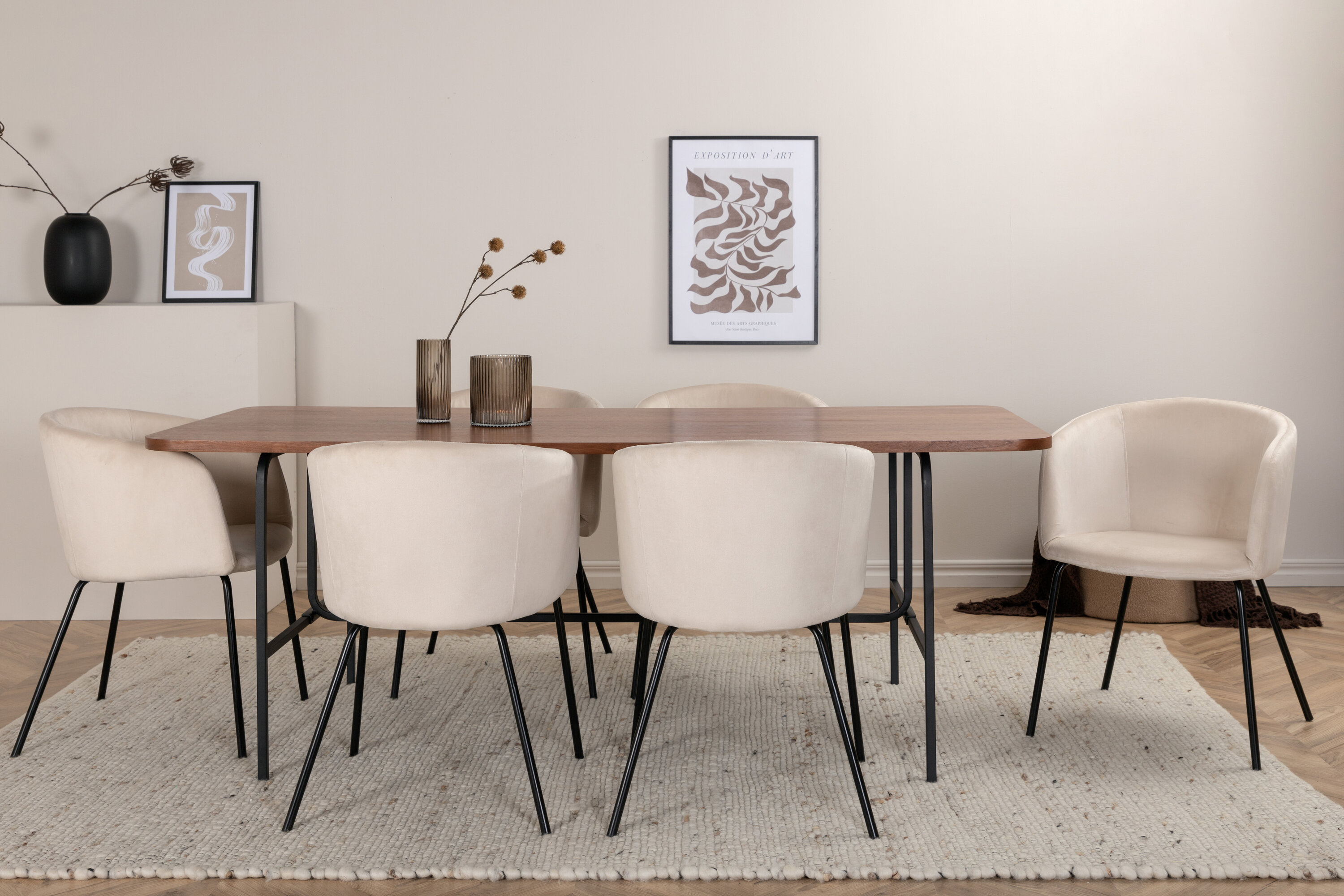 Meie populaarne söögilaud Uno on sama stiilne kui ajatu! Laud on ristkülikukujulise disainiga kergelt ümarate nurkadega, pähklivärvi MDF-plaadi pealisplaat spooniga ja stiilne mustast metallist veermik. Laua mõõdud: pikkus: 200 cm, laius: 90 cm, kõrgus: 74 cm. Siin on ideaalne kombinatsioon 6 beežist sametkangast Berit söögitooliga ja stiilsete kitsaste mustast rauast toolijalgadega. Tooli mõõdud: kõrgus: 78 cm, istme kõrgus: 49 cm, laius: 55 cm, sügavus: 55 cm. Mugavusele ja elegantsile keskenduv toidugrupp!
