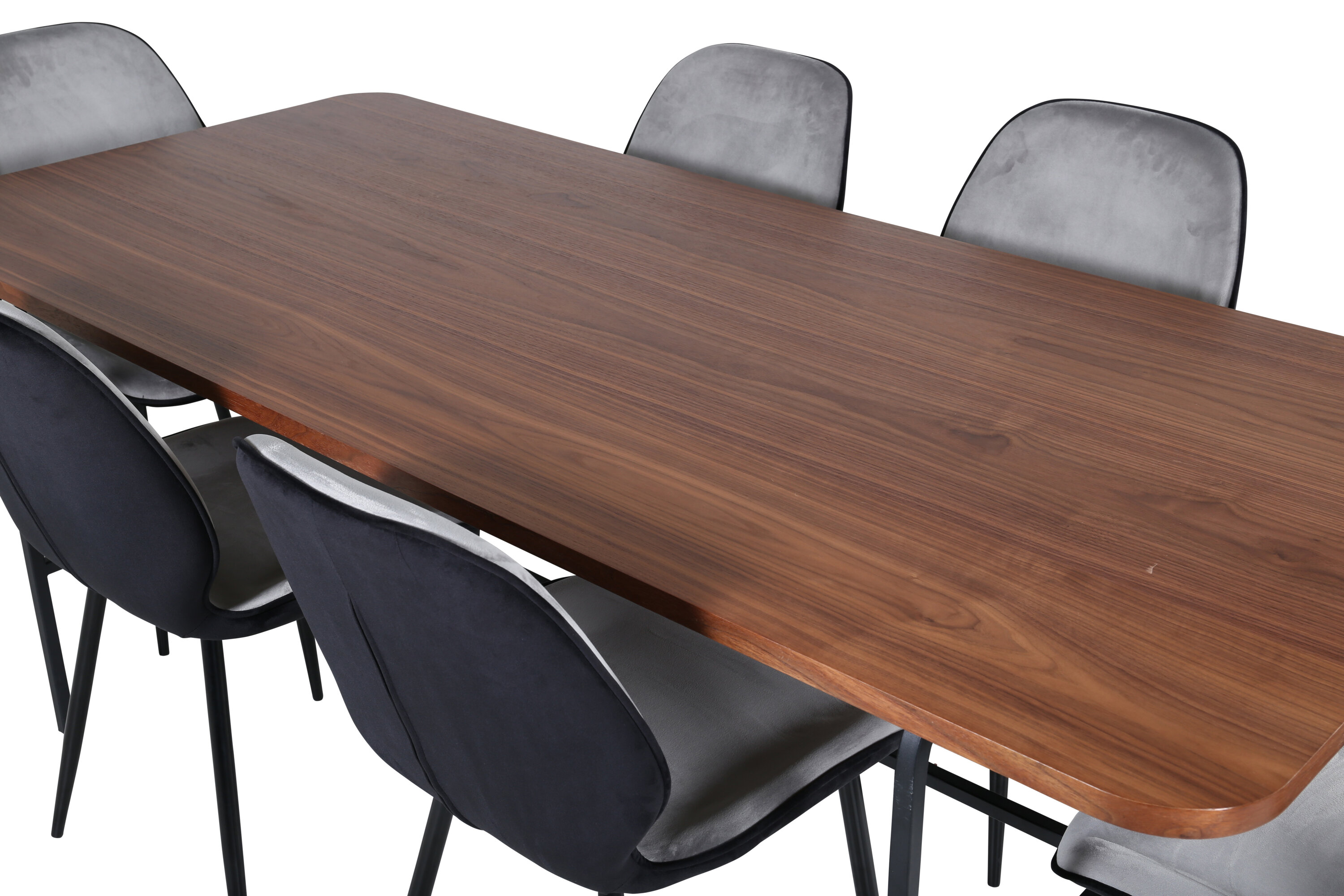 Meie populaarsed söögitoolid Emma Smaster Design! Toolidel on kujundlik ja stiilne disain, mille iste on helehallist sametist ja seljatugi mustast sametist ning toolijalad on rauast. Tooli mõõdud: kõrgus: 89 cm, istme kõrgus: 45 cm, laius: 47 cm, sügavus: 57 cm. Siin on 6 söögitooli sobitatud ümber söögilaua uno – sama trendikas kui ajatu! Laud on ristkülikukujulise disainiga kergelt ümarate nurkadega, pähklivärvi MDF-plaadi pealisplaat spooniga ja stiilne mustast metallist veermik. Laua mõõdud: pikkus: 200 cm, laius: 90 cm, kõrgus: 74 cm. Looge pere ja sõprade kogumiseks meeldiv keskpunkt!