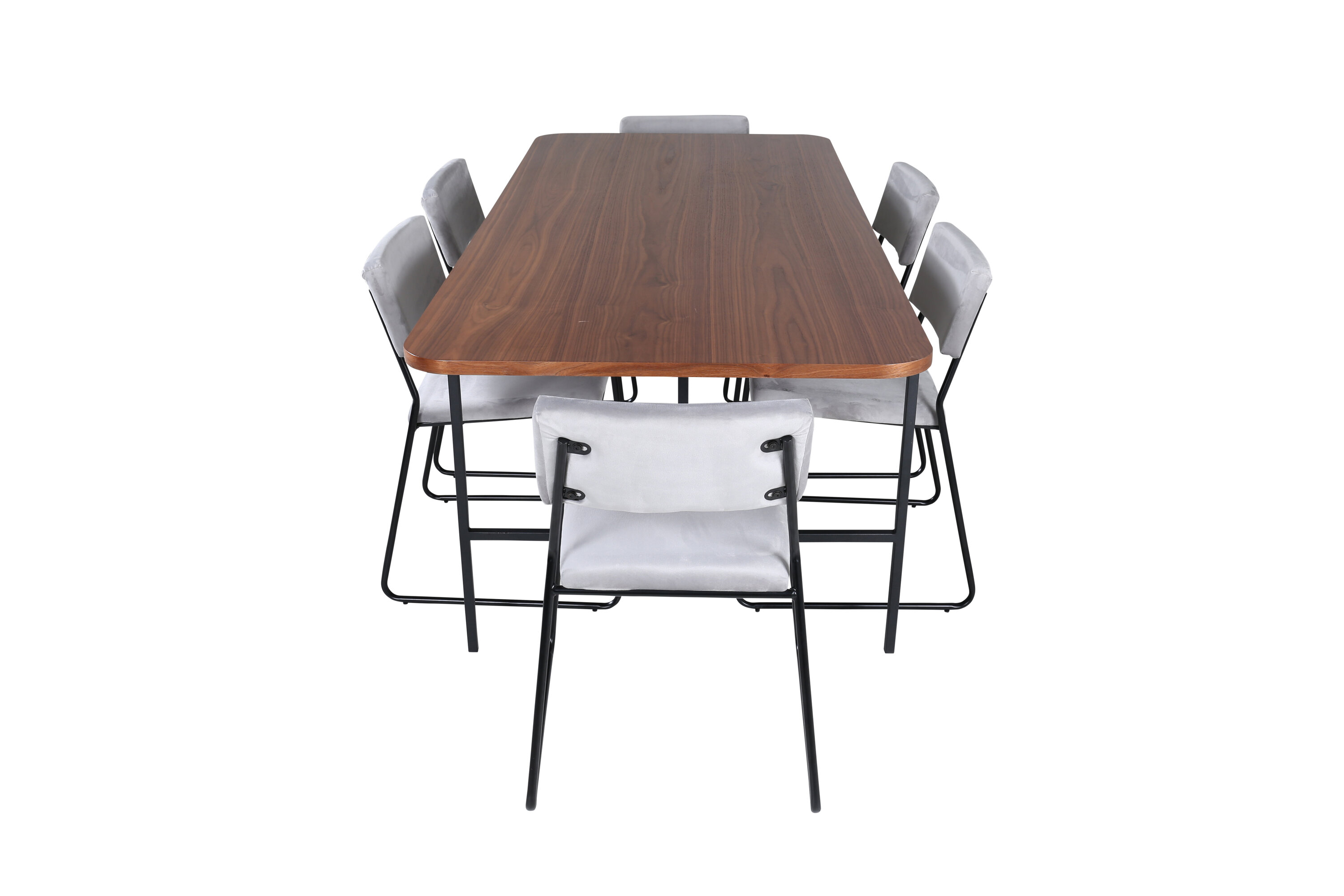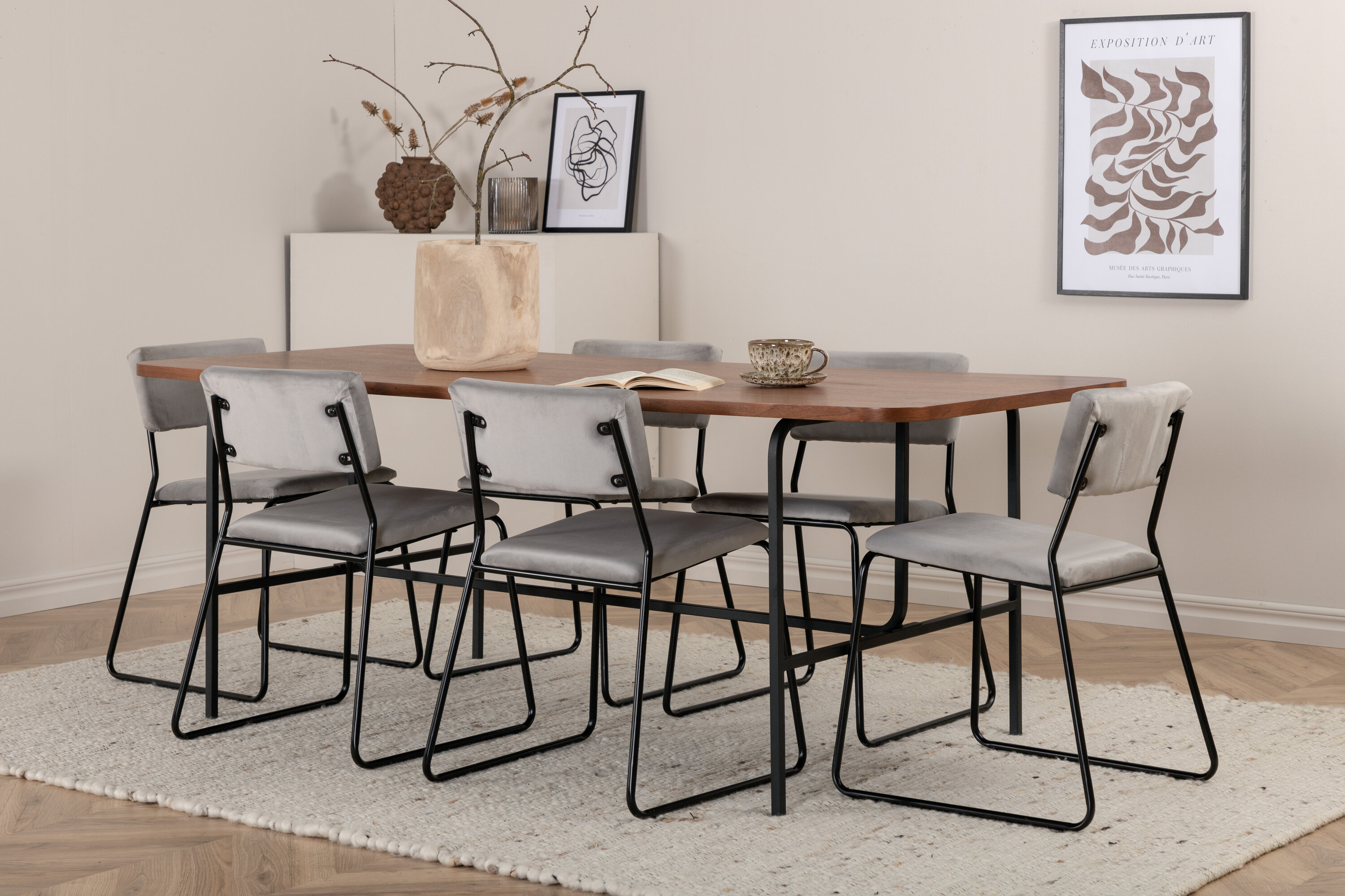 Stiilne ja õhuline toidugrupp igaks juhuks – sisusta elutuba nutikalt ja kutsuvalt! Söögilaud Uno on ristkülikukujulise disainiga kergelt ümarate nurkadega, pähklivärvi MDF-plaadi pealisplaat spooniga ja stiilne mustast metallist veermik. Laua mõõdud: pikkus: 200 cm, laius: 90 cm, kõrgus: 74 cm. Siin sihvakas kombinatsioonis 6 minimalistliku disainiga Kenth söögitooliga. Toolijalad on stiilselt kitsad mustast rauast ja istmed hallist sametkangast. Tooli mõõdud: kõrgus: 76 cm, istme kõrgus: 48,5 cm, laius: 40 cm, sügavus: 52 cm. Nautige ees ootavaid mõnusaid eineid!
