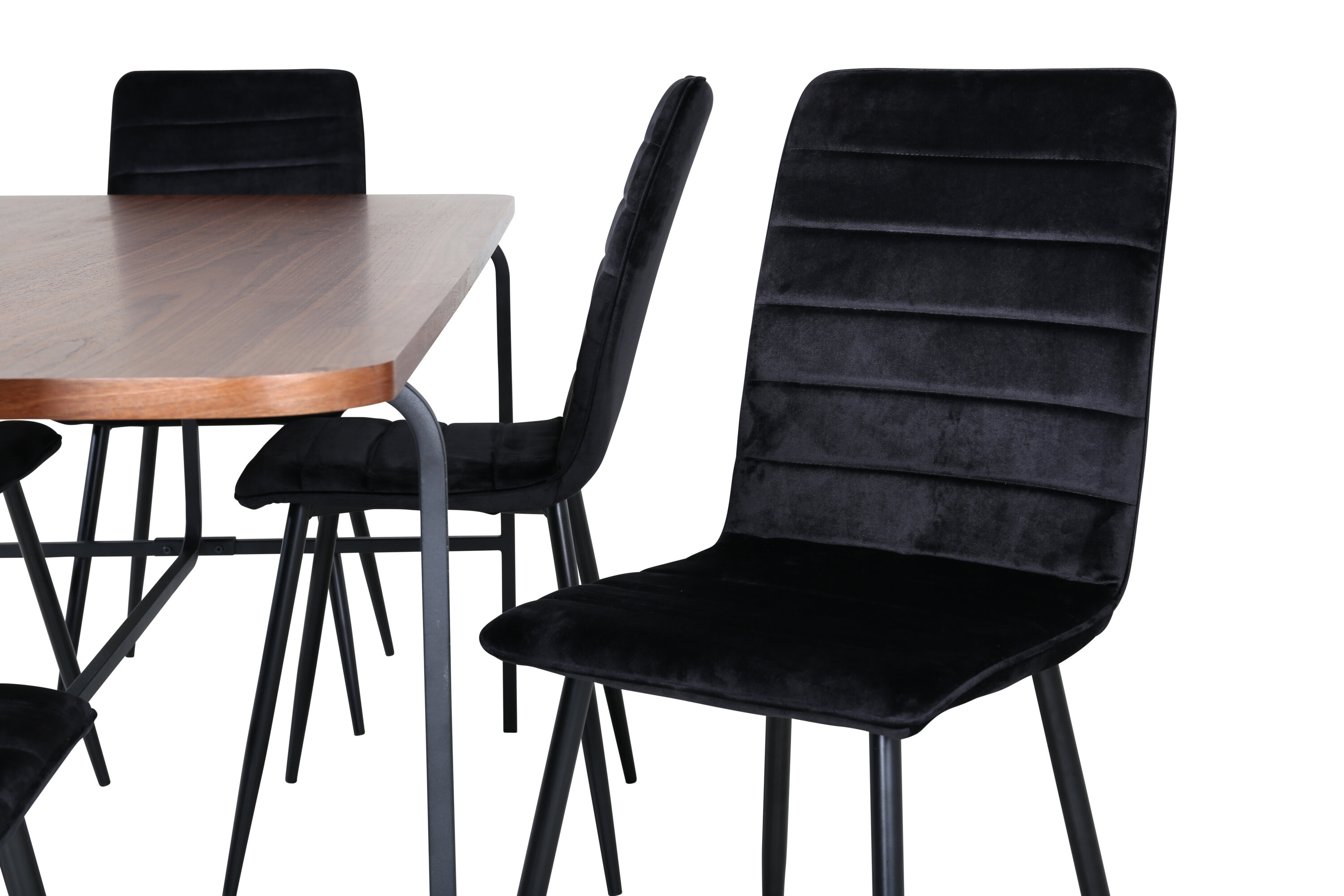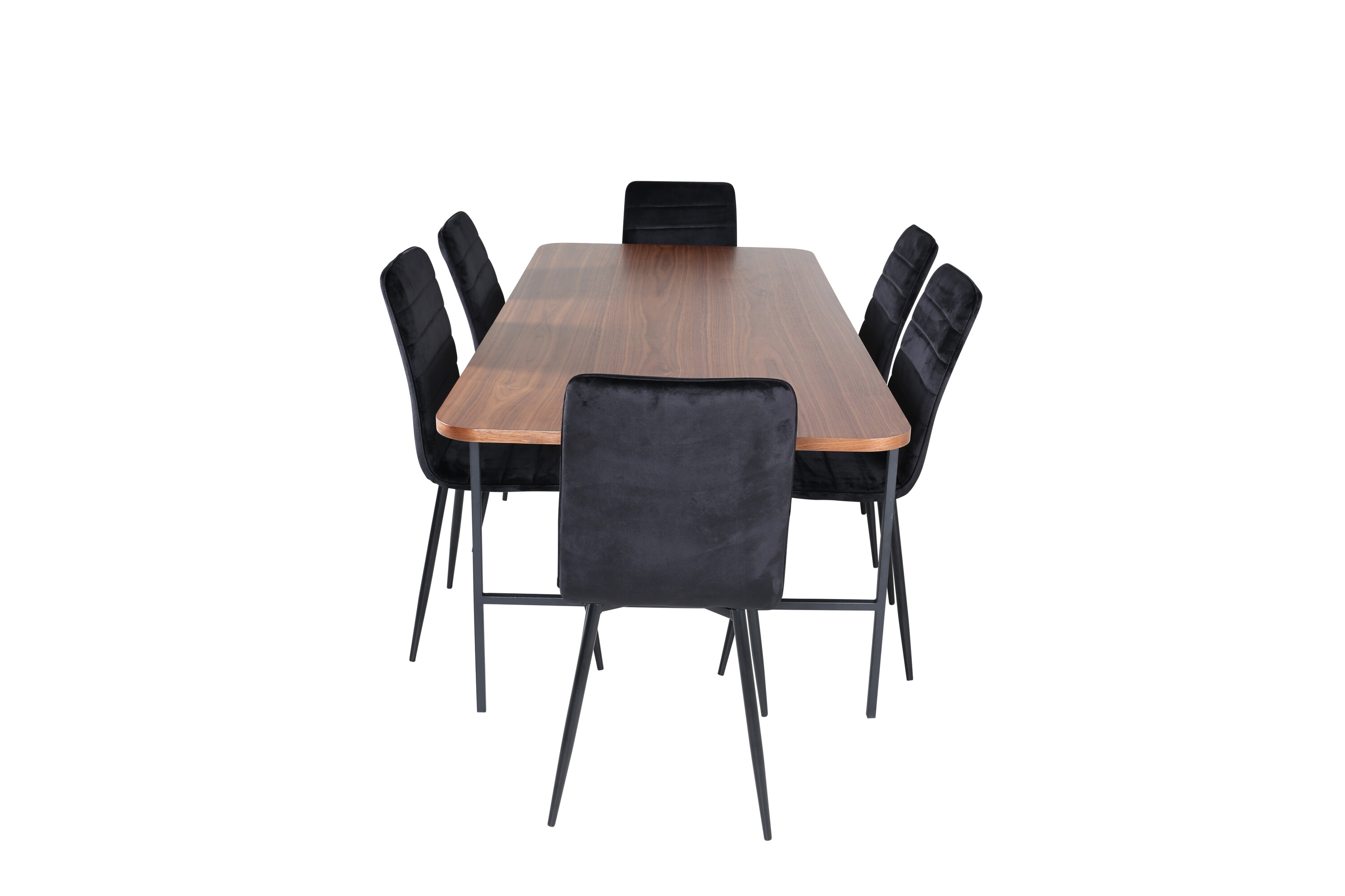 Pilkupüüdev toidugrupp, mis keskendub mugavusele ja elegantsile! Söögilaud Uno on ristkülikukujulise disainiga kergelt ümarate nurkadega, pähklivärvi MDF-plaadi pealisplaat spooniga ja stiilne mustast metallist veermik. Laua mõõdud: pikkus: 200 cm, laius: 90 cm, kõrgus: 74 cm. Siin sobib laud ideaalselt 6 Windu luksuslikust mustast sametisest kangast söögitooliga ja rauast toolijalad. Tooli mõõdud: kõrgus: 94 cm, istme kõrgus: 47 cm, laius: 43 cm, sügavus: 49 cm. Saagu sellest kaunilt kokkusobivast tänapäevase tunnetusega toidugrupist loomulik kogunemispaik teie kodus.