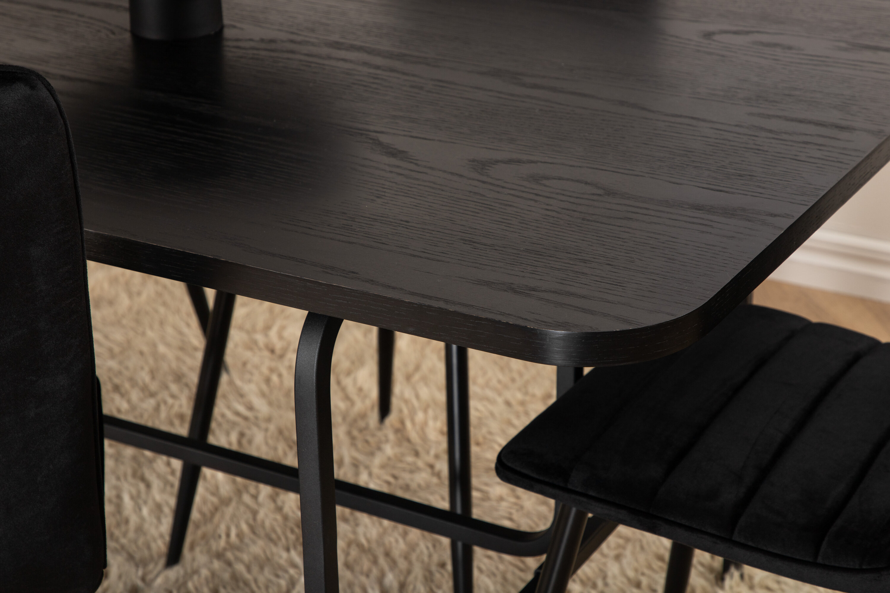 Järjepidev musta toidugrupp, mis keskendub mugavusele ja elegantsile! Söögilaud Uno on ristkülikukujulise disainiga kergelt ümarate nurkadega, pealisplaat mustast spooniga MDF-ist ja stiilne mustast metallist veermik. Laua mõõdud: pikkus: 200 cm, laius: 90 cm, kõrgus: 74 cm. Siin sobib laud ideaalselt 6 Windu luksuslikust mustast sametisest kangast söögitooliga ja rauast toolijalad. Tooli mõõdud: kõrgus: 94 cm, istme kõrgus: 47 cm, laius: 43 cm, sügavus: 49 cm. Saagu sellest kaunilt kokkusobivast tänapäevase tunnetusega toidugrupist loomulik kogunemispaik teie kodus.