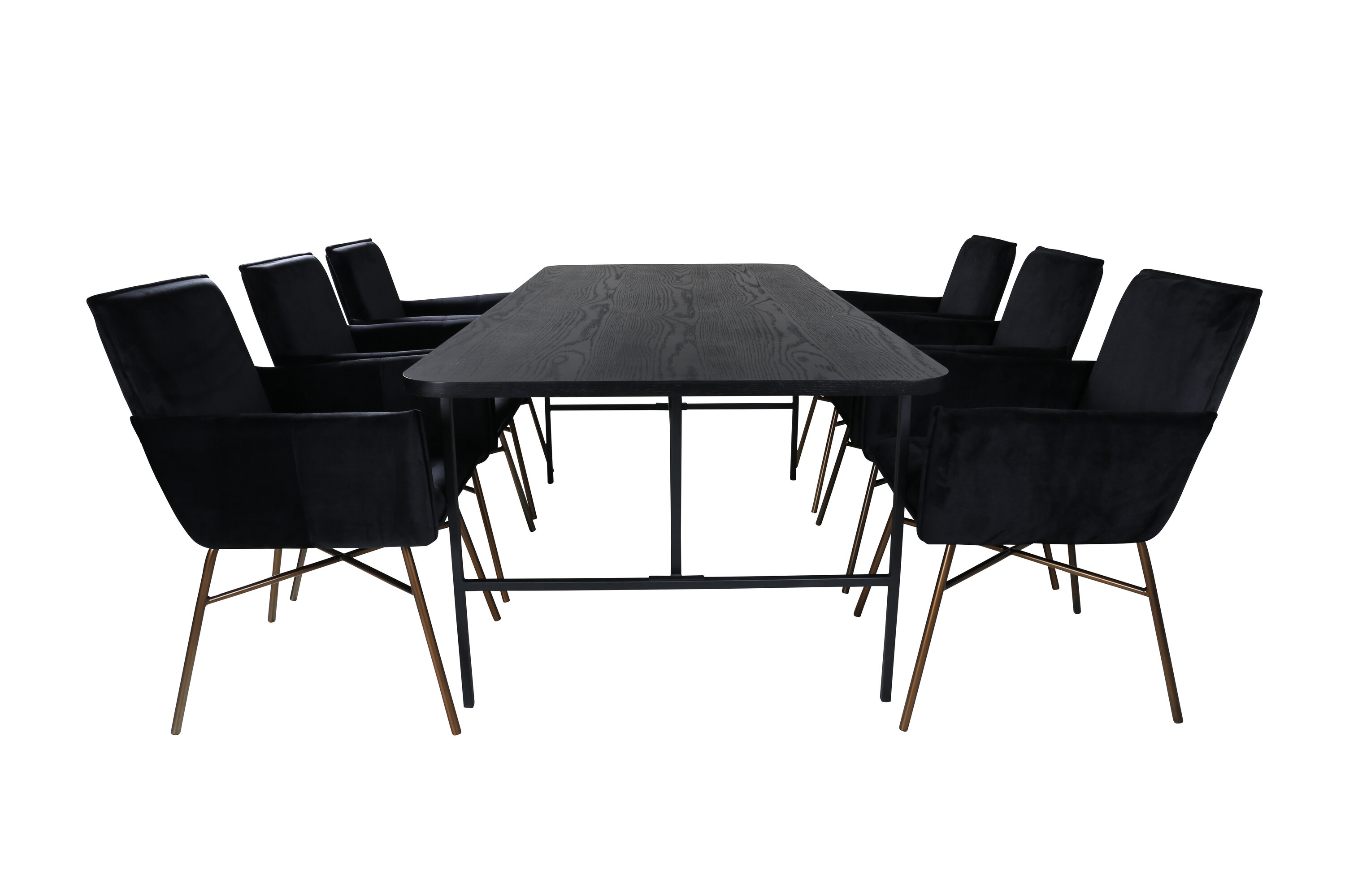 Järjepidev musta toidugrupp, mis keskendub mugavusele ja elegantsile! Söögilaud Uno on ristkülikukujulise disainiga kergelt ümarate nurkadega, pealisplaat mustast spooniga MDF-ist ja stiilne mustast metallist veermik. Laua mõõdud: pikkus: 200 cm, laius: 90 cm, kõrgus: 74 cm. Siin koos 6 mustast sametisest kangast Petra söögitooliga ja rauast toolijalgadega. Tooli mõõdud: kõrgus: 87 cm, istme kõrgus: 48 cm, laius: 57 cm, sügavus: 60 cm. Toolide kõrge mugavus kutsub teid koos pikkadele meeldivatele einetele.