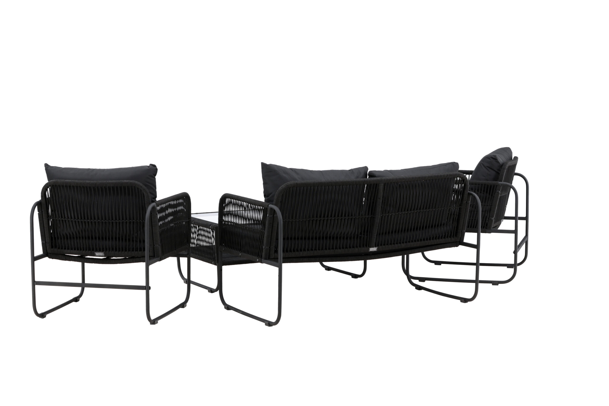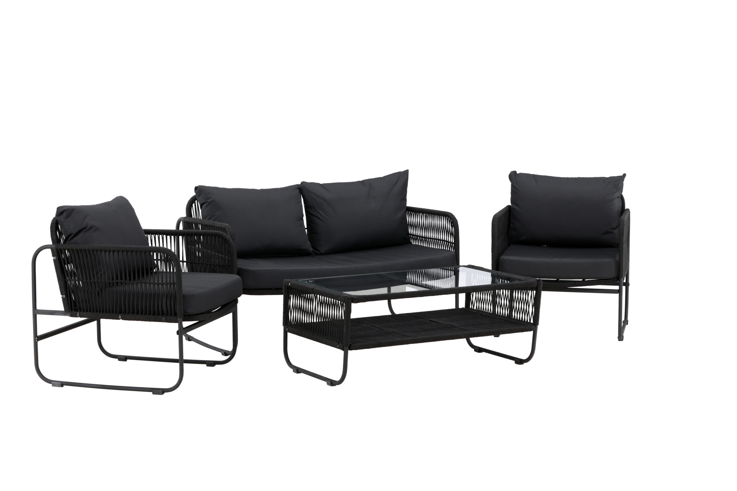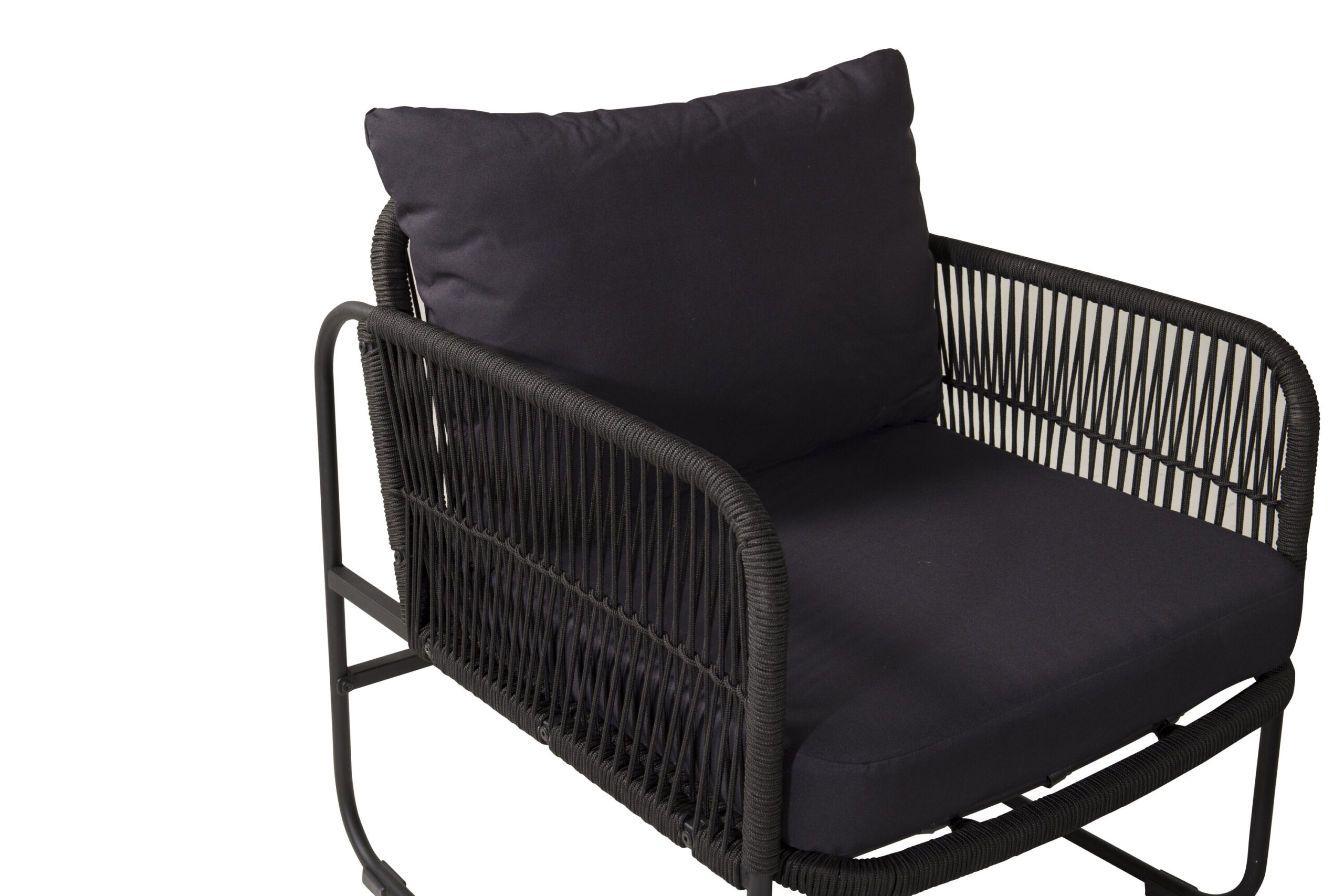 Tulge koju Utah’ sarja hubasesse salongigruppi! See mõnus moodsa disainiga lounge grupp koosneb kaheistmelisest diivanist, kahest musta pulbervärvitud metallist raamiga tugitoolist, mille seljatugi ja küljed on kujundatud musta köiega, ning ristkülikukujulisest madalast kohvilauast reljeefse riiuliga ning klaasist ja mustast trossdetailidest lauaplaadist. Pehmed musta värvi padjad on diivanigrupi komplektis! Lase end inspireerida trendikast disainist ja naudi hilissuveõhtuid mugavas lounge-grupis!