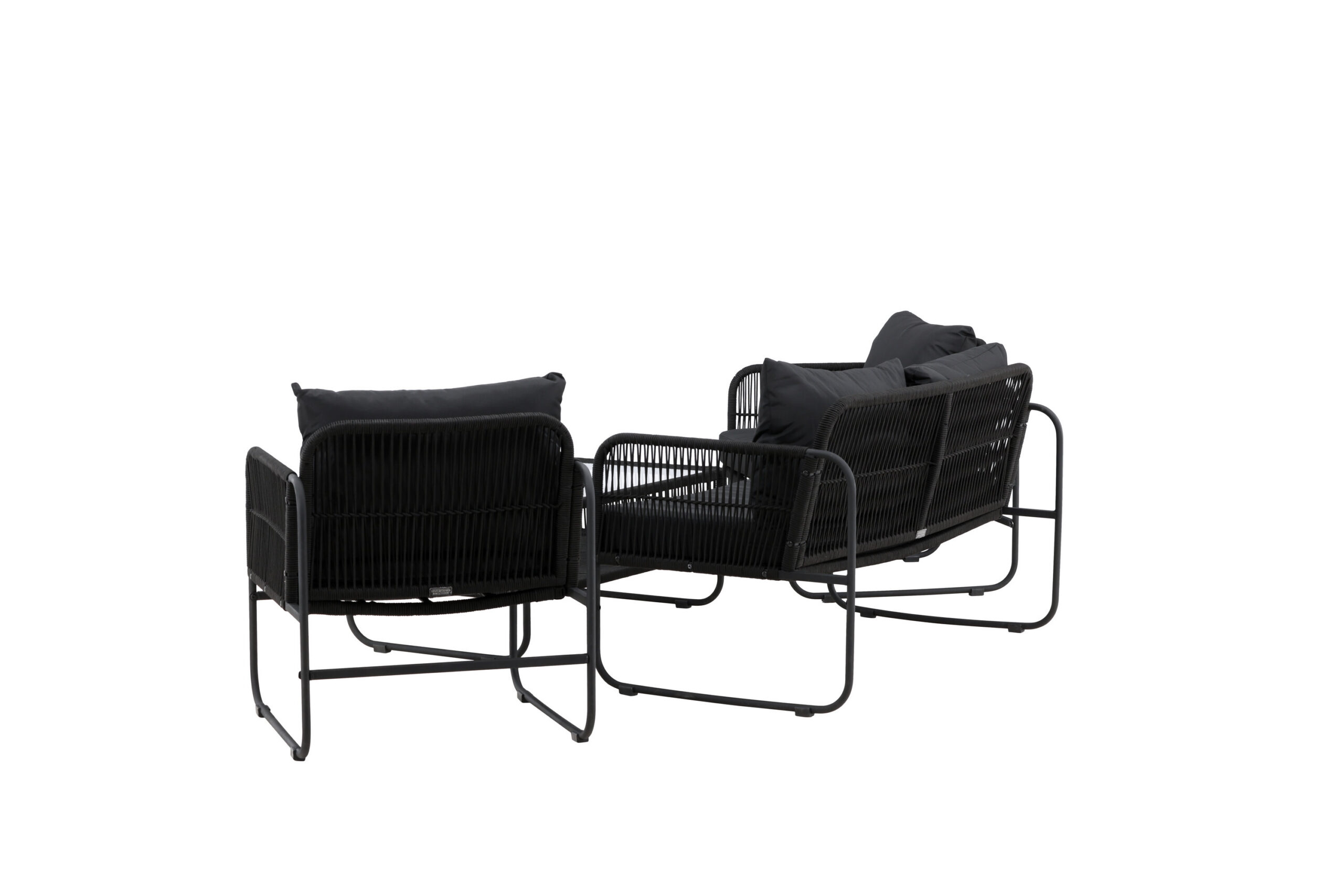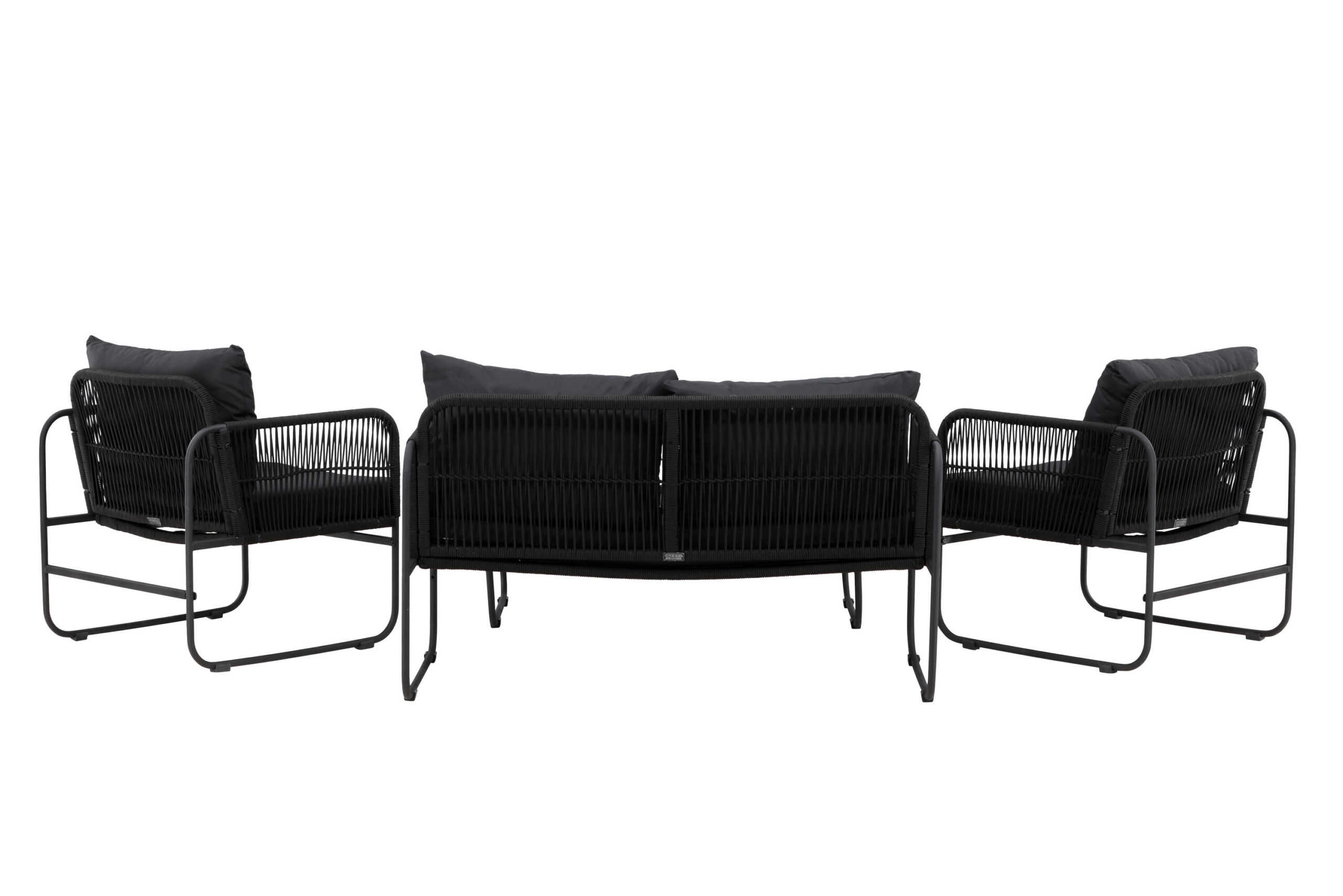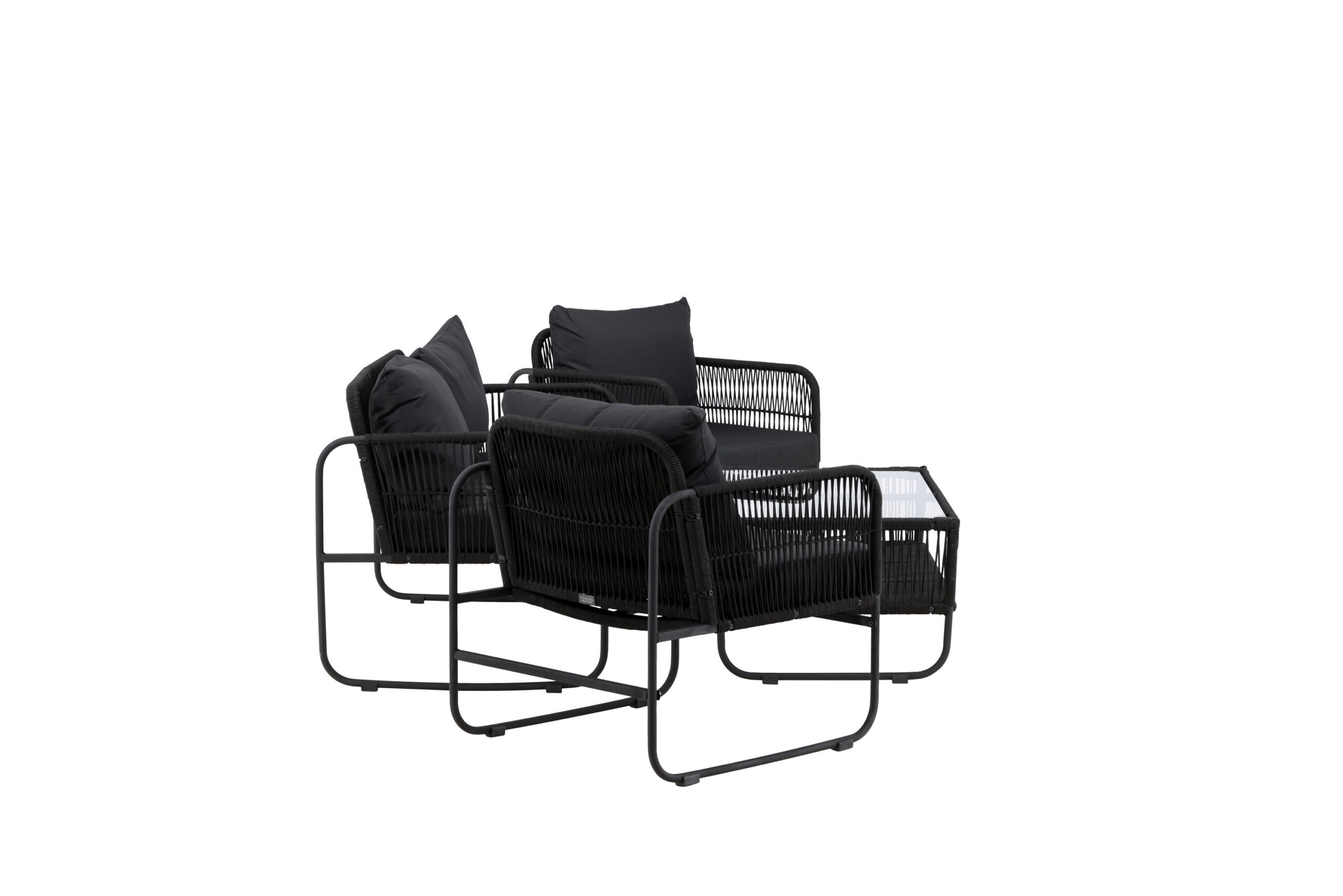 Tulge koju Utah’ sarja hubasesse salongigruppi! See mõnus moodsa disainiga lounge grupp koosneb kaheistmelisest diivanist, kahest musta pulbervärvitud metallist raamiga tugitoolist, mille seljatugi ja küljed on kujundatud musta köiega, ning ristkülikukujulisest madalast kohvilauast reljeefse riiuliga ning klaasist ja mustast trossdetailidest lauaplaadist. Pehmed musta värvi padjad on diivanigrupi komplektis! Lase end inspireerida trendikast disainist ja naudi hilissuveõhtuid mugavas lounge-grupis!