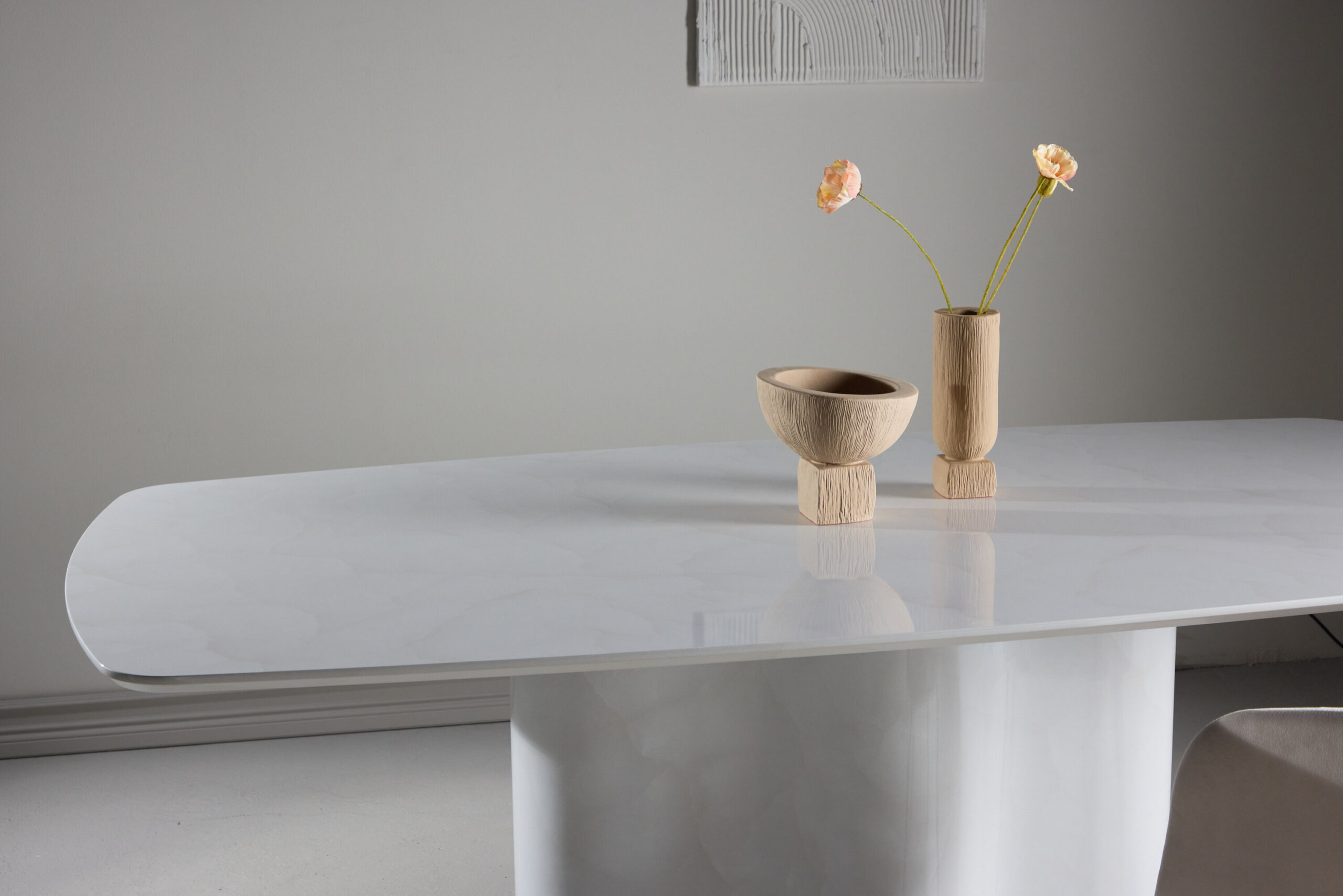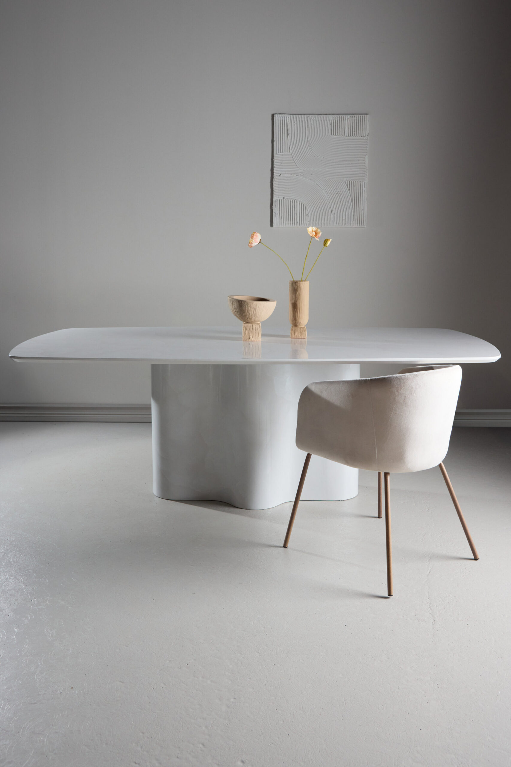 Tsentreeritud lauajalg pakub mitte ainult ainulaadset visuaalset tasakaalu, vaid ka täiendavat jalaruumi ja paindlikkust mööbli paigutamisel. Valge värv lisab ereda ja õhulise tunde, täiustab ruumi ja loob tervitatava atmosfääri.