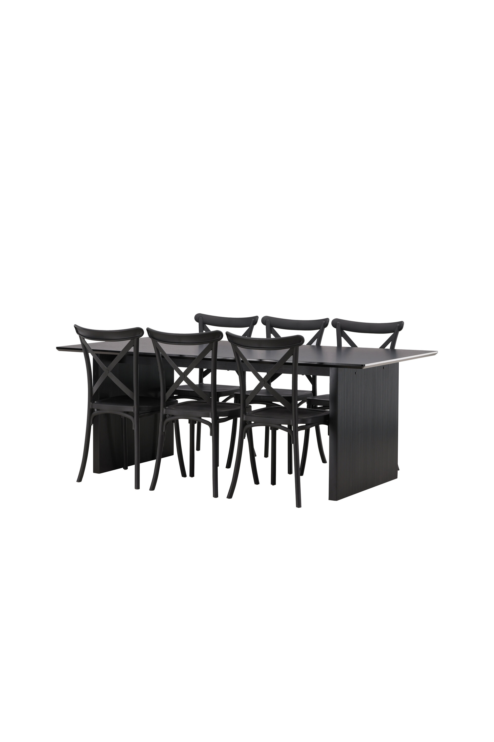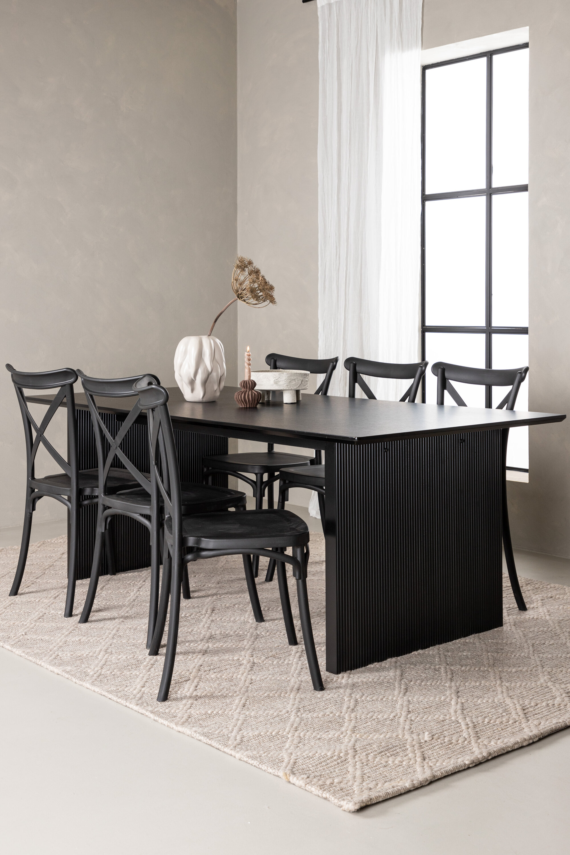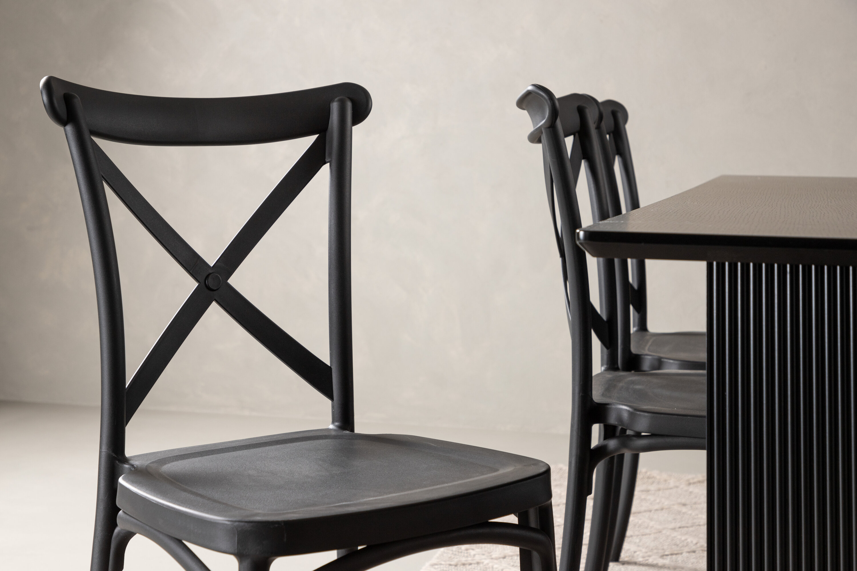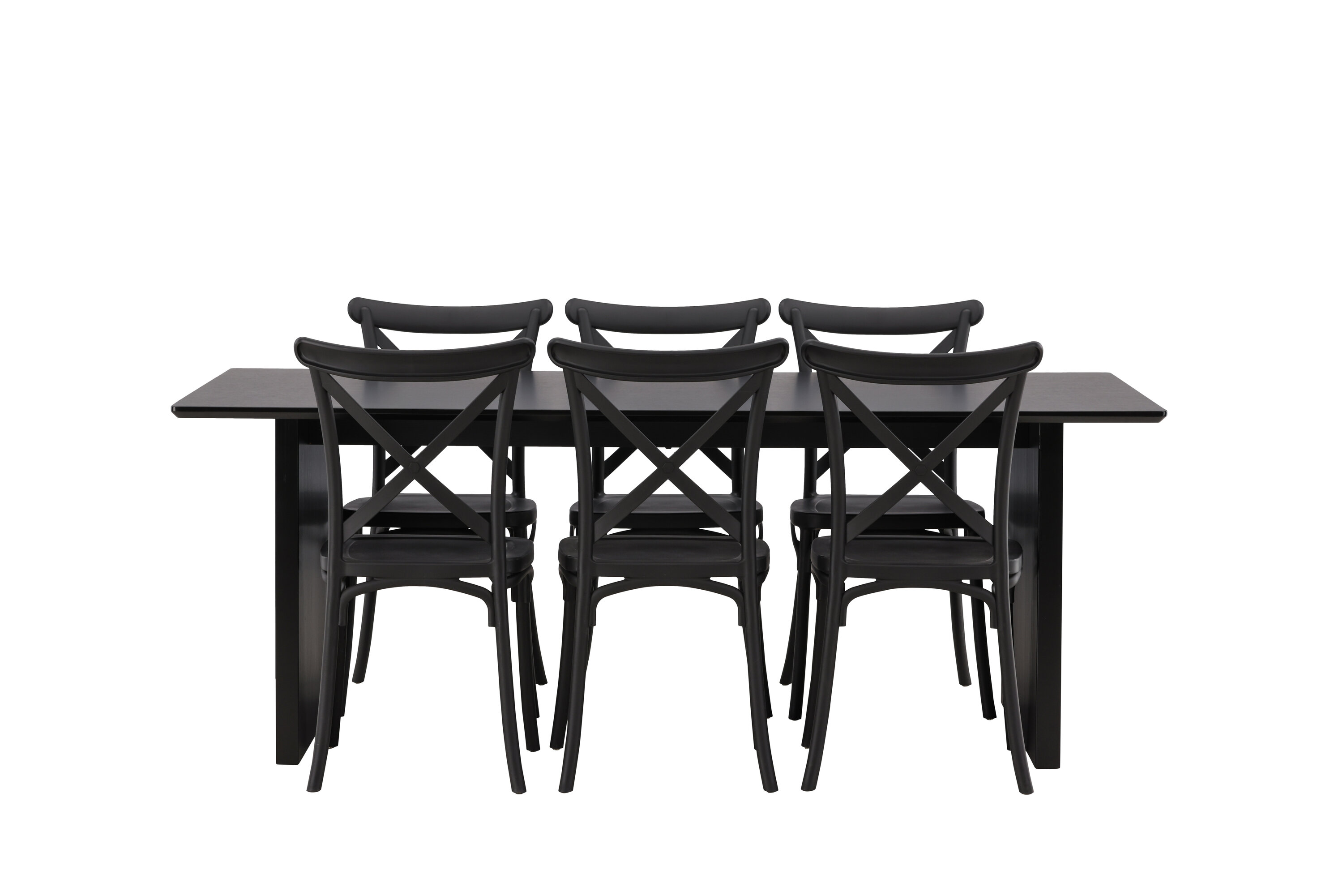 Siin on ühendatud klassikaline disain ja kaasaegsed vormid! Meie Vail-sarja ristkülikukujuline söögilaud on sirgete põhjamaiste vormidega ja valmistatud vastupidavast tahmast musta värvi MDF-ist. Lauaplaat on õhuke ja balansseerub kahel tugeval puitlaual, mis moodustavad veermiku – nii korralik kui ka vastupidav. Siin koos Crosetti sarja söögitoolidega. Toolid on nostalgilise disainiga ristatud seljatoe ja sirgete joontega, järjepidevalt mustast plastikust. Siit saad stiilse söögigrupi, kellega oma kodu sisustada!
