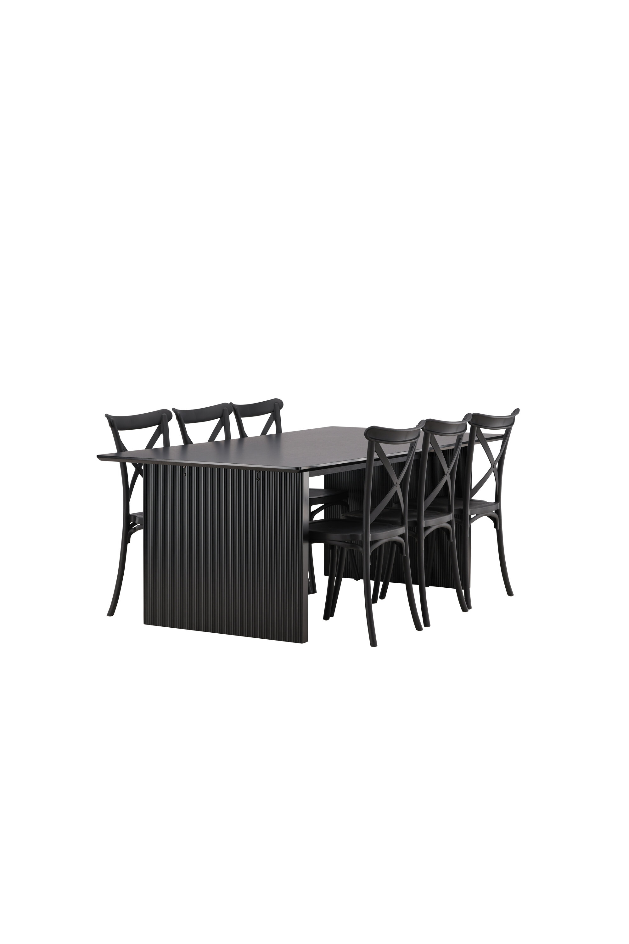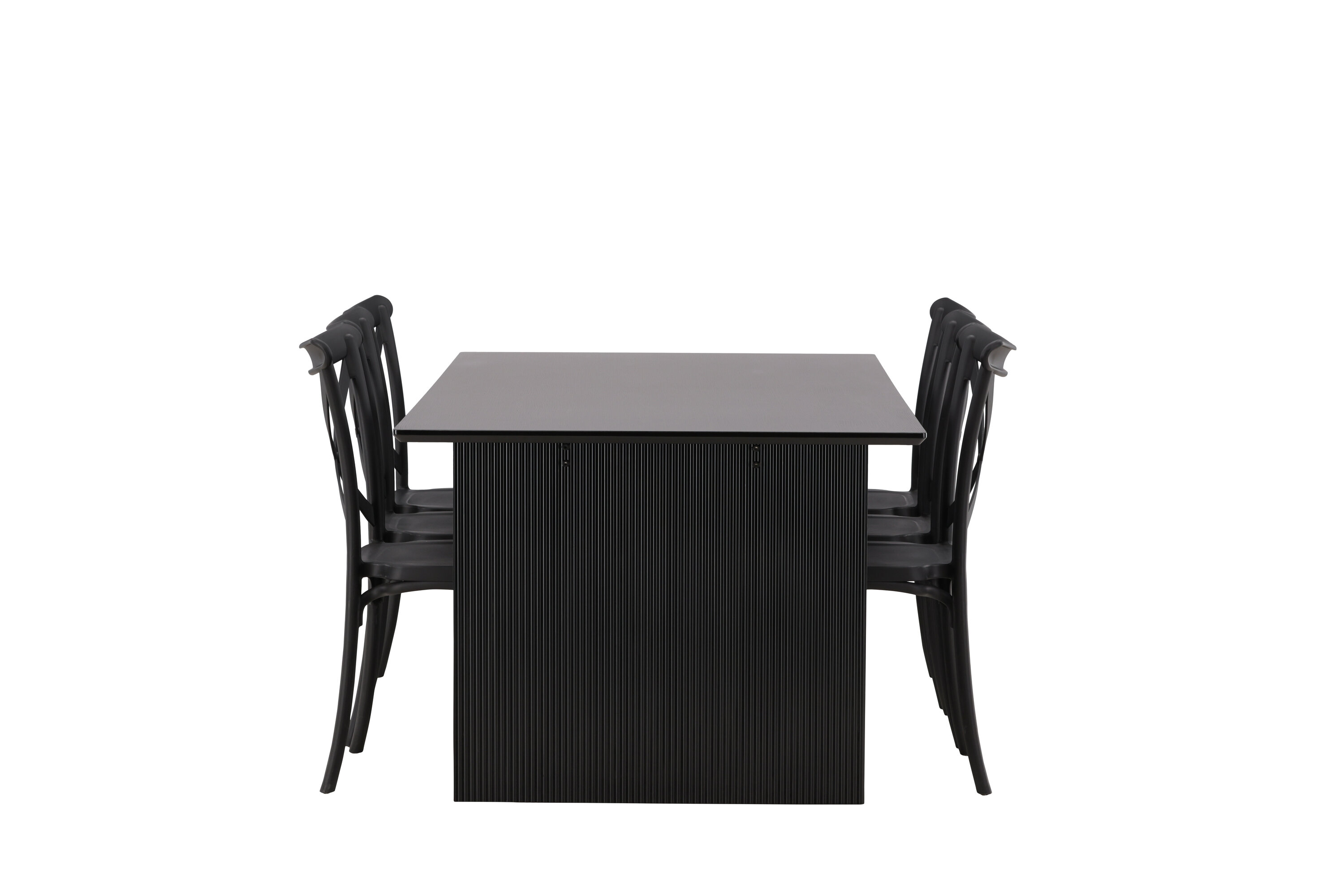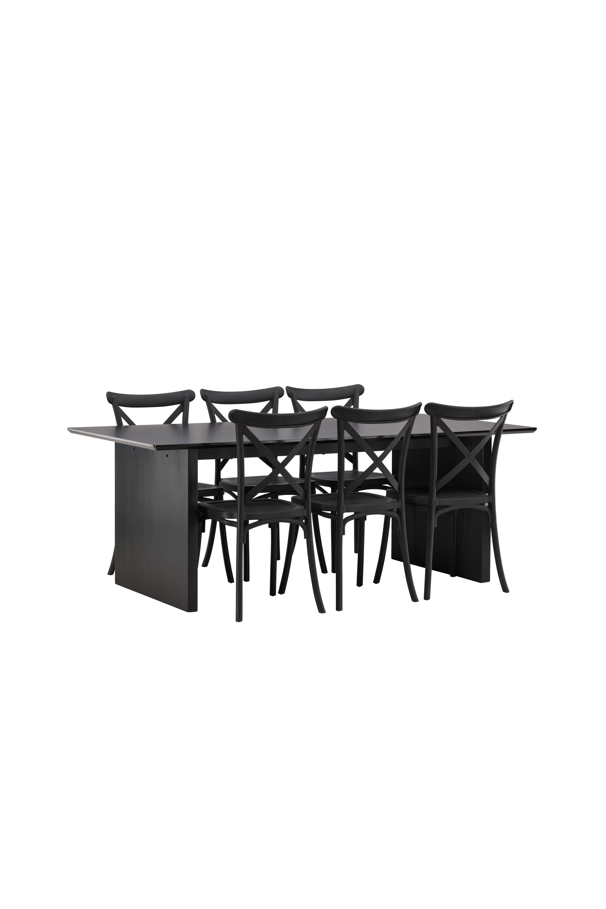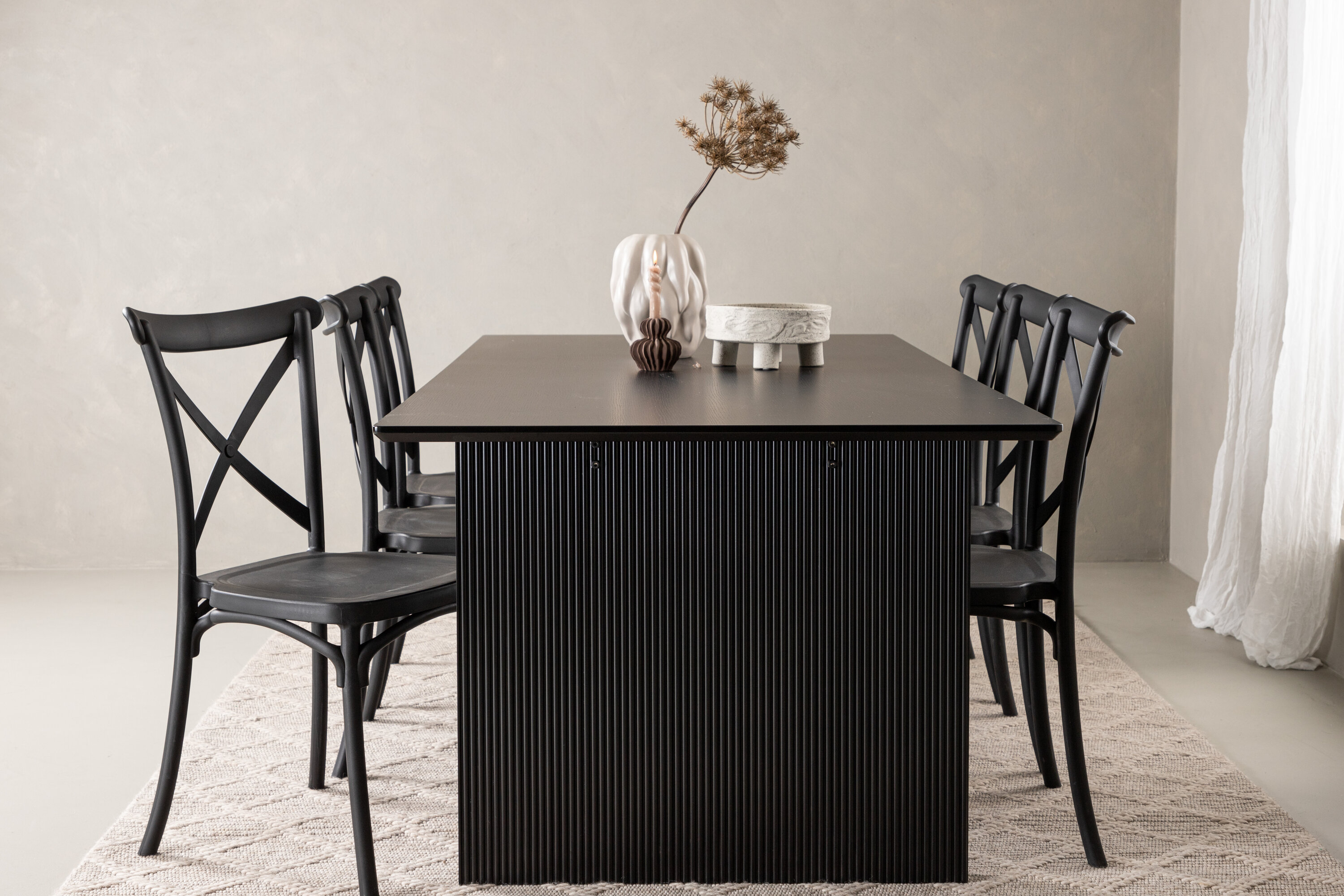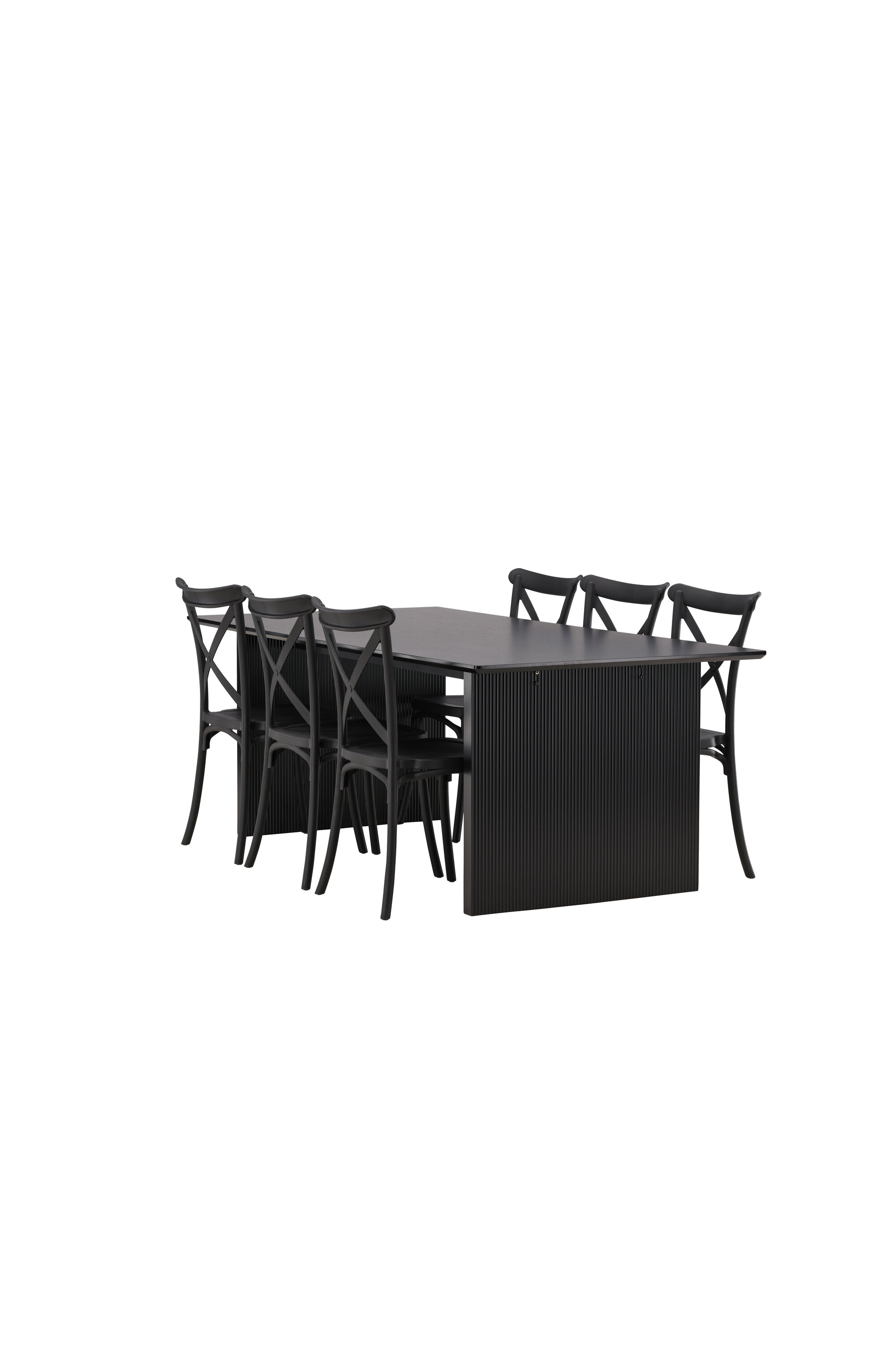 Siin on ühendatud klassikaline disain ja kaasaegsed vormid! Meie Vail-sarja ristkülikukujuline söögilaud on sirgete põhjamaiste vormidega ja valmistatud vastupidavast tahmast musta värvi MDF-ist. Lauaplaat on õhuke ja balansseerub kahel tugeval puitlaual, mis moodustavad veermiku – nii korralik kui ka vastupidav. Siin koos Crosetti sarja söögitoolidega. Toolid on nostalgilise disainiga ristatud seljatoe ja sirgete joontega, järjepidevalt mustast plastikust. Siit saad stiilse söögigrupi, kellega oma kodu sisustada!
