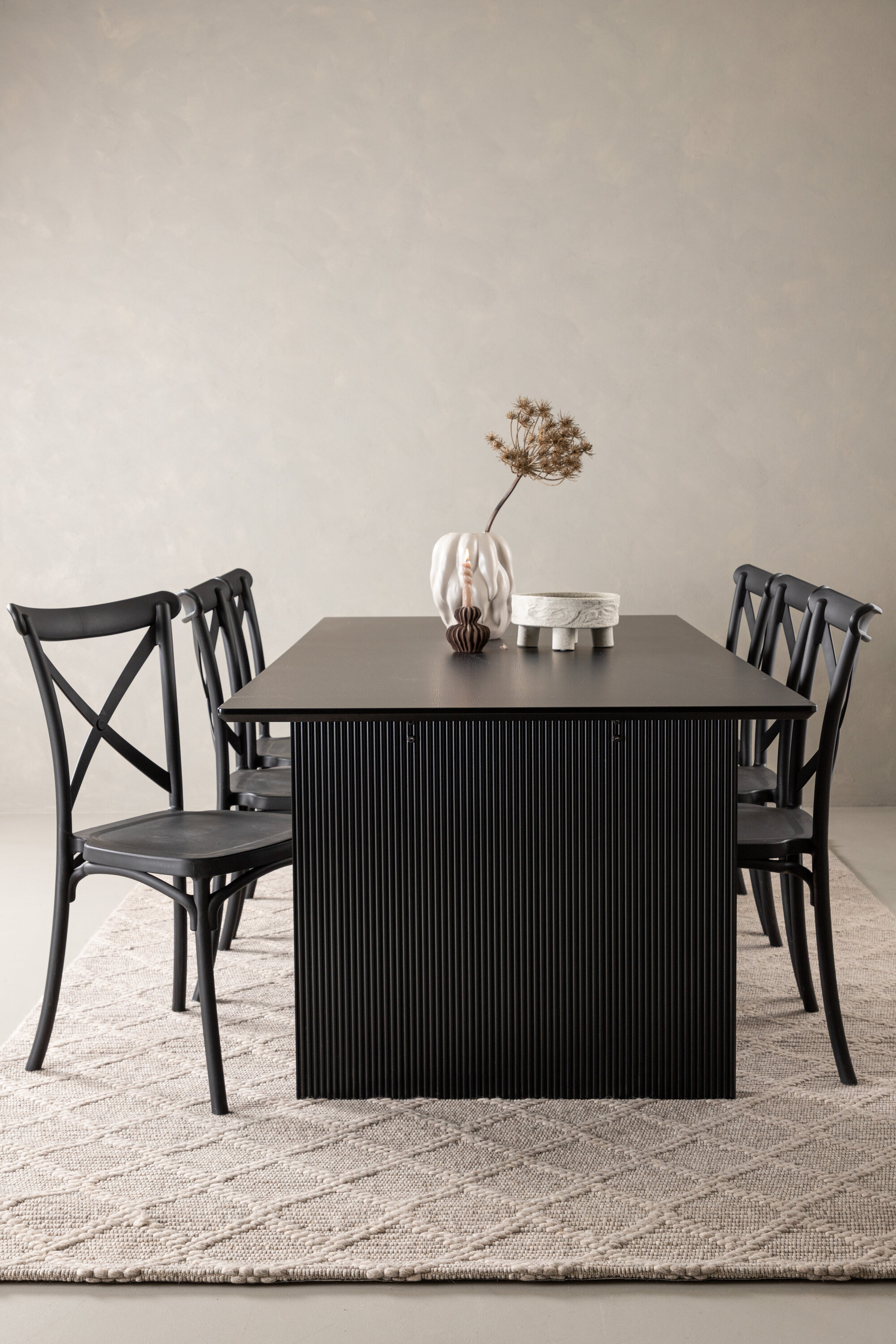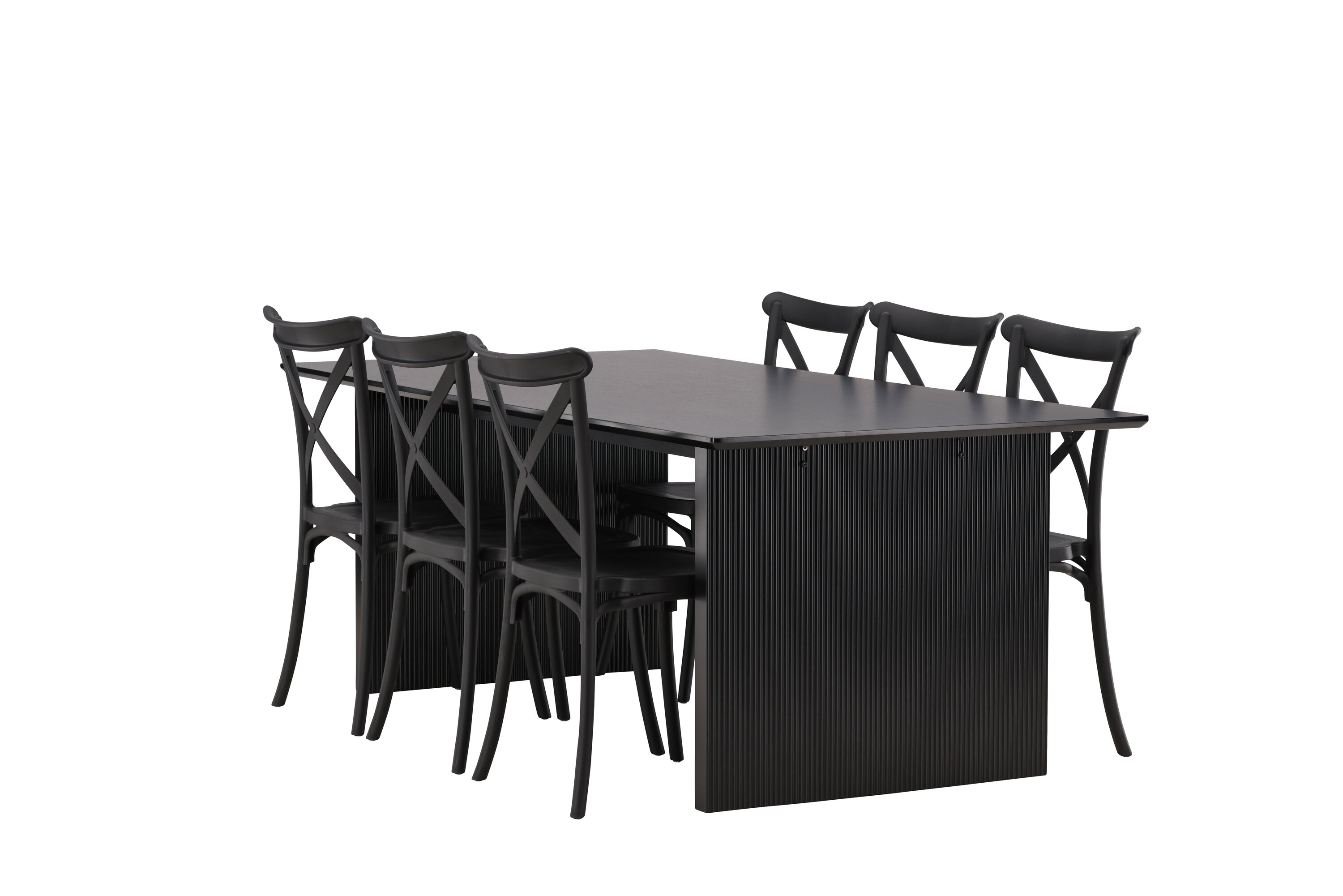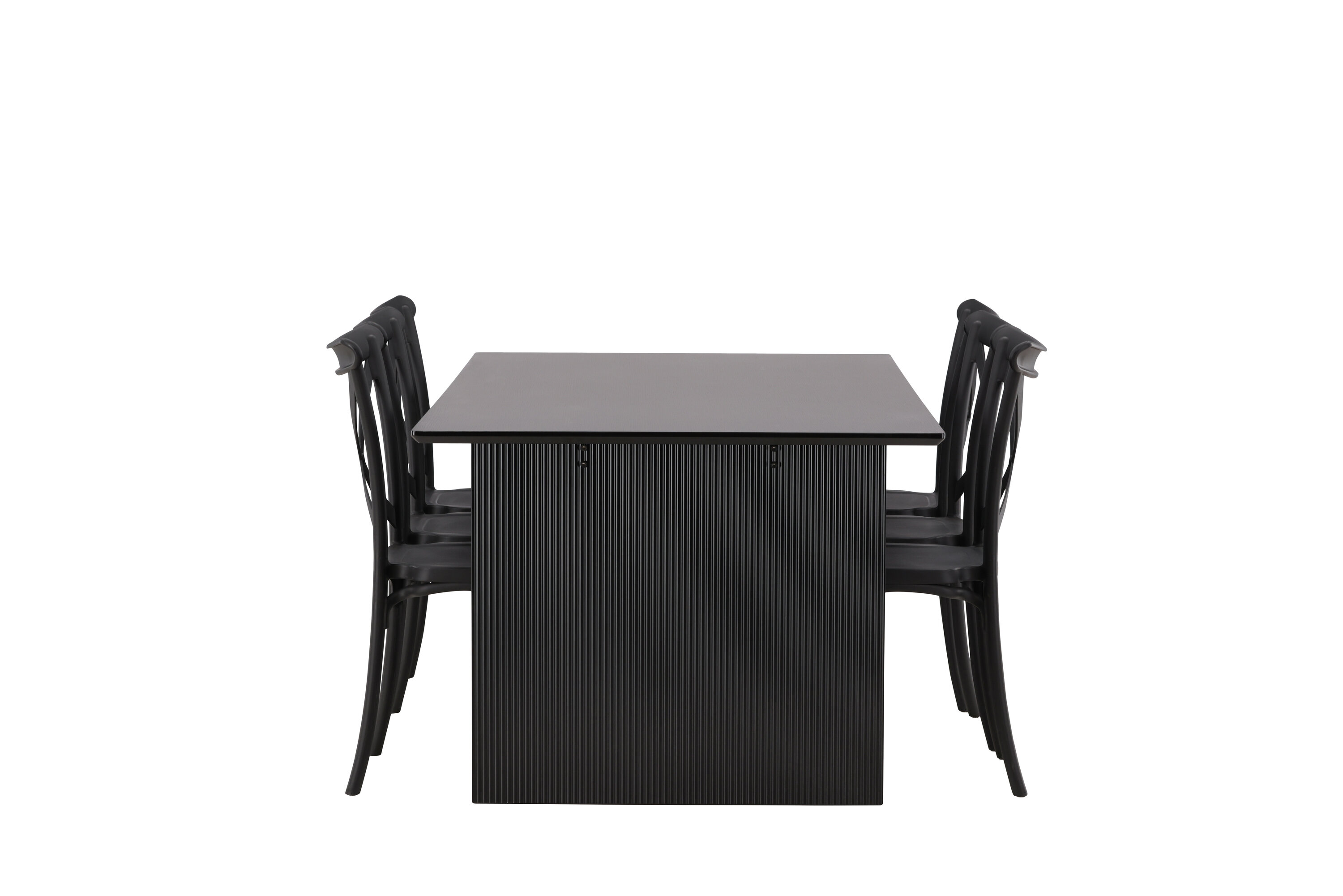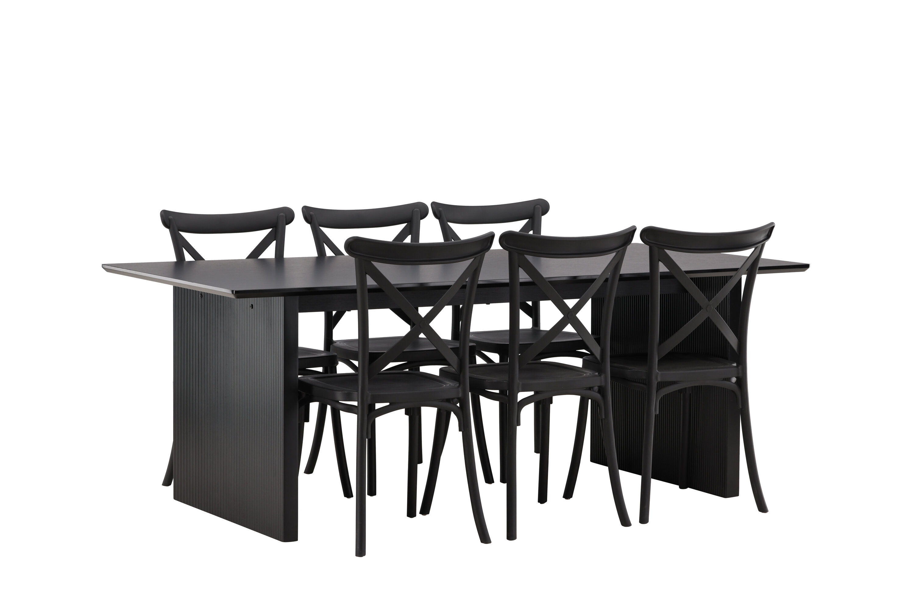 Siin on ühendatud klassikaline disain ja kaasaegsed vormid! Meie Vail-sarja ristkülikukujuline söögilaud on sirgete põhjamaiste vormidega ja valmistatud vastupidavast tahmast musta värvi MDF-ist. Lauaplaat on õhuke ja balansseerub kahel tugeval puitlaual, mis moodustavad veermiku – nii korralik kui ka vastupidav. Siin koos Crosetti sarja söögitoolidega. Toolid on nostalgilise disainiga ristatud seljatoe ja sirgete joontega, järjepidevalt mustast plastikust. Siit saad stiilse söögigrupi, kellega oma kodu sisustada!