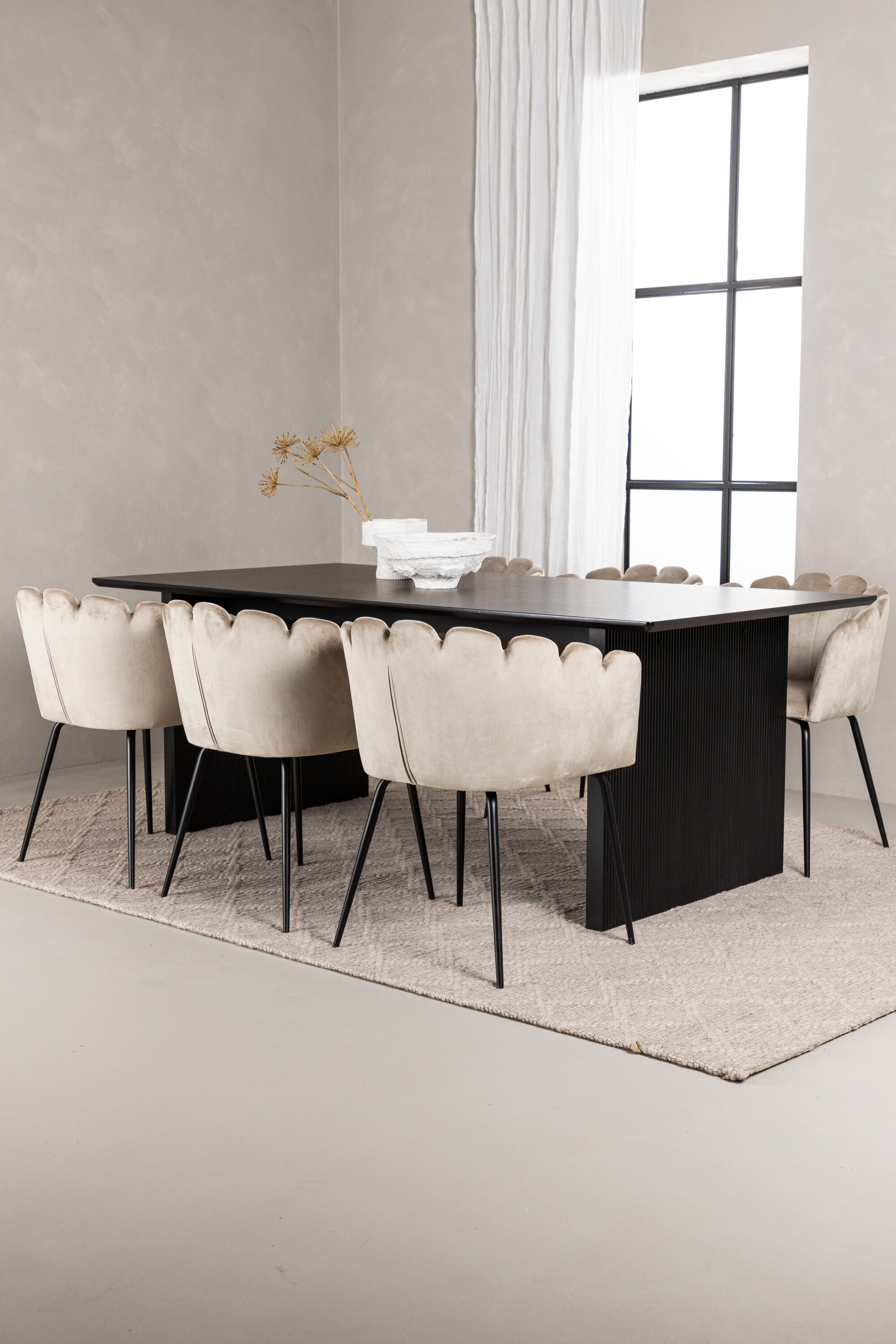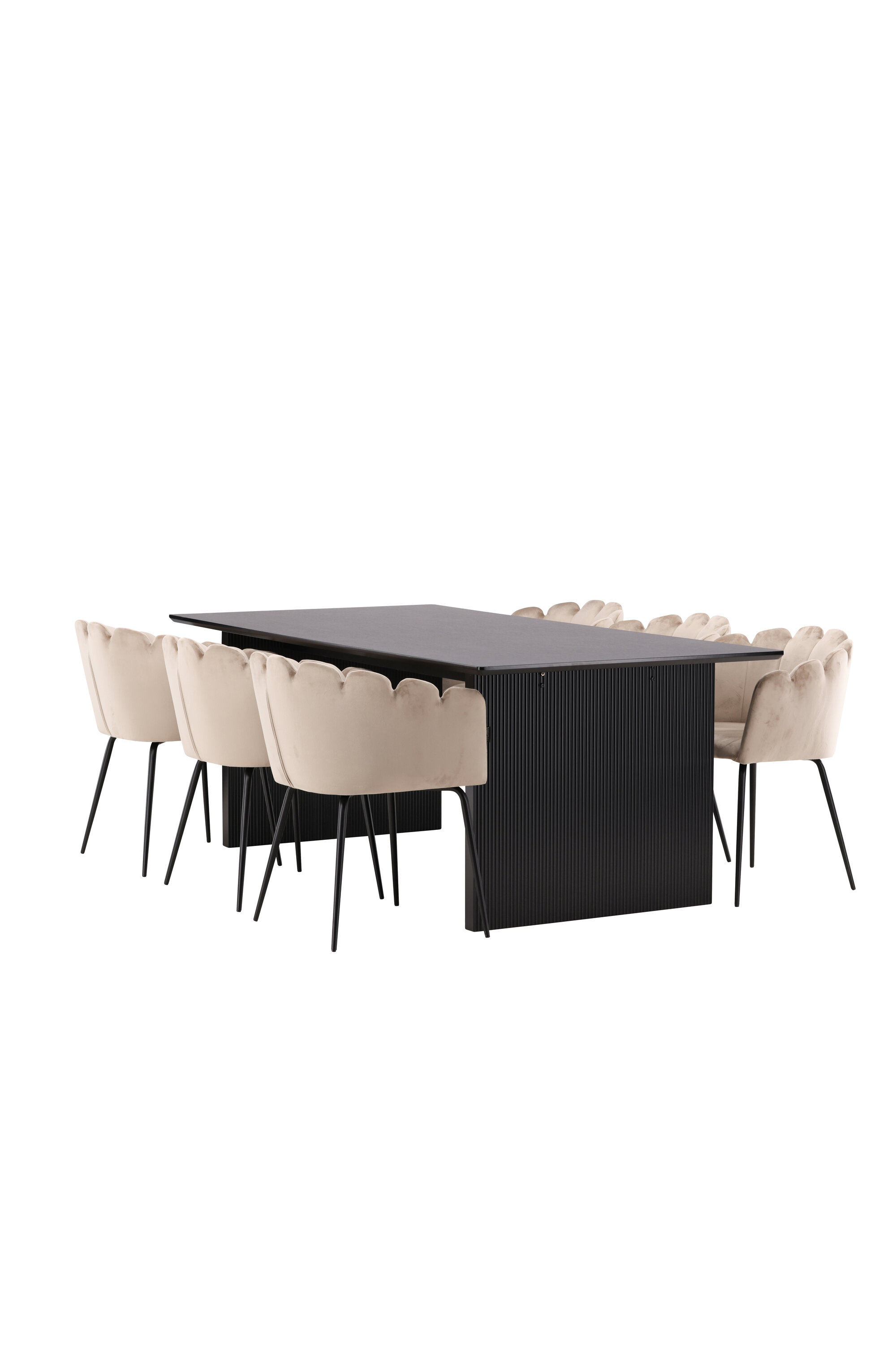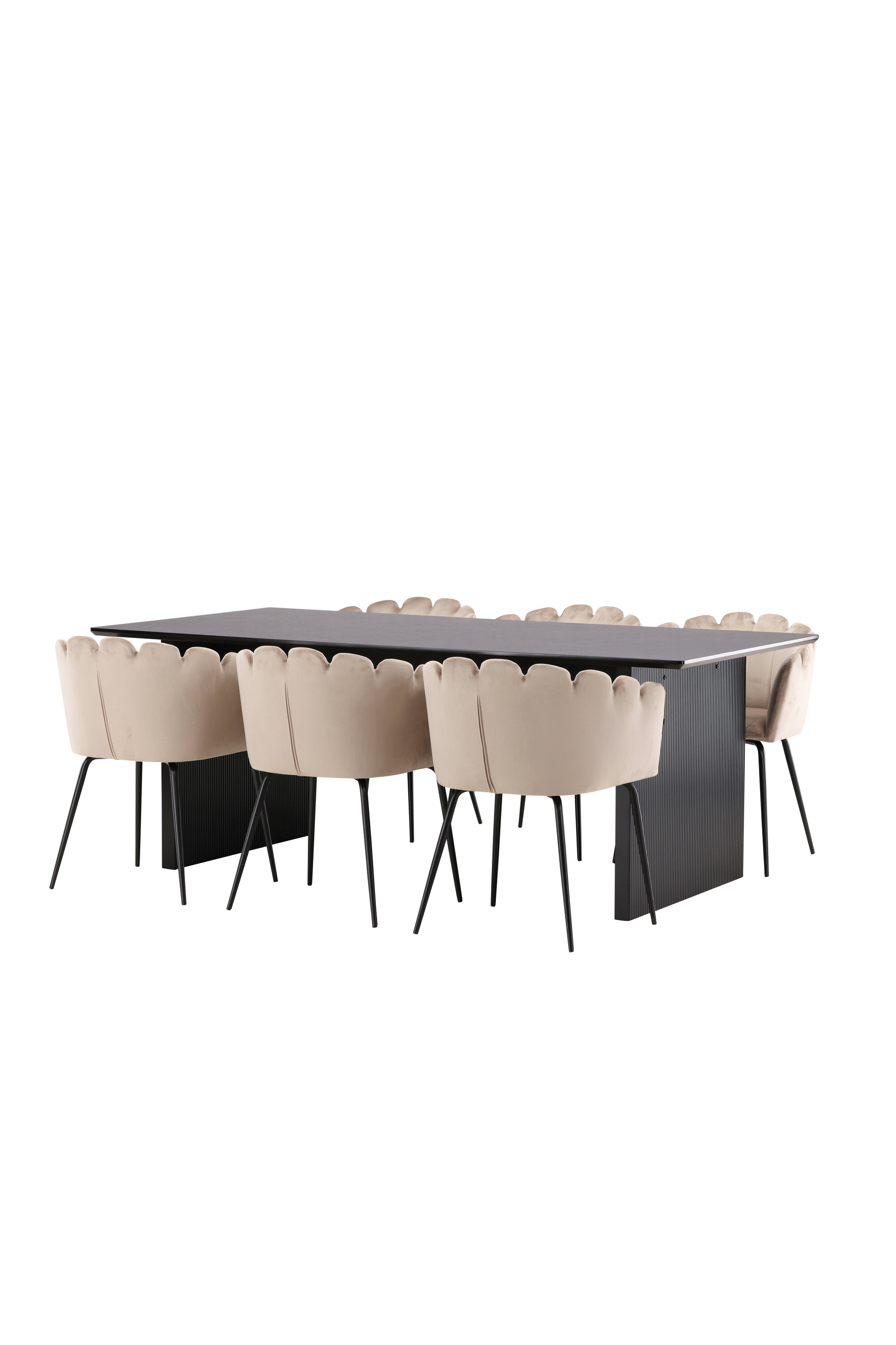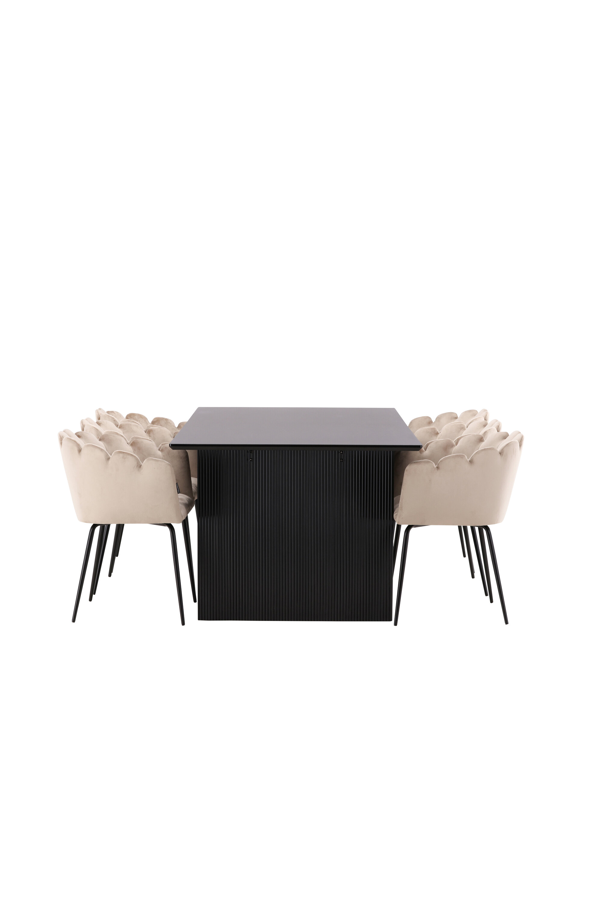 Sisusta oma kodu süda võluvalt ja kutsuvalt! Meie Vail-sarja ristkülikukujuline söögilaud on sirgete põhjamaiste vormidega ja valmistatud vastupidavast tahmast musta värvi MDF-ist. Lauaplaat on õhuke ja balansseerub kahel tugeval puitlaual, mis moodustavad veermiku – nii korralik kui ka vastupidav. Siin koos Limhamni seeria söögitoolidega luksuslikus beežis toonis. Tool on oma kutsuva disaini, dekoratiivse kestakujulise dekoratiivõmblustega seljatoe ja ümara istmega maitsekast beežist sametkangast moodne lemmik paljudes majapidamistes. Jalad on musta pulbervärvitud metallist. Istuge, istuge mugavalt ja nautige!