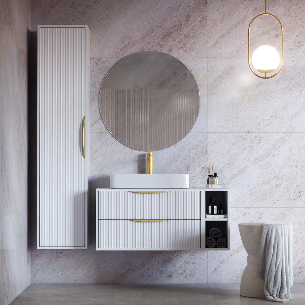 ANVERS vannitoakapp on erakordne mööbliese mis lisab teie vannituppa kahtlemata elegantsi. Selle valge konstruktsioon sobib mitmesuguste sisustusstiilidega muutes selle ideaalseks täienduseks igale paigutusele. Intrigeerivad detailid nagu soonikkoes esikülg ja harjatud kuldne käepide annavad mööbliesemele erilise iseloomu mis täiustab kogu ruumi. ANVERS kapil on viis praktilist riiulit mis sobivad ideaalselt kõigi teie oluliste aksessuaaride hoidmiseks aidates hoida teie vannituba korras ja organiseerituna. Selle seinale kinnitatav disain lisab modernse hõngu ja muudab puhastamise lihtsamaks. Viimistlus: valge (RAL9016) Dekoratiivne soonikkoes esikülg Harjatud kuldne käepide Viis praktilist riiulit Pehmelt sulguvad hinged Universaalne uksekinnitus (parem/vasak) Mõõtmed: Kõrgus: 170 cm Laius: 38 cm Sügavus: 33 cm