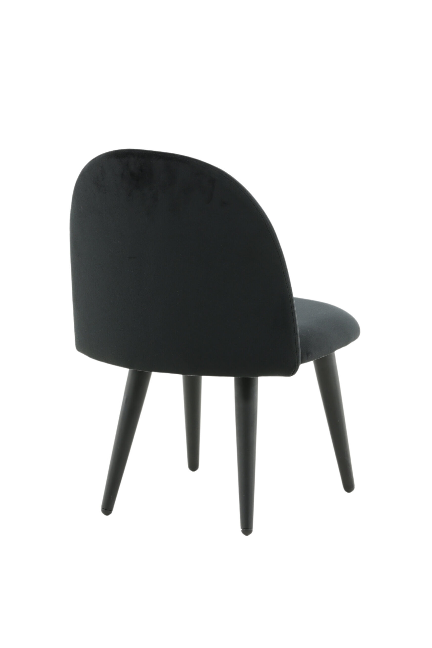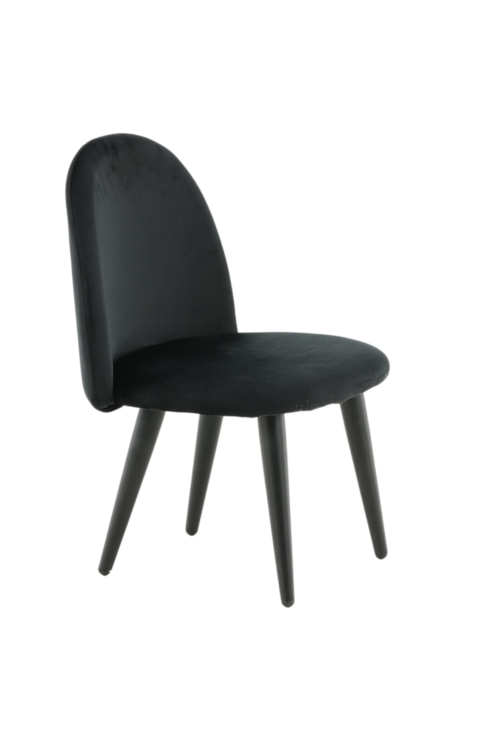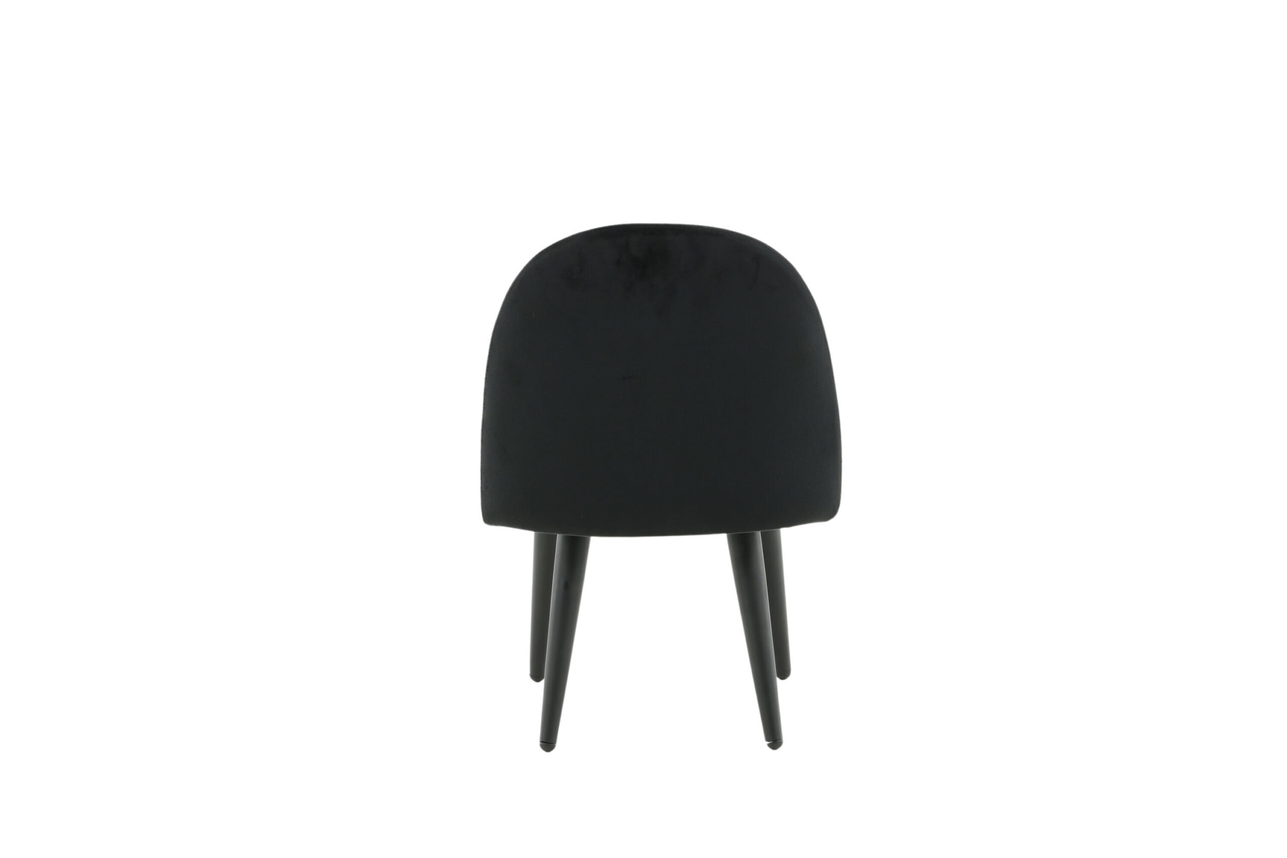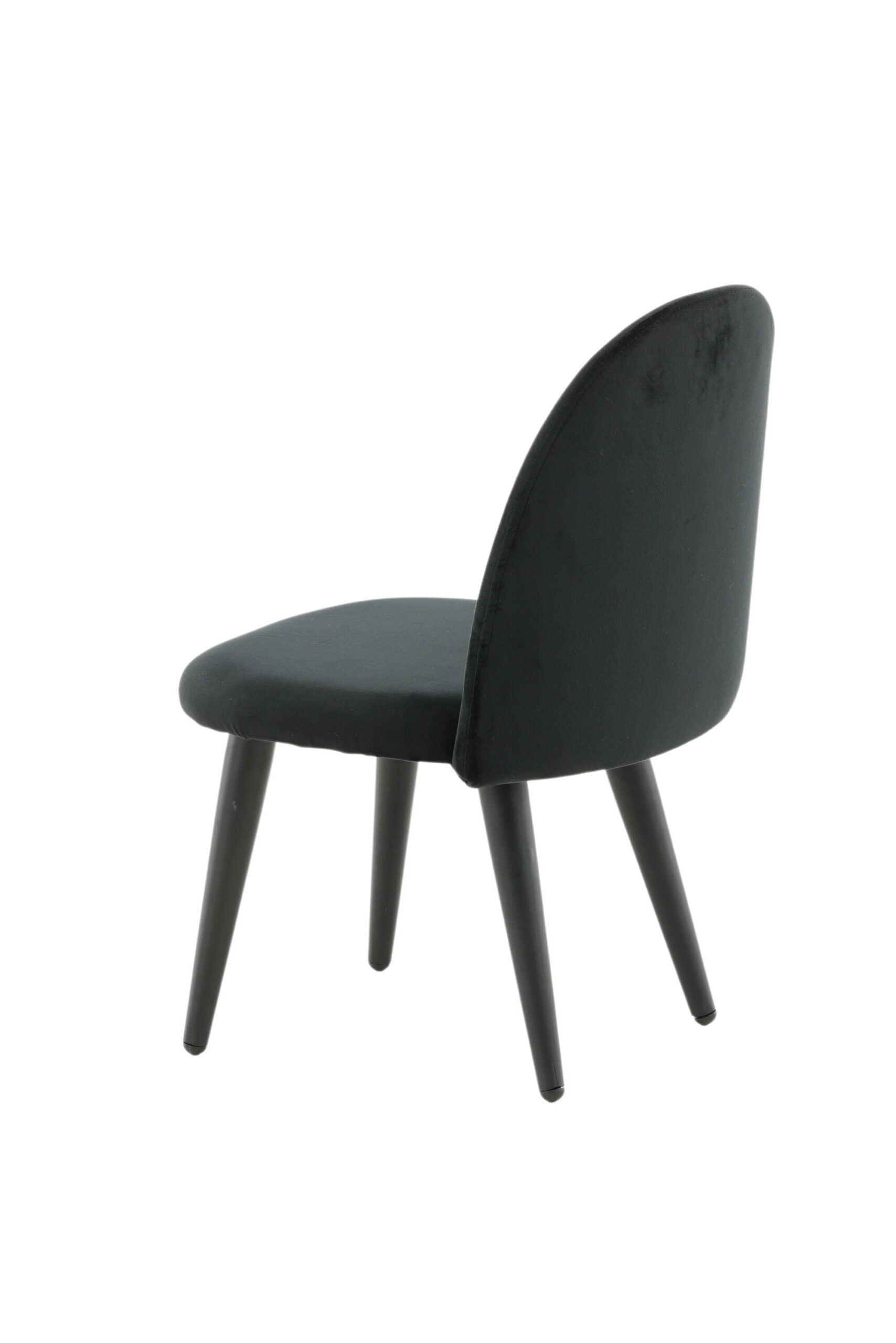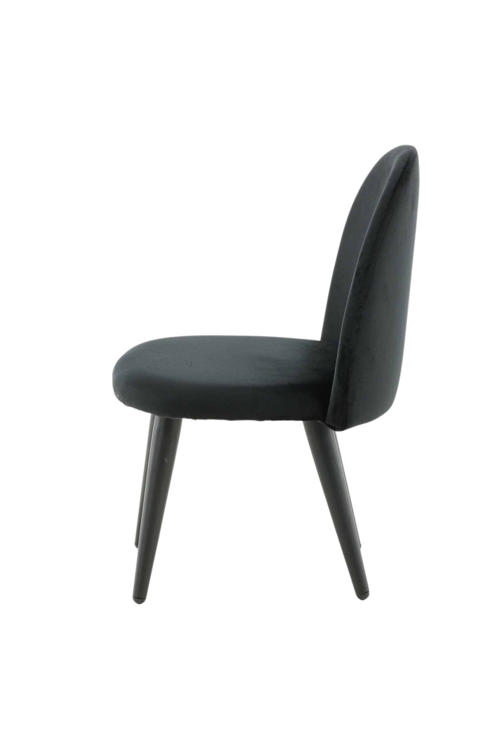 Täielikult polsterdatud disainiga söögitool lastele, mille jalad on valge pulbervärvitud metallist ning pehmelt ümardatud seljatugi ja iste polsterdatud mustast sametkangast. Vajalik kokkupanek.