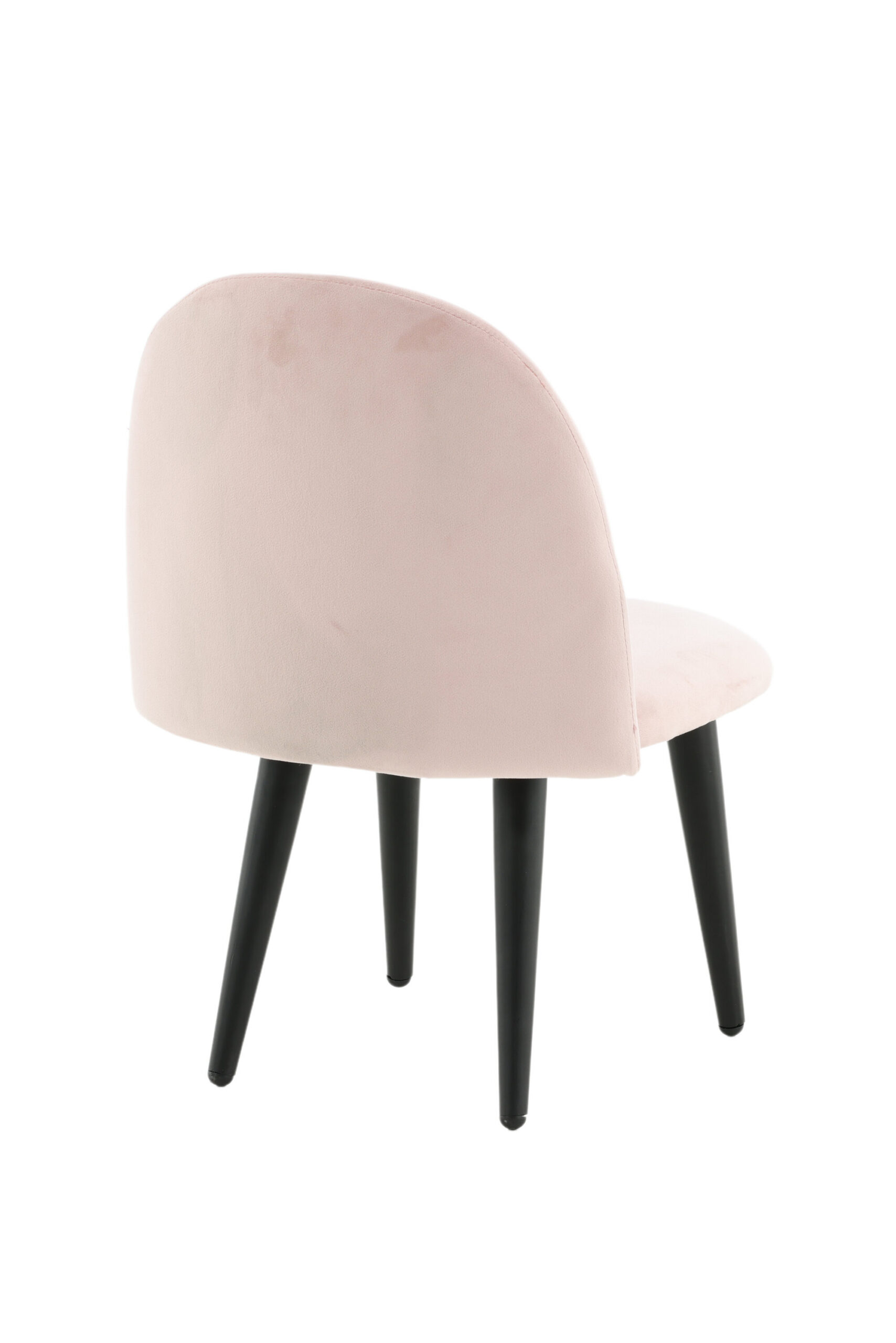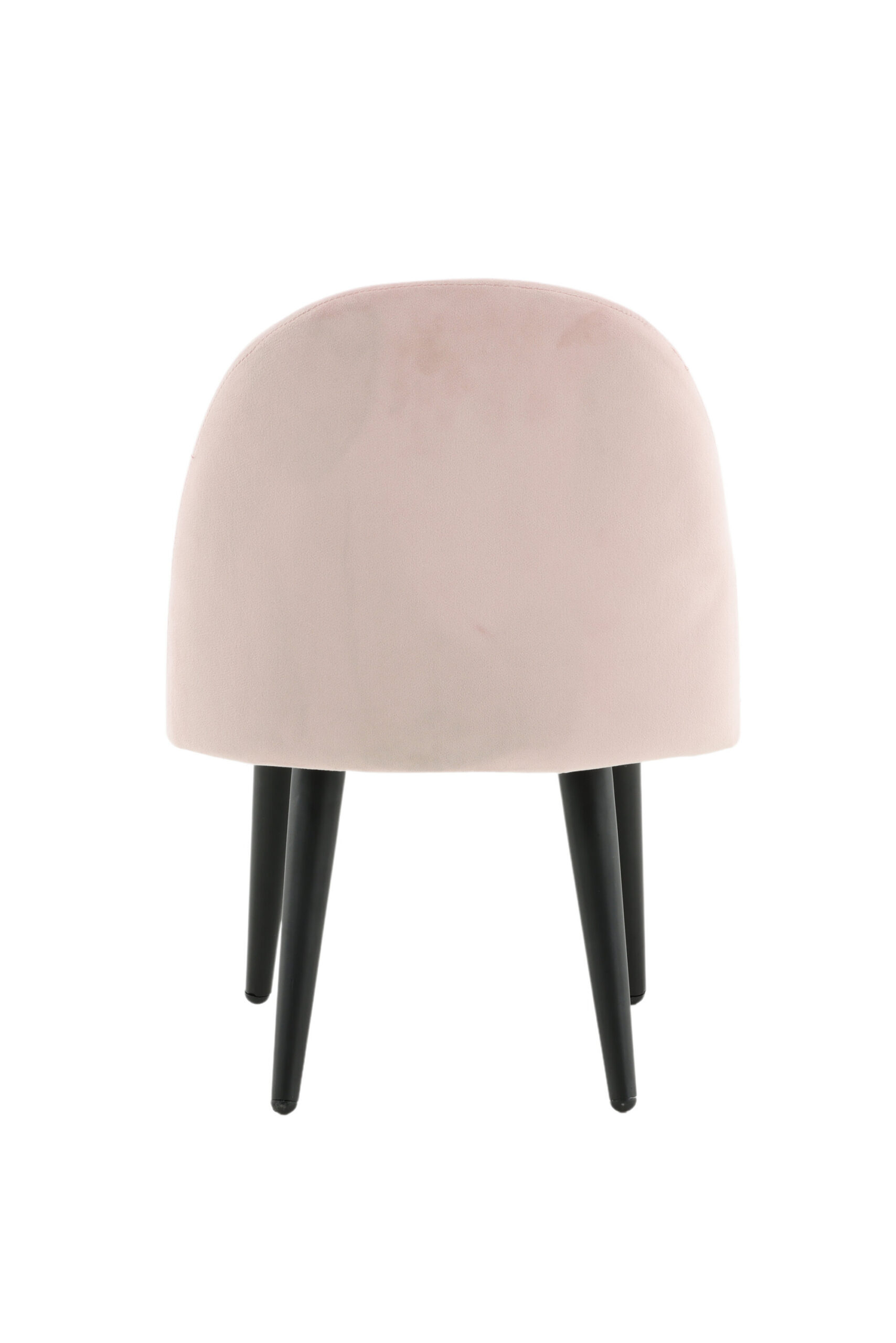 Täielikult riietatud laste söögitool, valge pulbervärvitud metallist jalad ning kergelt ümardatud seljatugi ja iste polsterdatud roosast sametkangast. Vajalik on kergem montaaž.