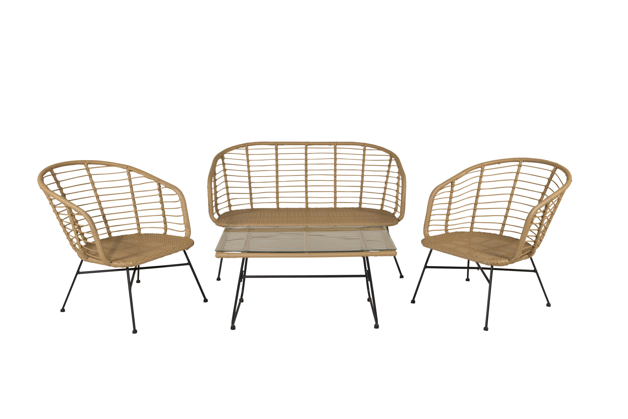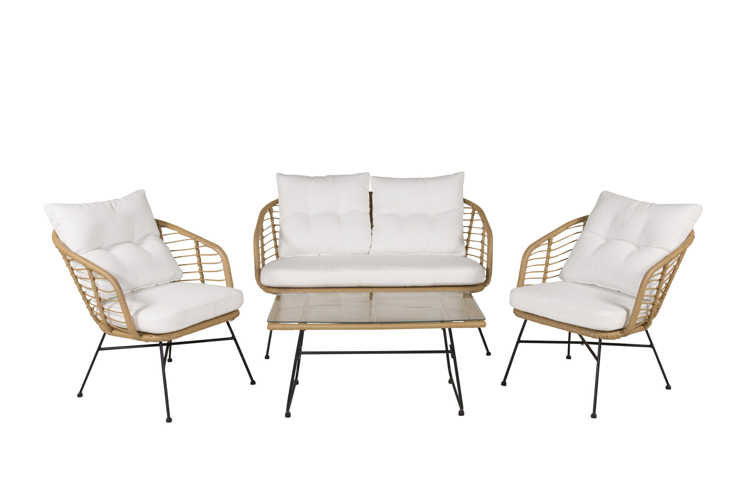 Stiilne ilus moodsa disainiga diivanirühm, mis sobib ideaalselt klaasitud siseõuele. Mööbligrupp koosneb kahekohalisest diivanist, kahest karkassiga tugitoolist, mis on tehtud ilusas raamiasendis musta pulbervärvitud metallist ning seljatugi ja iste on kujundatud stiilse päris kena looduskuninganna mustriga. Kaasa arvatud valged padjad ja kohvilaud koos Wickeri detailidega ja klaasist lauaplaat. Kaunista terrass koos lounge-grupiga, mis pikendab garanteeritult hilissuveõhtuid koos lähedastega!