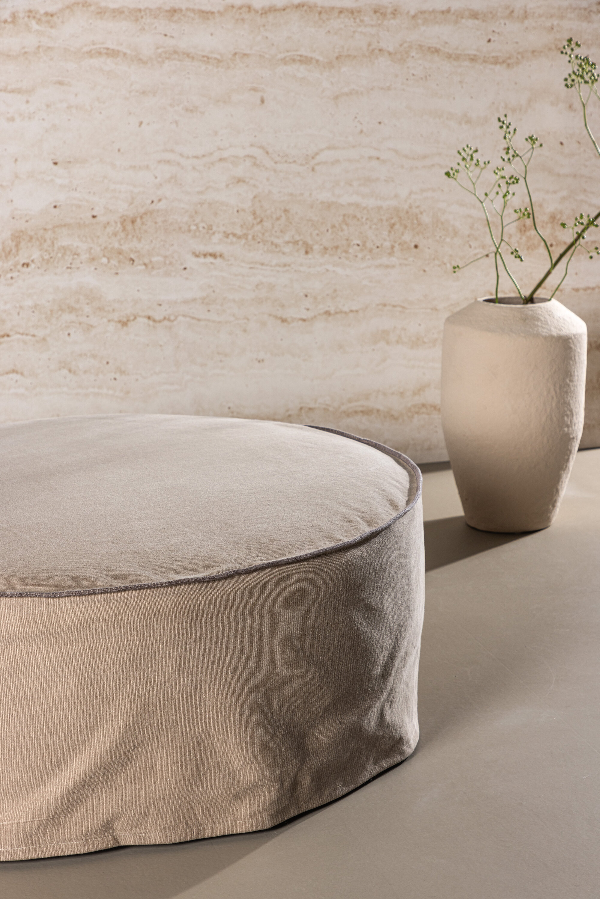 Meie Vindö Ottoman on polsterdatud elegantse sooja pruuni tooni linase kangaga, mis pakub peent ja kutsuvat tunnet. Selle ümar kuju ja muljetavaldav läbimõõt 101 cm muudavad selle keskseks elemendiks teie elutoas või igas ruumis, kus vajate lisamugavust ja stiili.